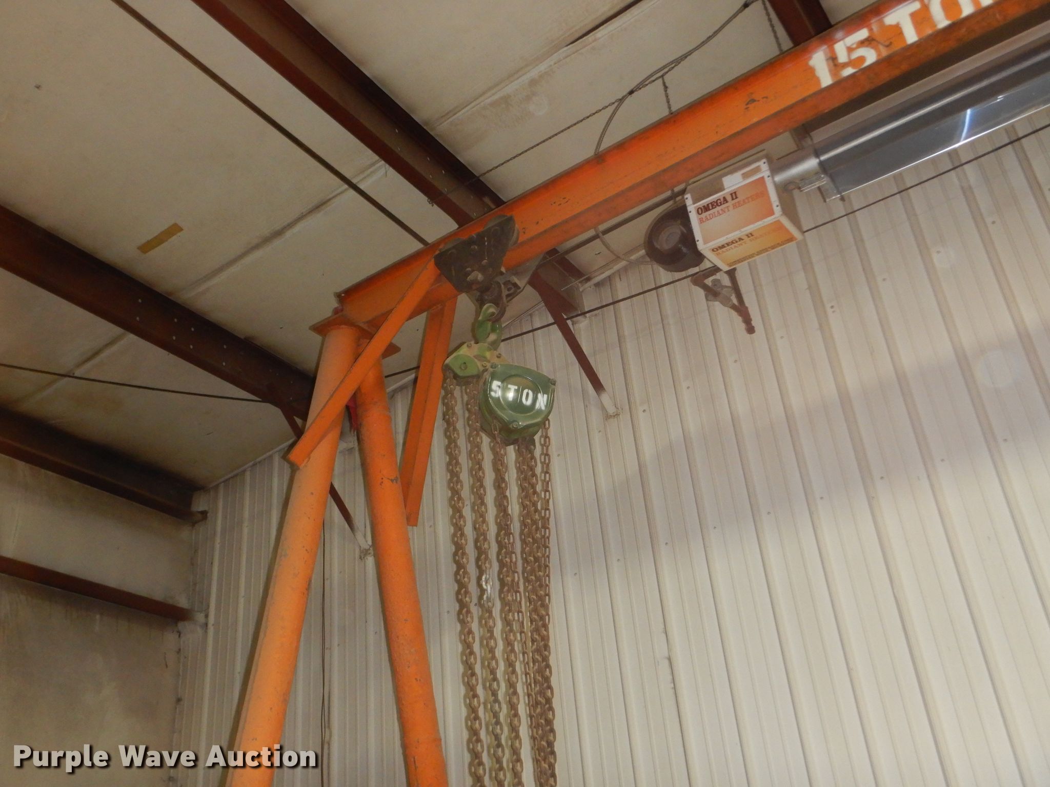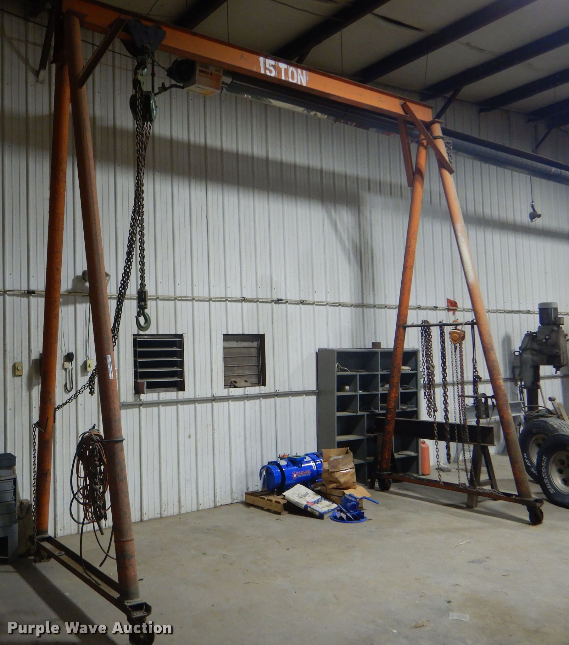 Purple Wave is selling a used Tools in Kansas. This item is a A-frame hoist with the following: 14'W x 6.5'D x 14'3"H, 15 ton frame capacity, Five ton chain hoist, 1/2 ton chain hoist
