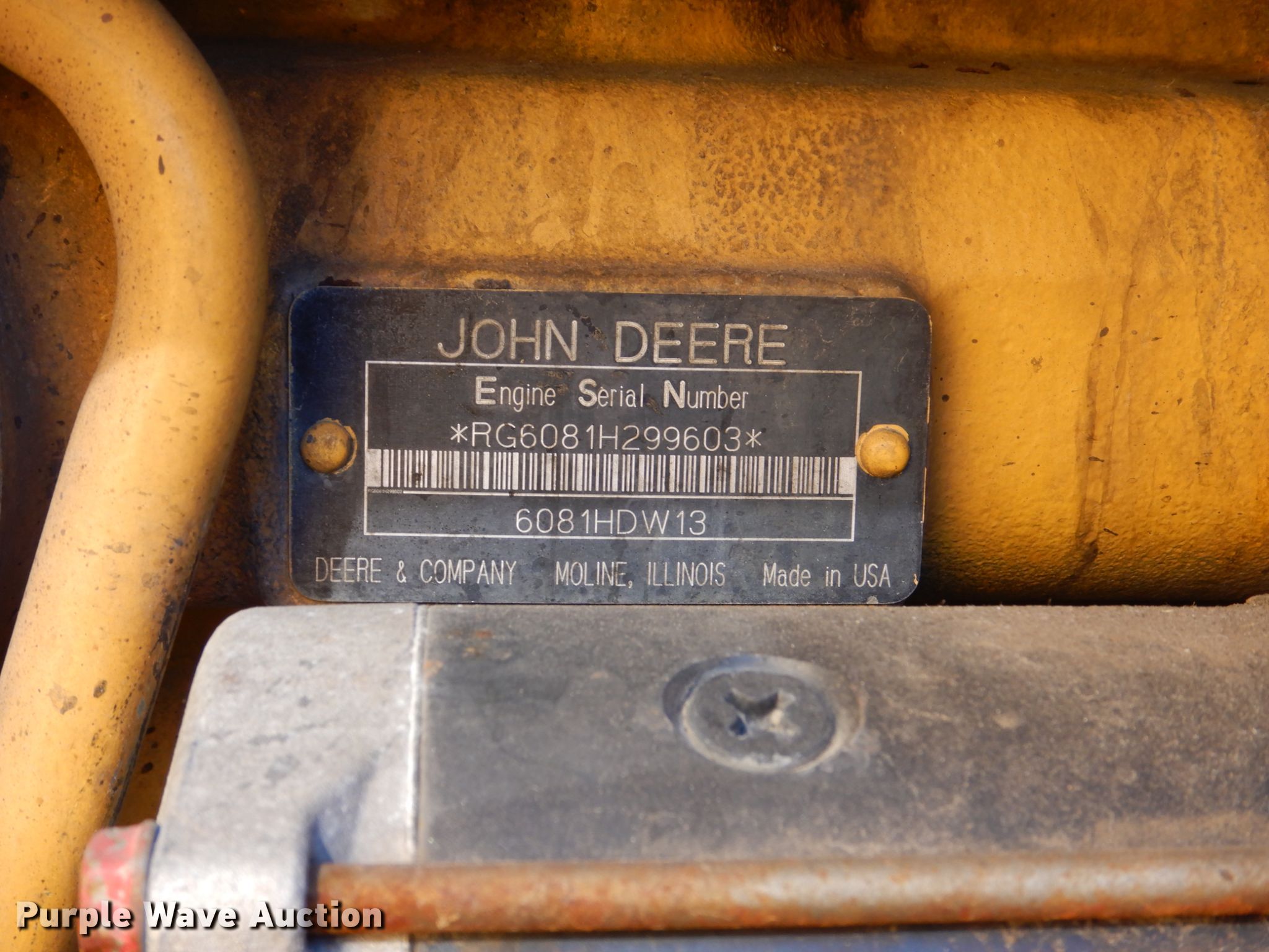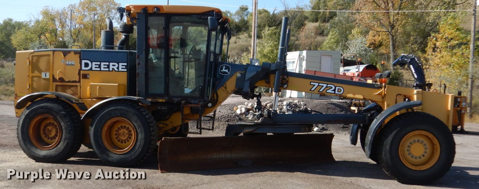 Purple Wave is selling a used Motor Grader in South Dakota. This item is a 2007 John Deere 772D motor grader with the following: 4,708 hours on meter, John Deere six cylinder diesel engine, Serial RG6081H299603, Powershift transmission, 8F-8R gears, Enclosed cab, AC and heat, (12) hydraulic control valves, 14'W moldboard, Tip control, Side shift, Blade accumulators, circle slip clutch, Front mounted push block, Michelin 17.5R25 tires, Maintenance docs will be available at the open inspection, Serial DW772DX615784