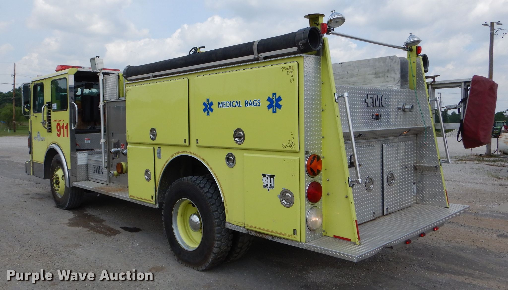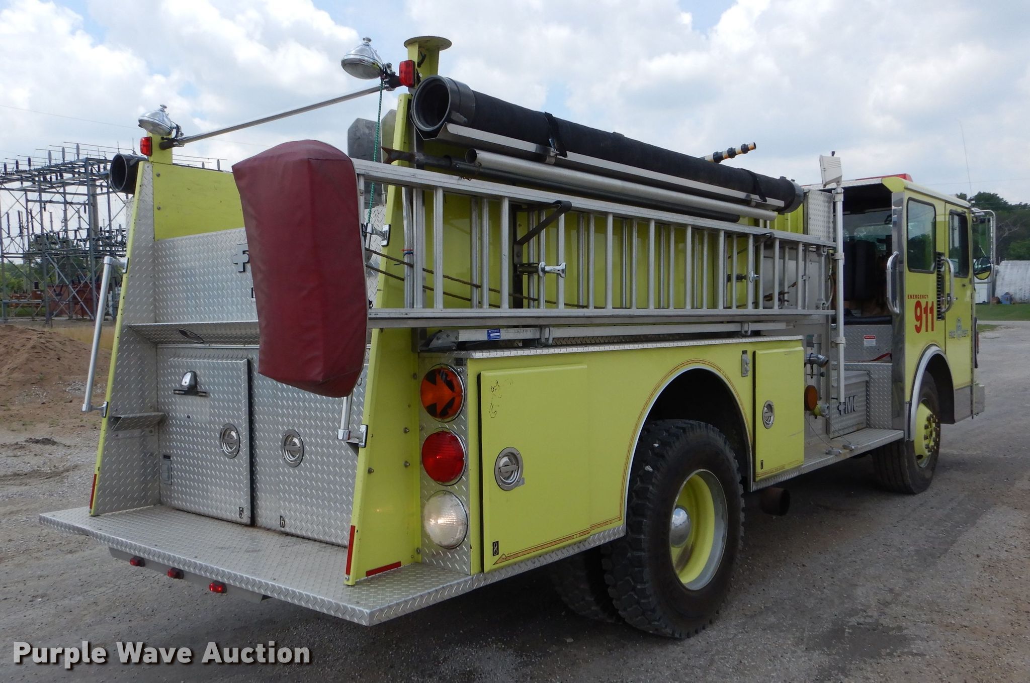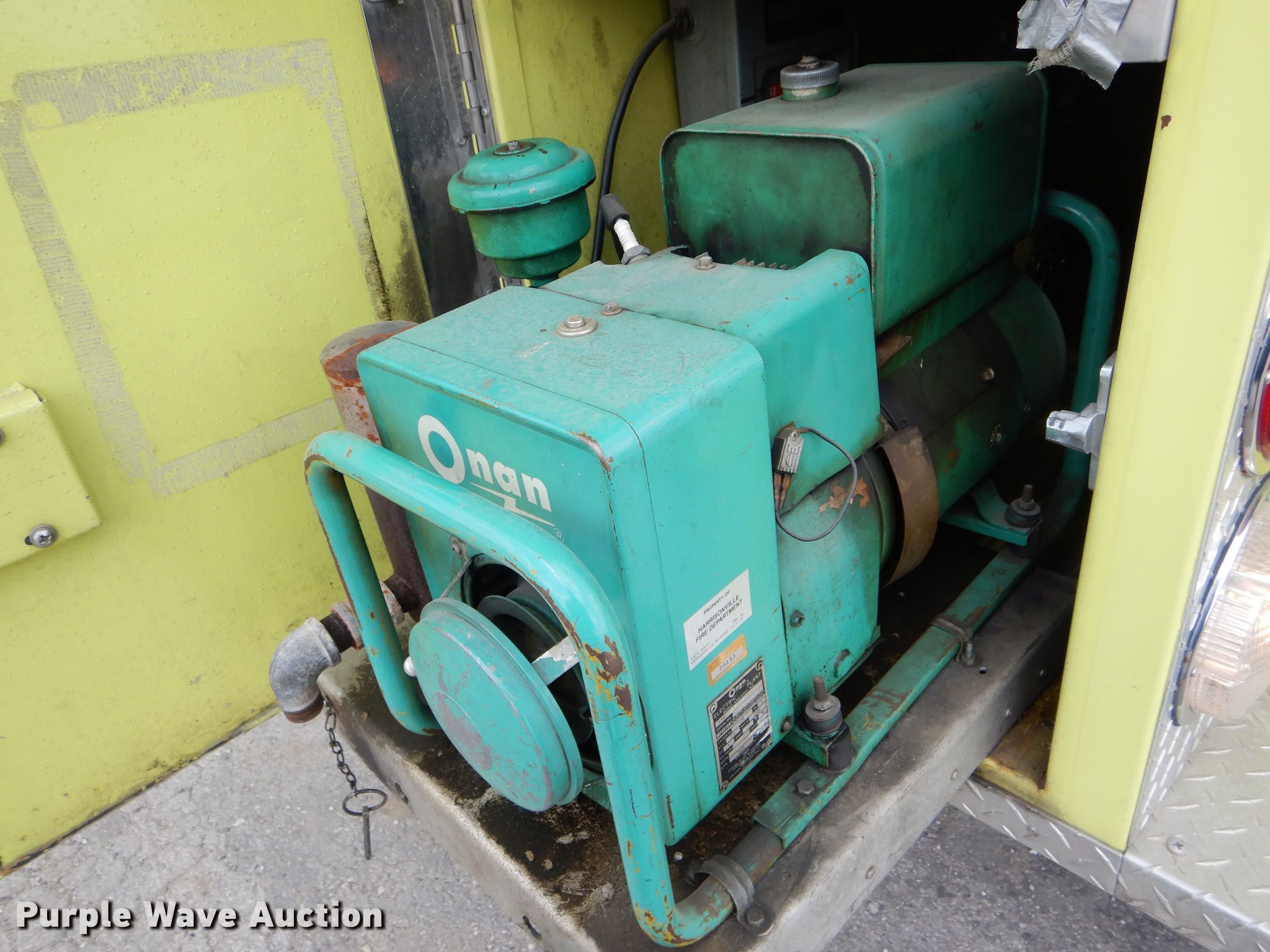 Purple Wave is selling a used Fire Truck or Emergency Vehicle in Missouri. This item is a 1988 Spartan GA26-2142 fire truck with the following: 27,523 miles on odometer, 4,052 hours on meter, Cummins L10 six cylinder diesel engine, Automatic transmission, Single axle, Heat, Elevated deck gun, 1,250 gpm pump, Ground ladder, Onan 2.5AJ-1E/4114K generator, Gas engine, 2,500 watts, Spring suspension, Air brakes, 156" wheelbase, 315/80R22.5 front tires, 11R22.5 rear tires, GVWR 35,220 lbs