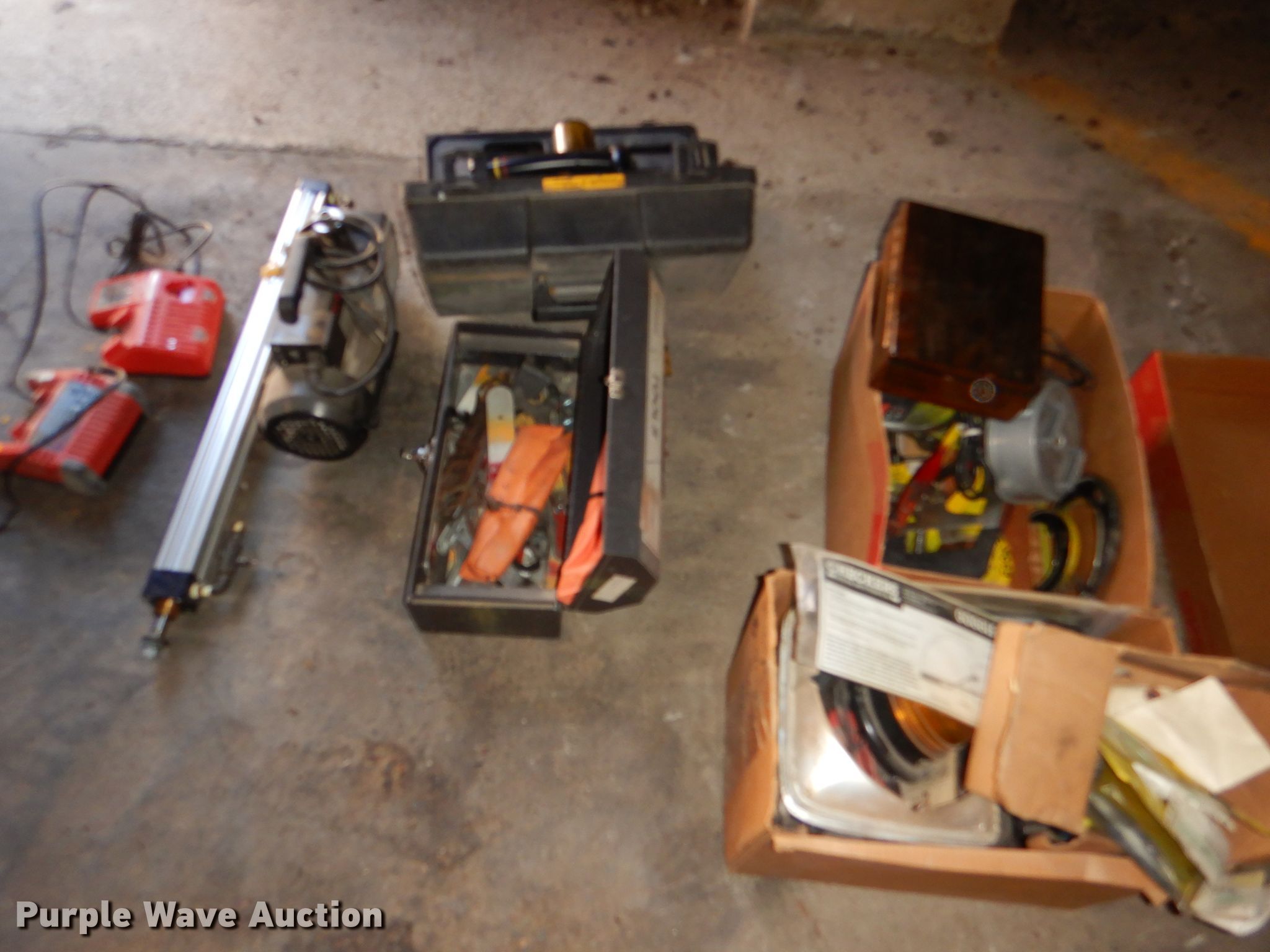 Purple Wave is selling a used Tools in Kansas. This item is a Tools with the following: Milwaukee chargers, Ryobi drill bit set, Wrenches, Beacon lights, Panasonic saw, Reamers, Clamps, Chevrolet 2500 heater core, Flywheel assembly, Rivets, Beam clamp, Pneumatic grease gun, Straps, Pull ropes and more