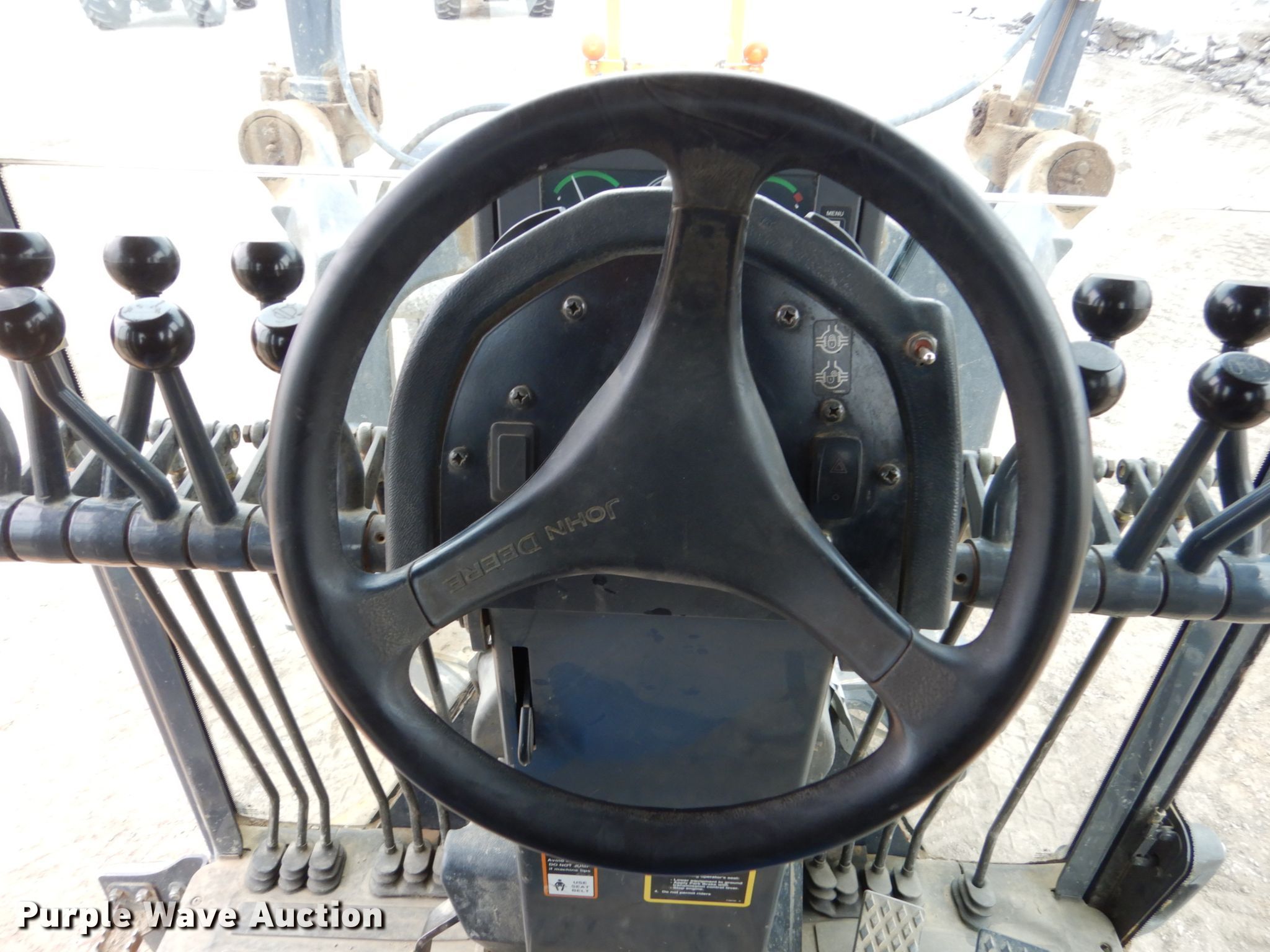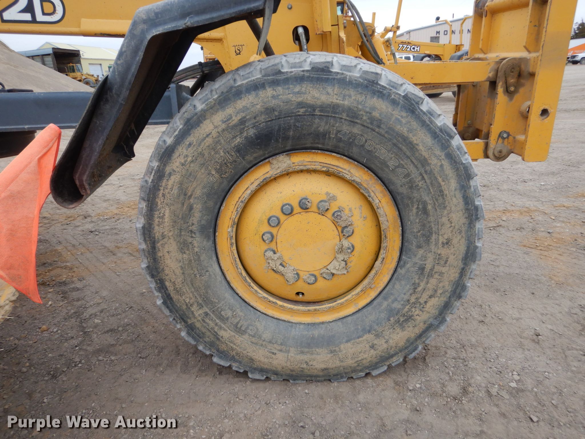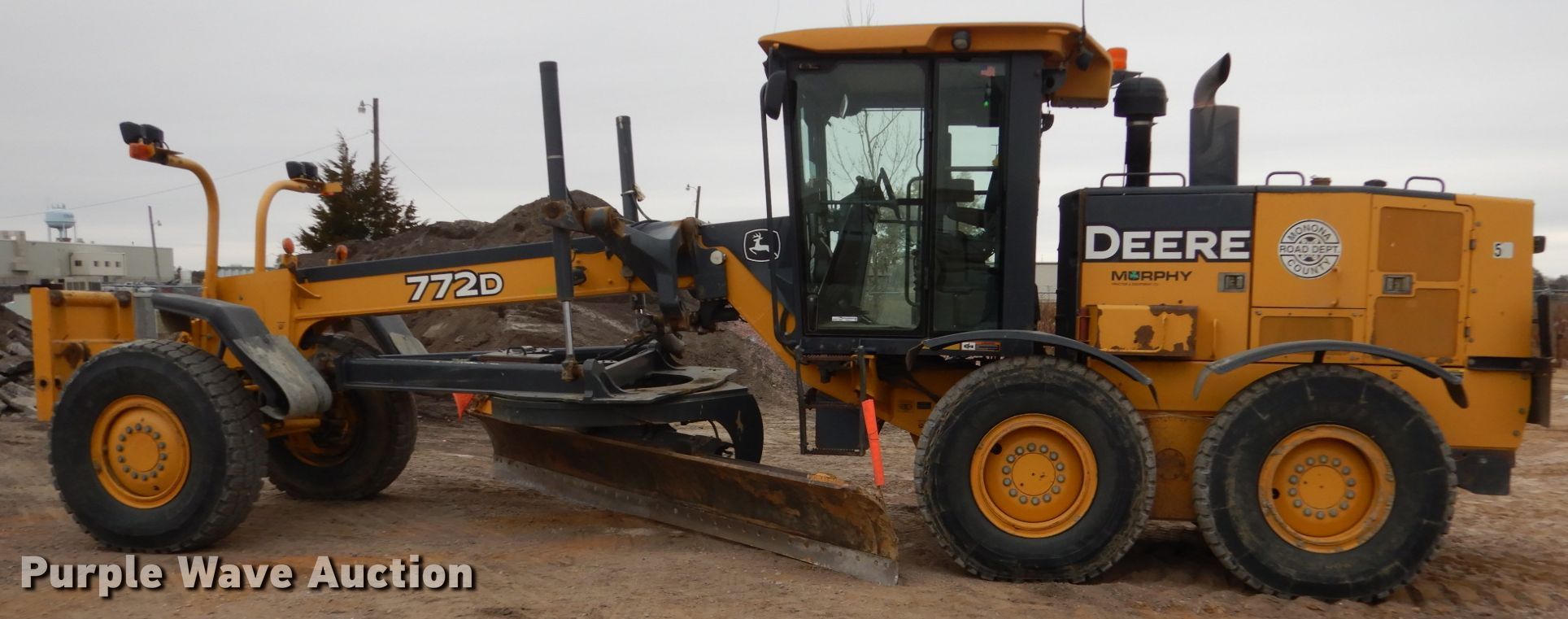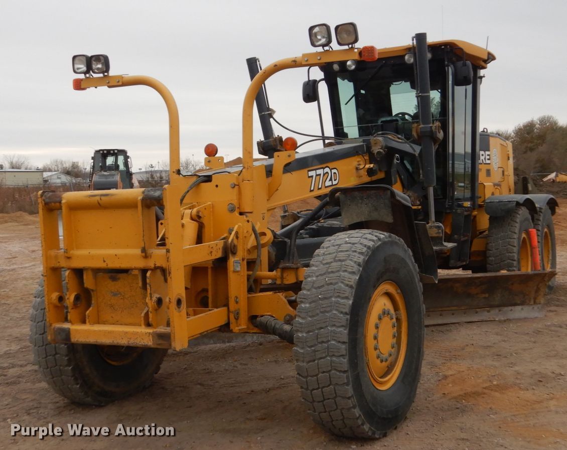 Purple Wave is selling a used Motor Grader in Iowa. This item is a 2005 John Deere 772D motor grader with the following: 9,740 hours on meter, John Deere six cylinder diesel engine, Serial RG6081H260200, Powershift transmission, 8F-8R gears, All wheel drive, Differential locks, Enclosed cab, AC and heat, (12) hydraulic control valves, 16'L moldboard, Tip control, Side shift, Circle slip clutch, 12' Falls Benching wing, Front mounted lift group, 14.00R24 tires, (2) additional 14.00R24 tires, Serial DW772DX596205