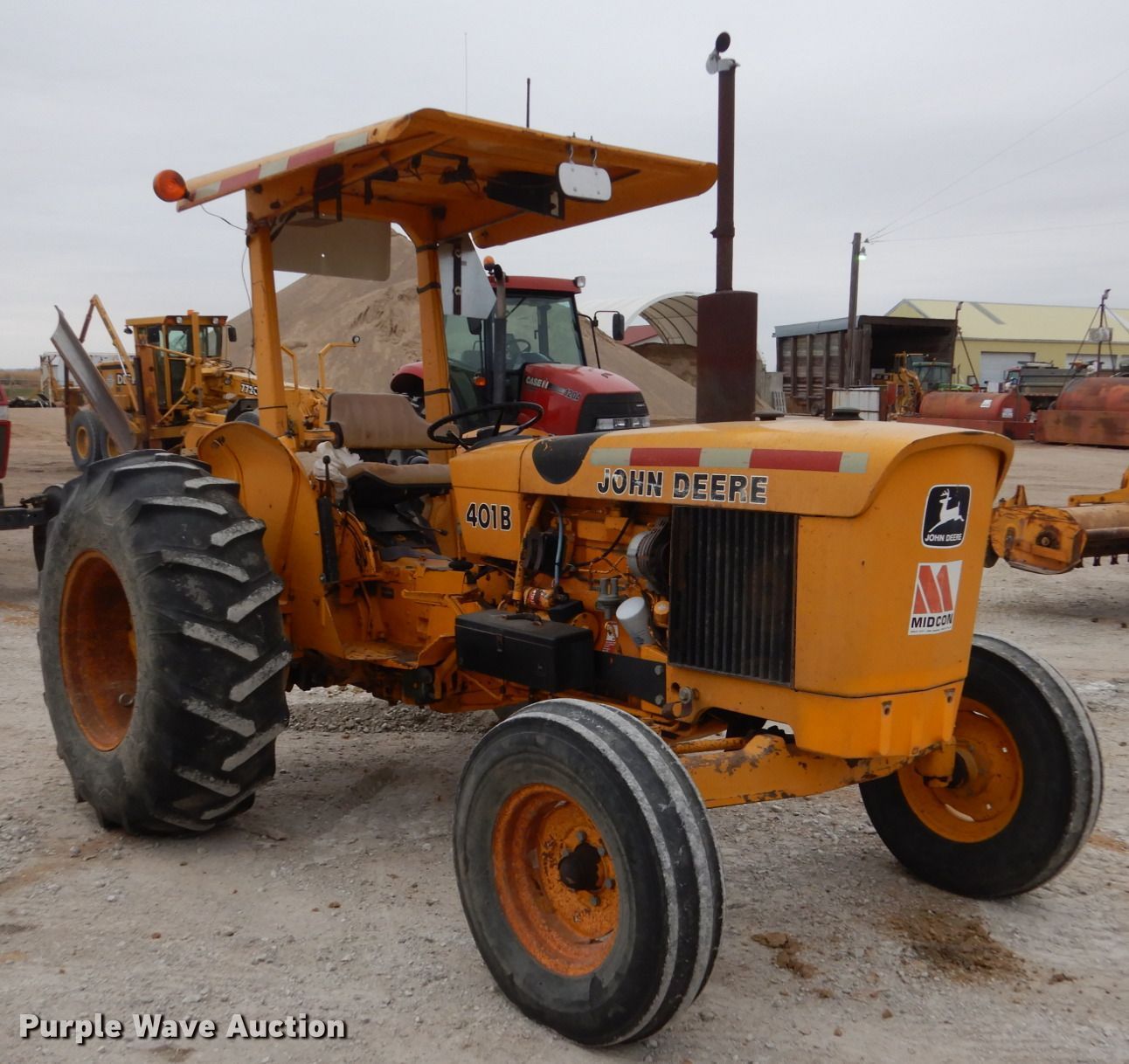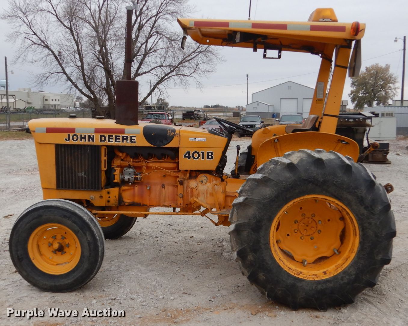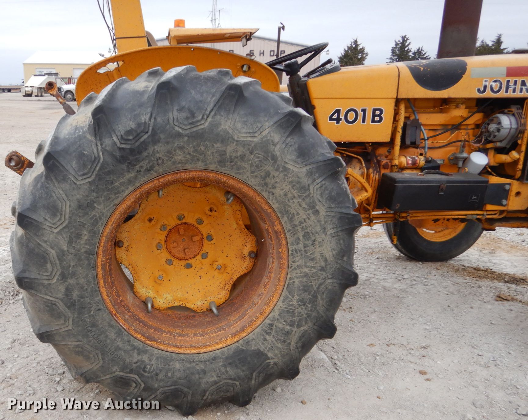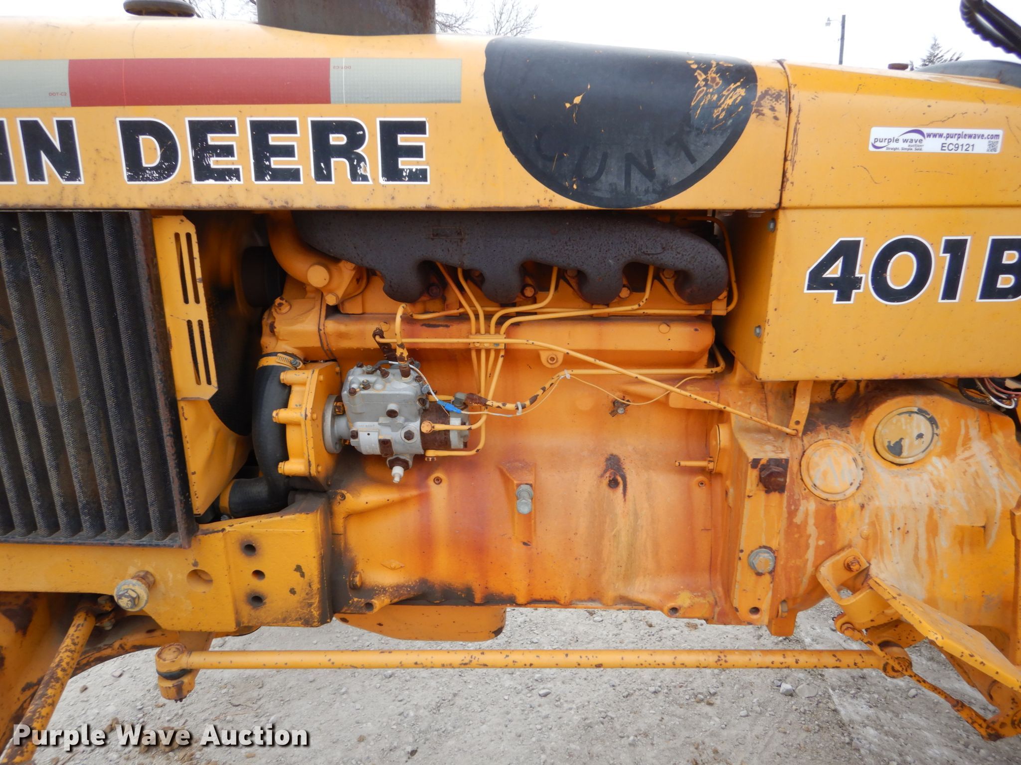 Purple Wave is selling a used Tractor in Iowa. This item is a 1982 John Deere 401B tractor with the following: 144 hours on meter, John Deere four diesel engine, Serial 606894T, Manual transmission, 8F-4R gears, Three point, Top link, 540 PTO, (2) rear hydraulic remote sets, 7.50-16 front tires, 16.9-24 rear tires, Serial 401B388168T