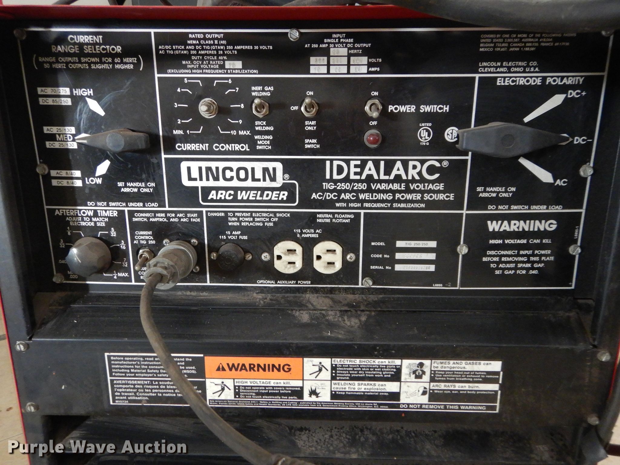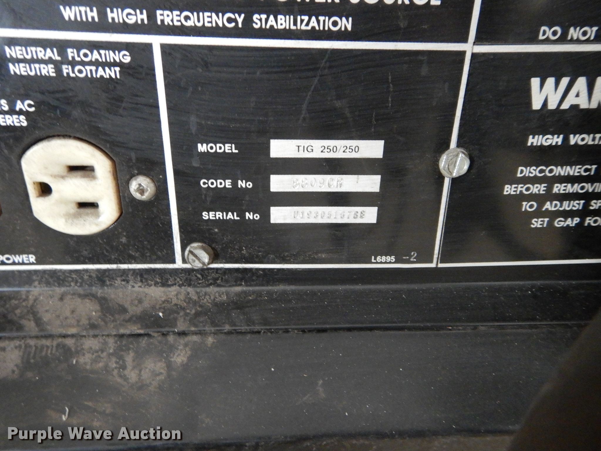 Purple Wave is selling a used Welder (Manual) in Kansas. This item is a Lincoln Idealarc TIG 250 TIG AC/DC welder with the following: 40 to 250 amp outputs, Serial U1930516768