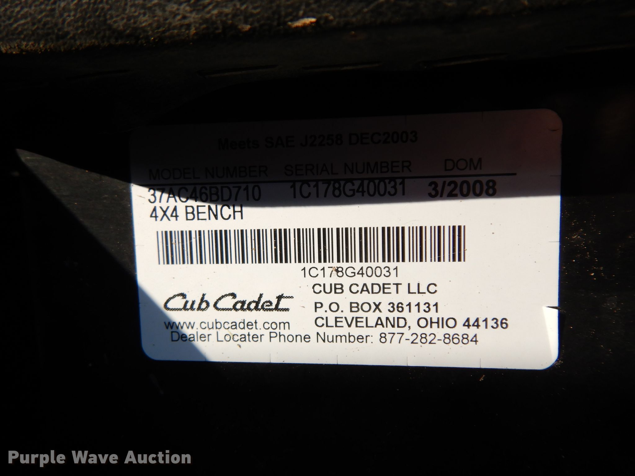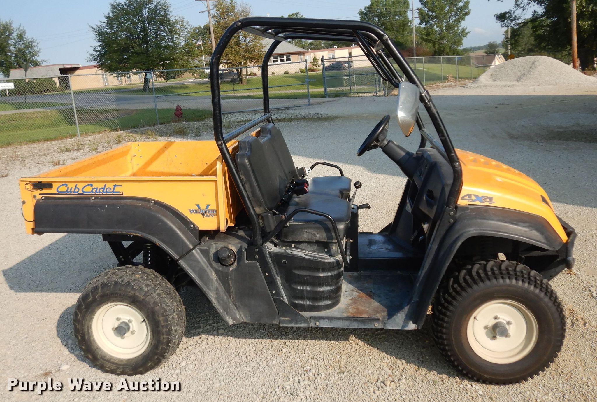 Purple Wave is selling a used Utility Vehicle in Kansas. This item is a 2008 Cub Cadet Volunteer utility vehicle with the following: 937 hours on meter, 624cc gas engine, CVT transmission, Four wheel drive, OROPS, Two passenger capacity, Grill guard, 42"L x 51"W manual dump bed, Receiver hitch, 25 x 10.00-12 front tires, 25 x 11.00-12 rear tires, Possible engine issues, Engine burns oil