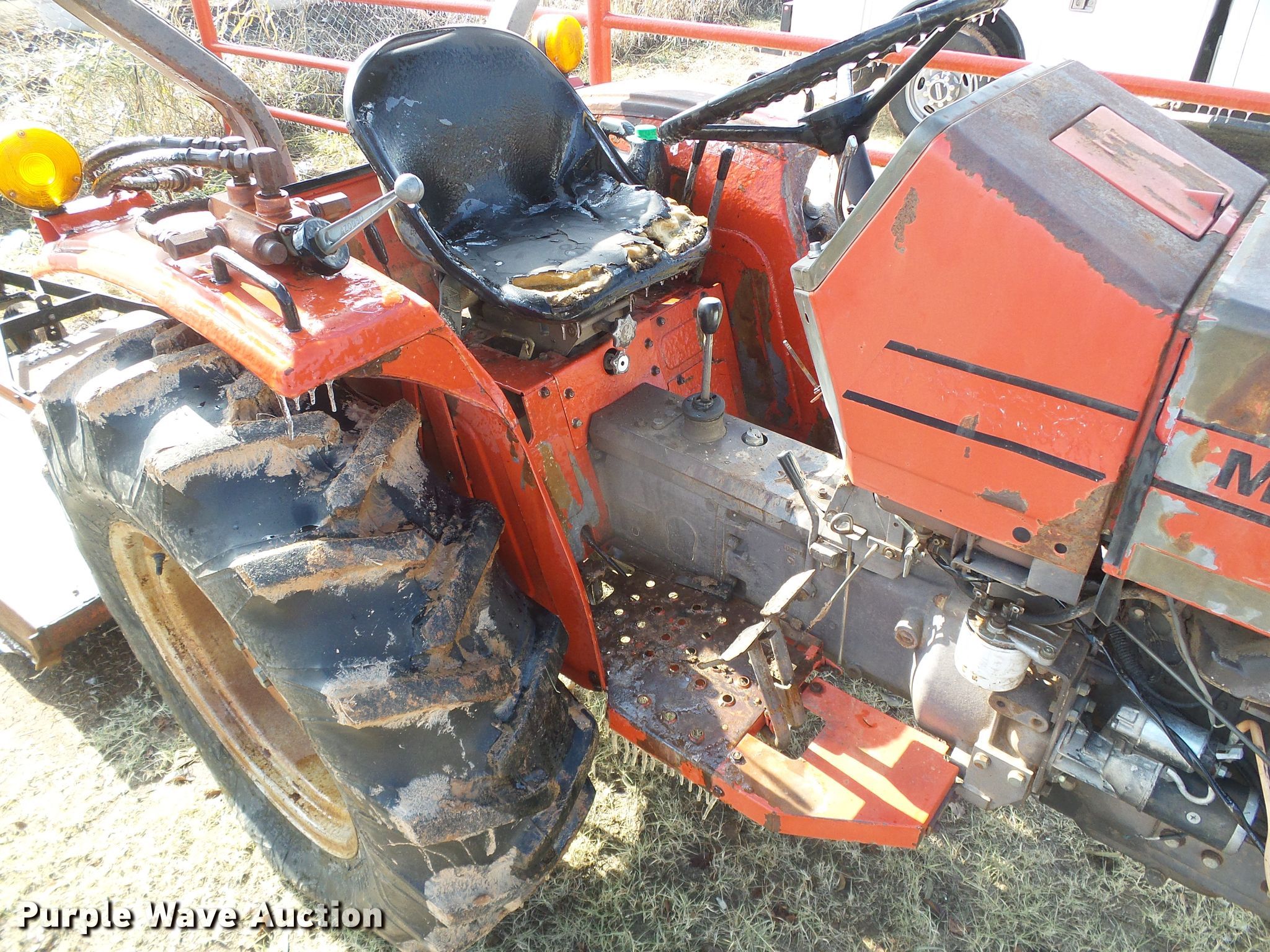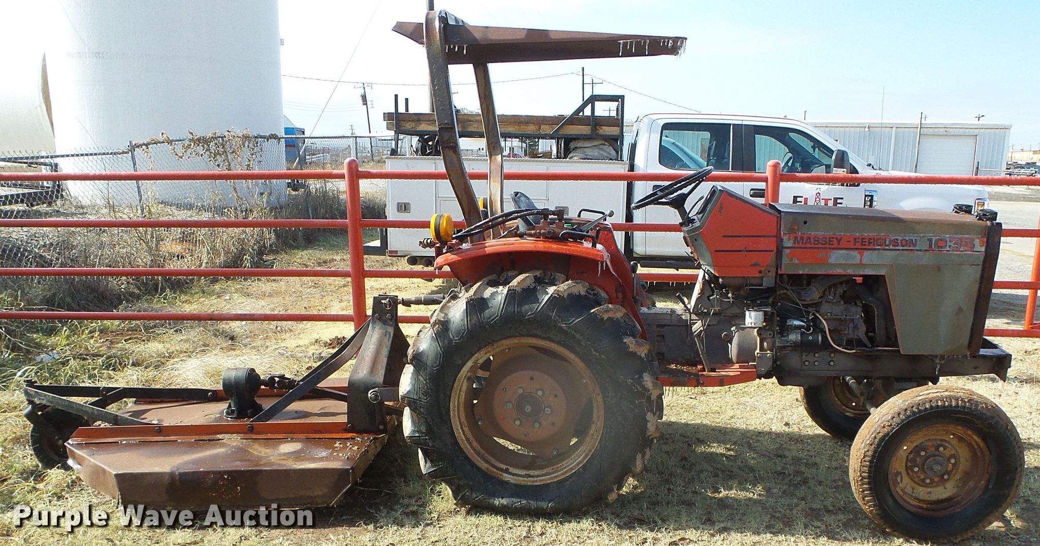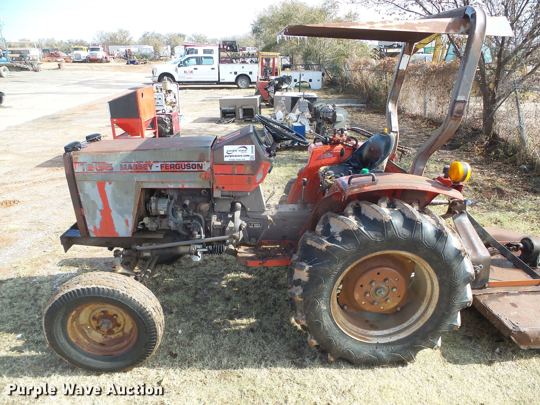 Purple Wave is selling a used Tractor in Oklahoma. This item is a 1990 Massey Ferguson 1035 tractor with the following: 1,477 hours on meter, Toyosha 1.5L three cylinder diesel engine, Manual transmission, 12F-4R gears, 540 PTO, Three point, Top link, Single rear hydraulic remote set, 5'W rotary mower, 6.70-15 front tires, 13.6-24 rear tires, Serial 00712