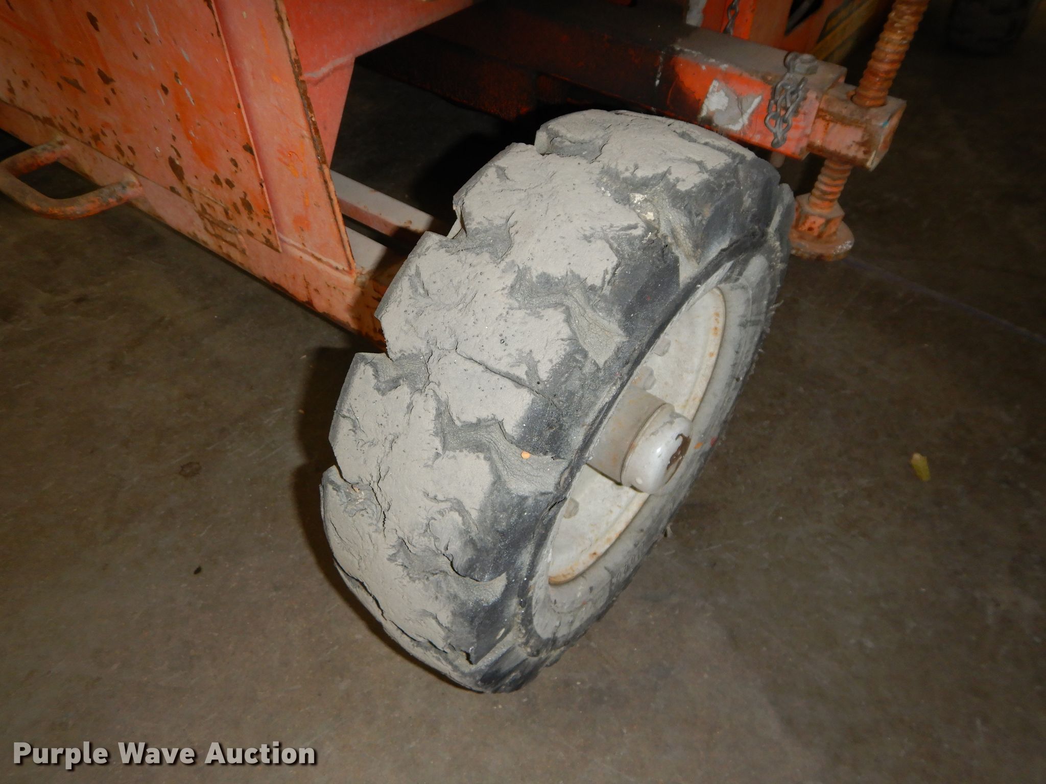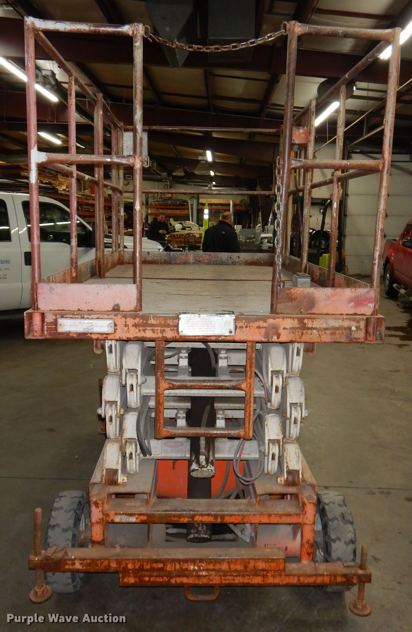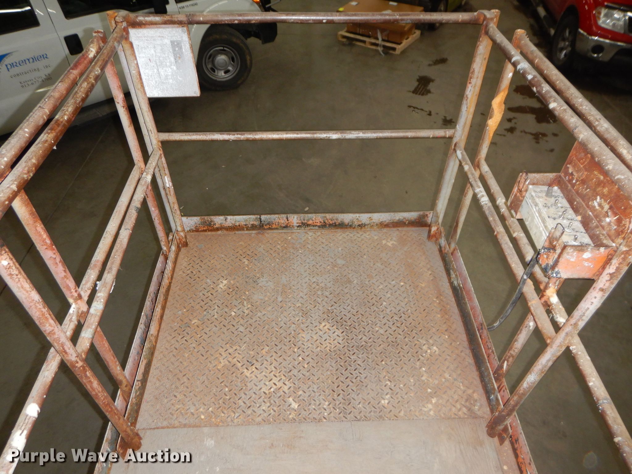 Hunterlift 2152 scissor lift. 24V electric motor, 1,000 lbs max lift capacity, 21' max lift height, 6.5'L x 52"W platform Platform and ground controls, Manual platform extensions, Plywood platform floor, 4.00x8 solid tires, Serial AK87-12. Kansas City, KS 66109