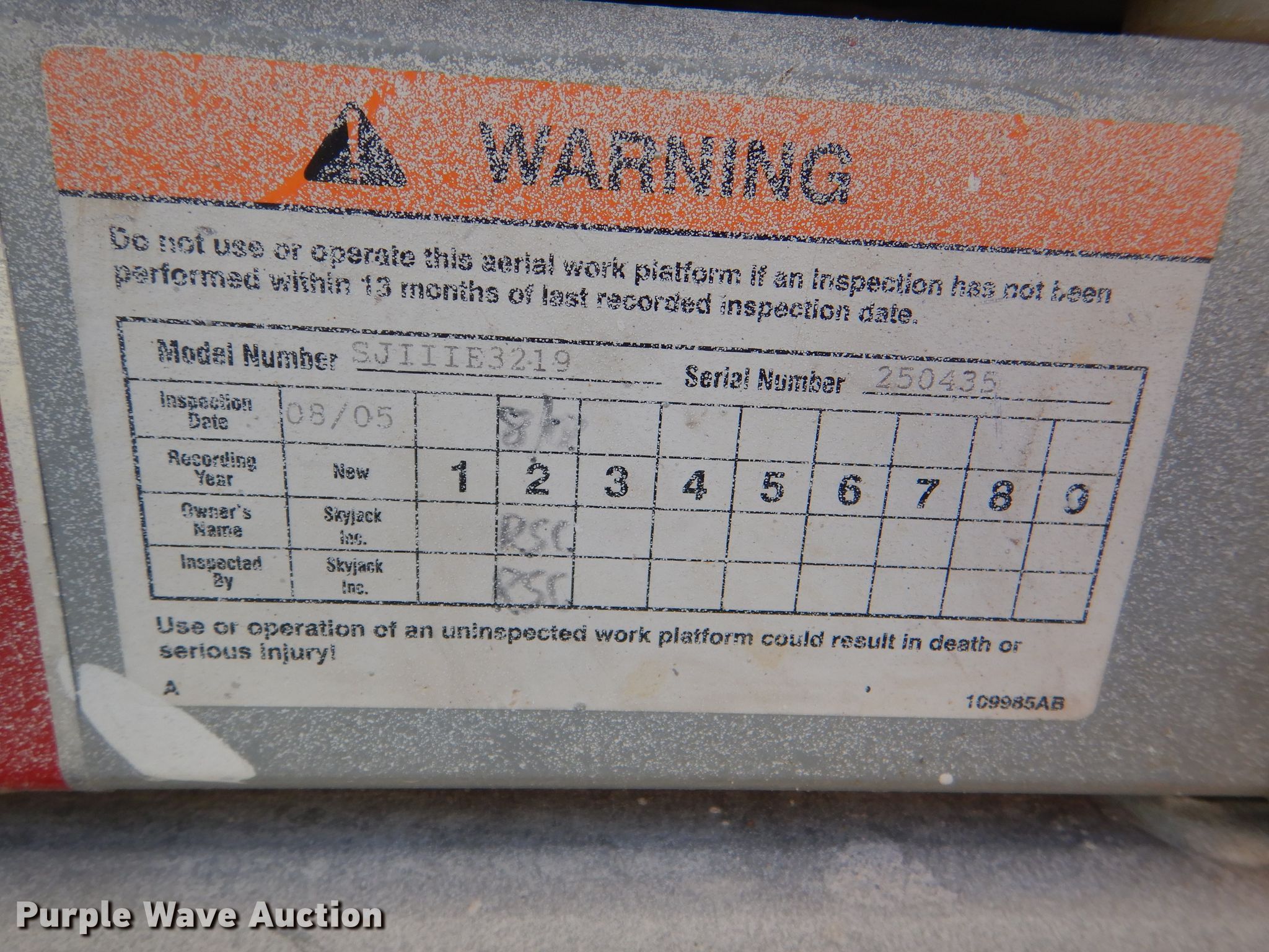Purple Wave is selling a used Scissor or Vertical Lift in Kansas. This item is a Skyjack SJIII 3219 scissor lift with the following: 24V electric motor, 550 lbs capacity, Carlisle 12x4 tires, Dead batteries, Serial 250435