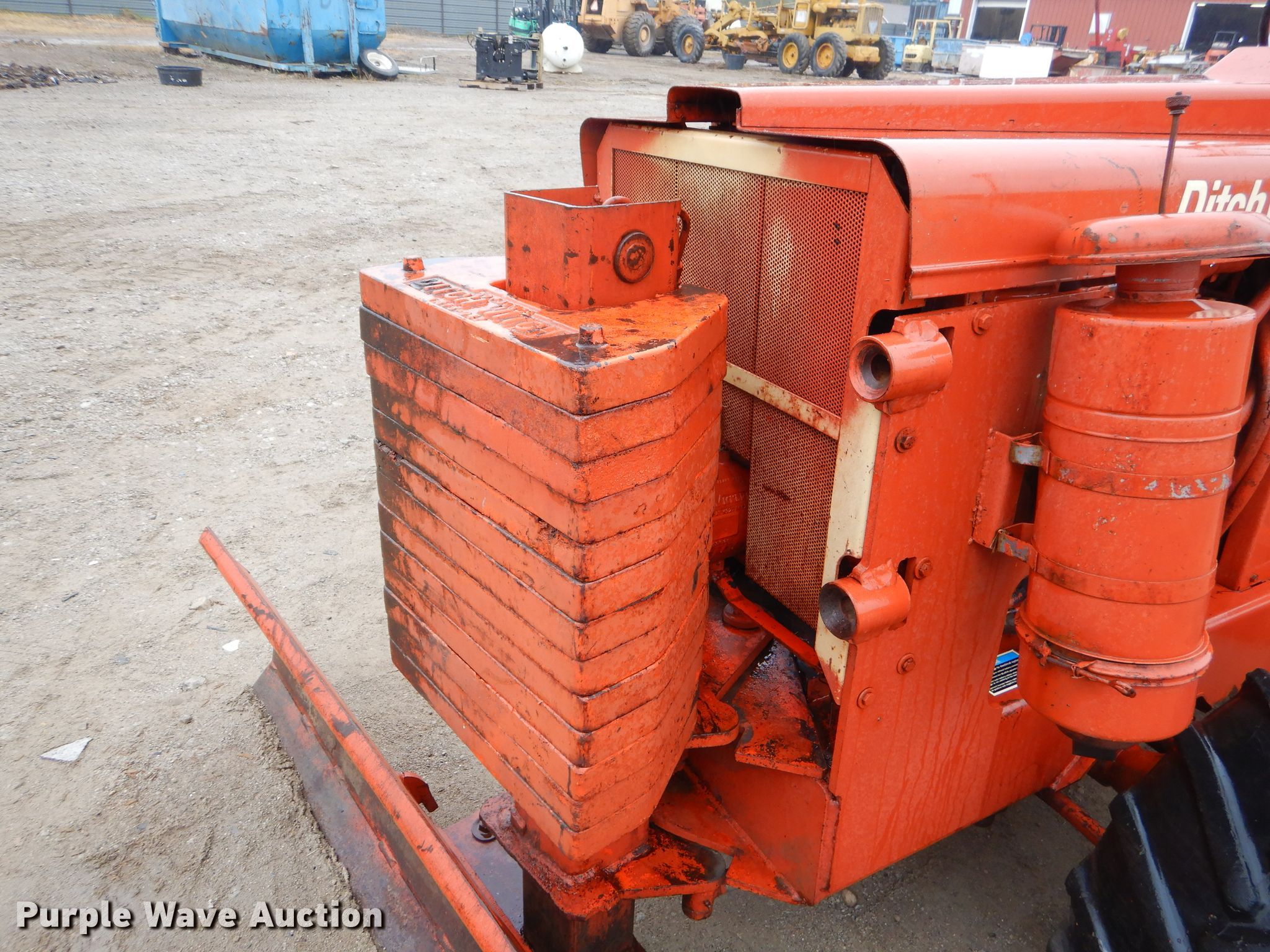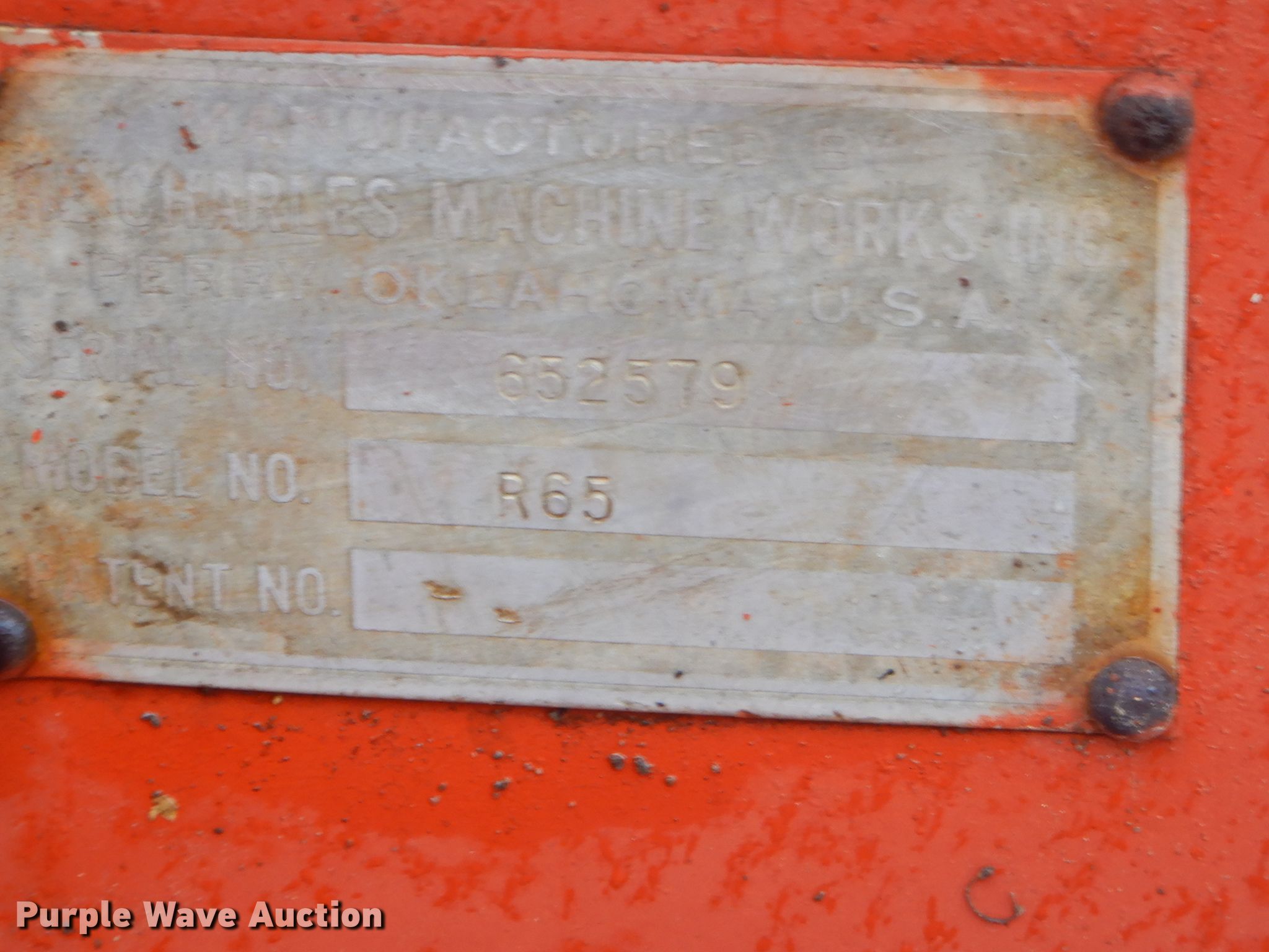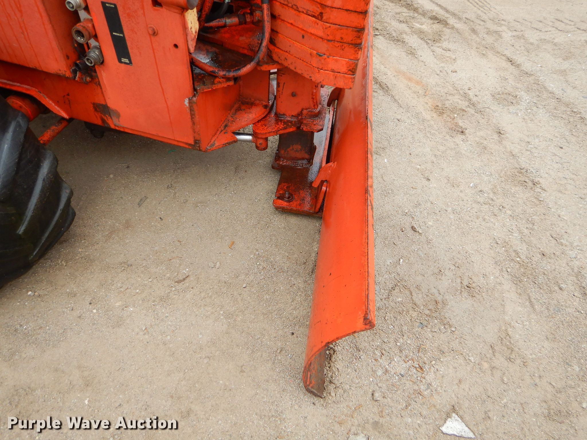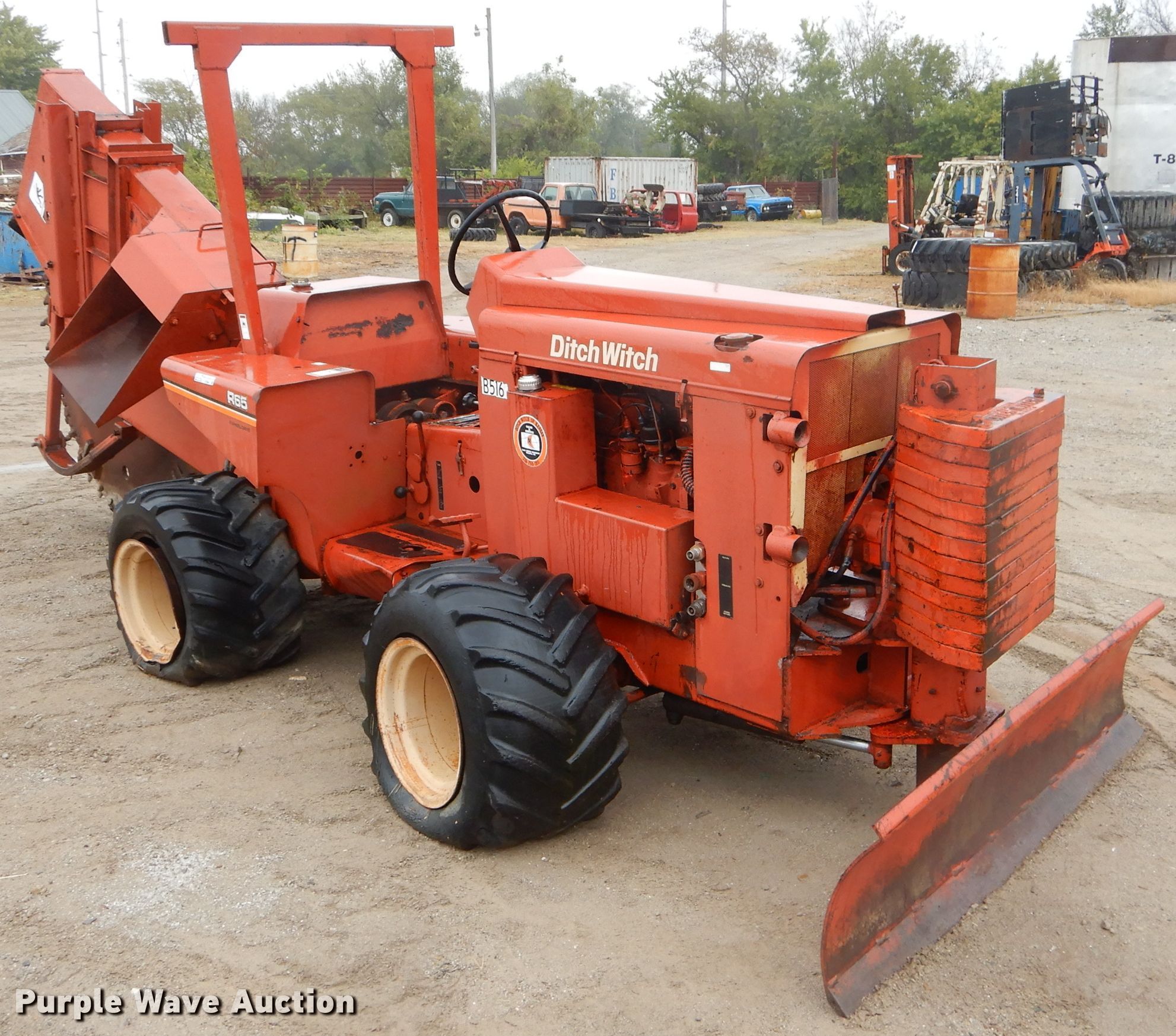 1978 Ditch Witch R65 rock saw. 1,451 hours on meter, Four cylinder gas engine, Manual transmission 4F-1R gears, Four-way backfill blade, Rock wheel model R65ES2 64" wheel diameter, 3" cutting width, Serial 6241, 31x15.5-15 tires, Non-operational unit, Serial 652579. Southside Recycling LLC - Open inspection Dec. 2, 3. 1025 Coffeyville Ave. Independence, KS 67301