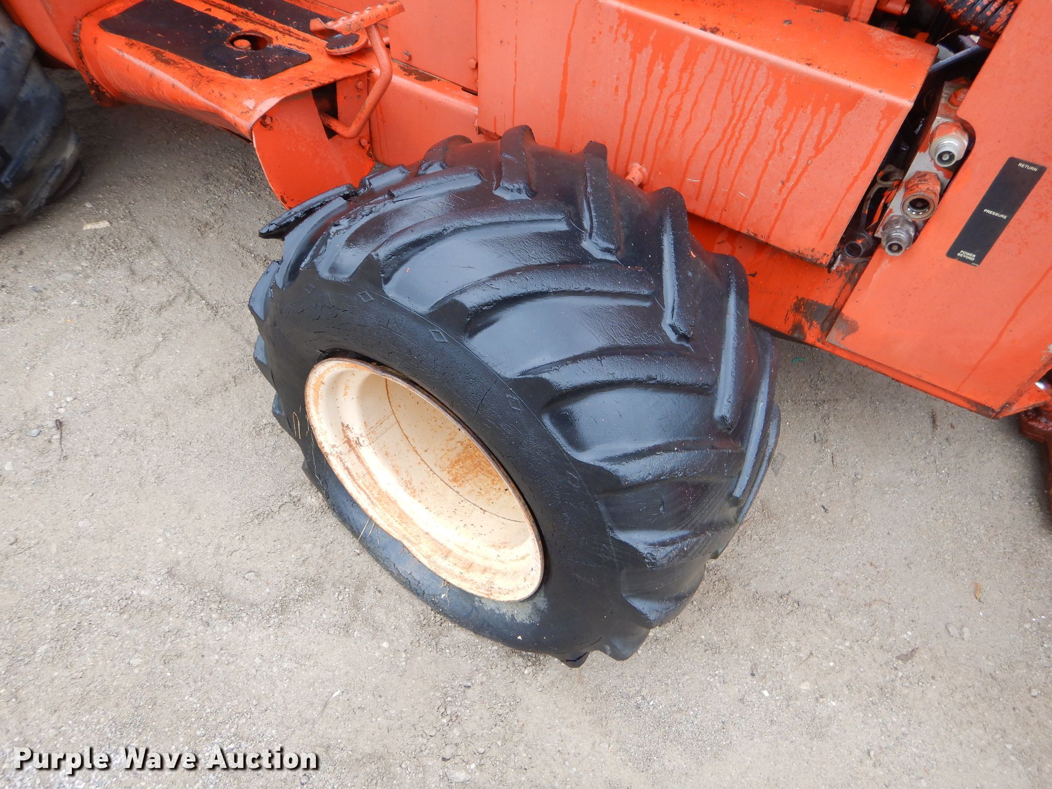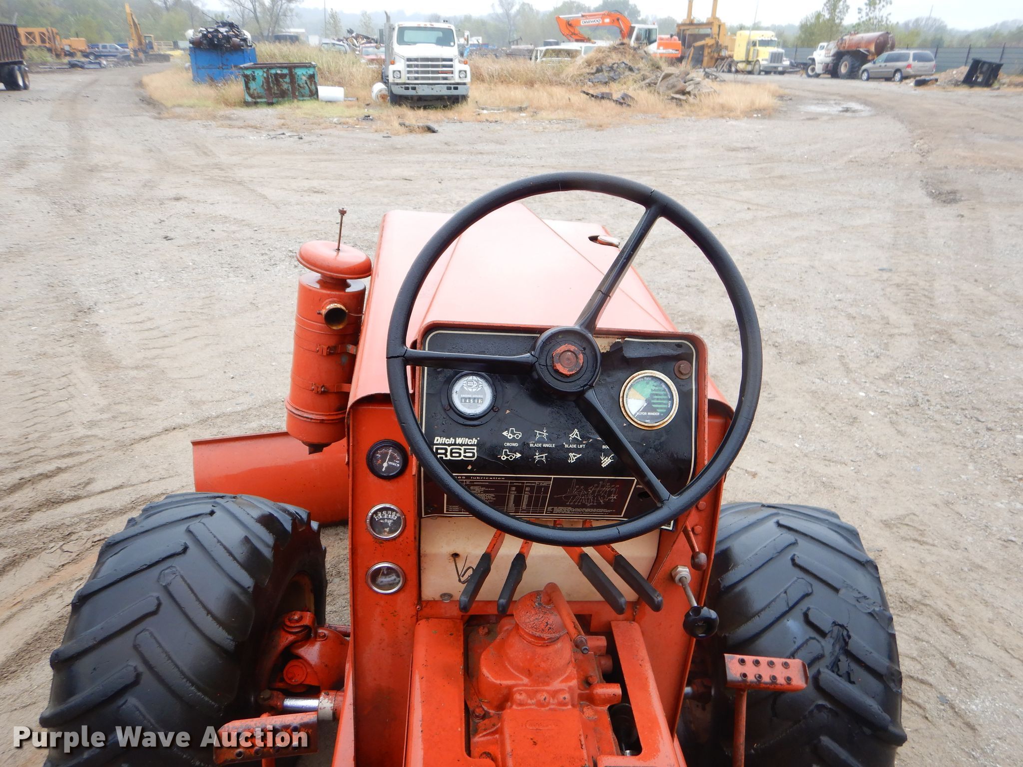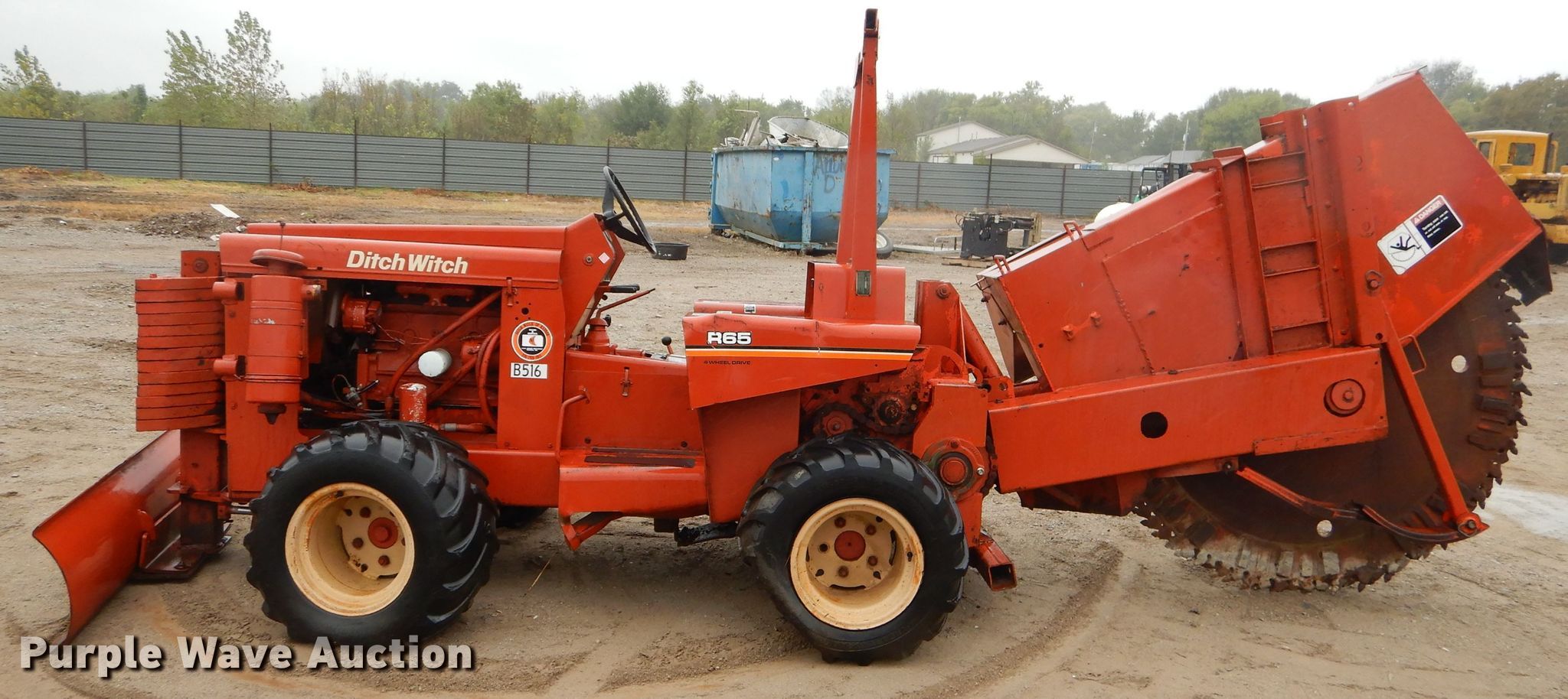 Purple Wave is selling a used Trencher or Rock Saw in Kansas. This item is a 1978 Ditch Witch R65 rock saw with the following: 1,451 hours on meter, Four cylinder gas engine, Manual transmission, 4F-1R gears, Four-way backfill blade, Rock wheel model R65ES2, 64" wheel diameter, 3" cutting width, Serial 6241, 31x15.5-15 tires, Non-operational unit, Serial 652579