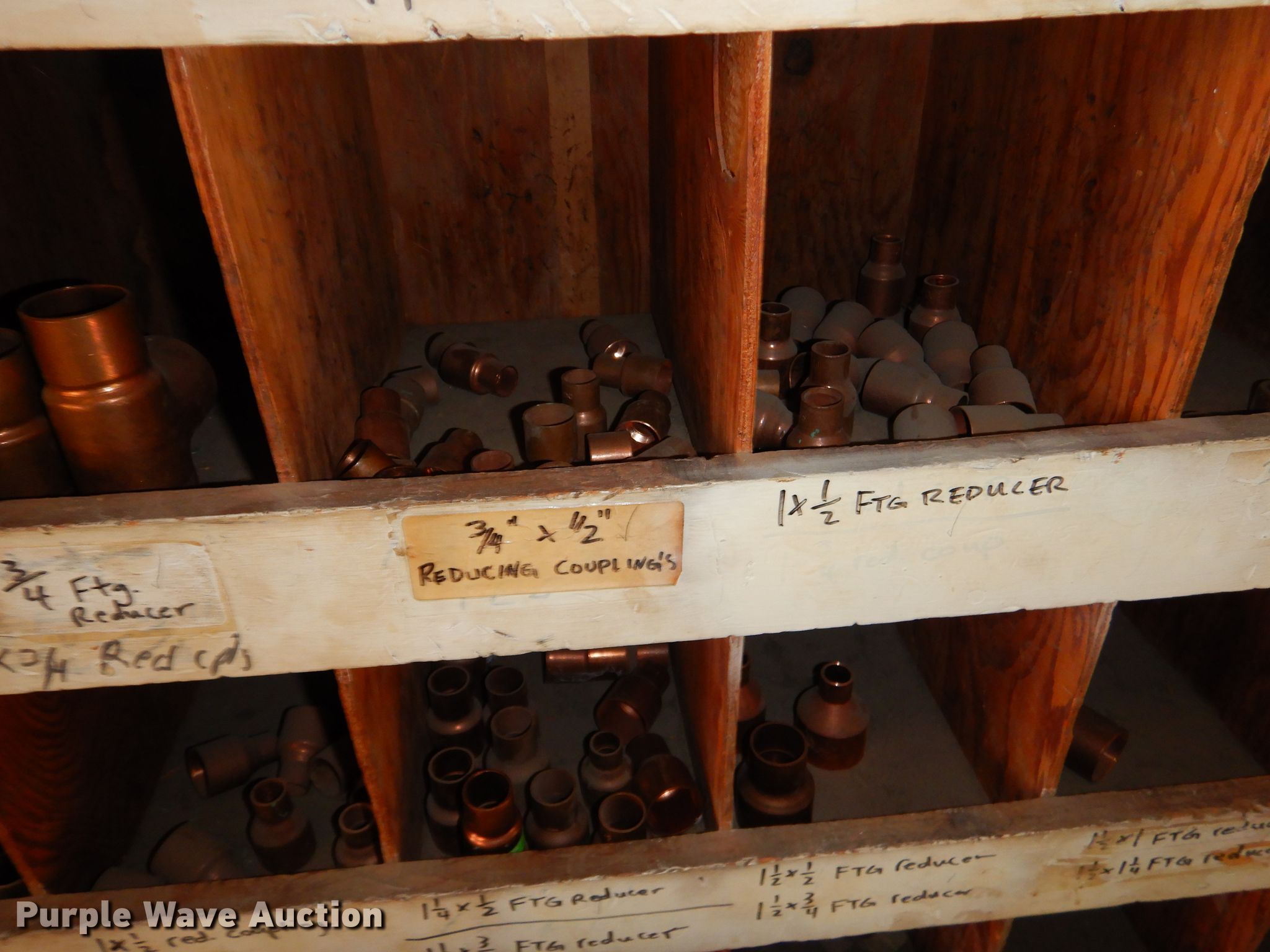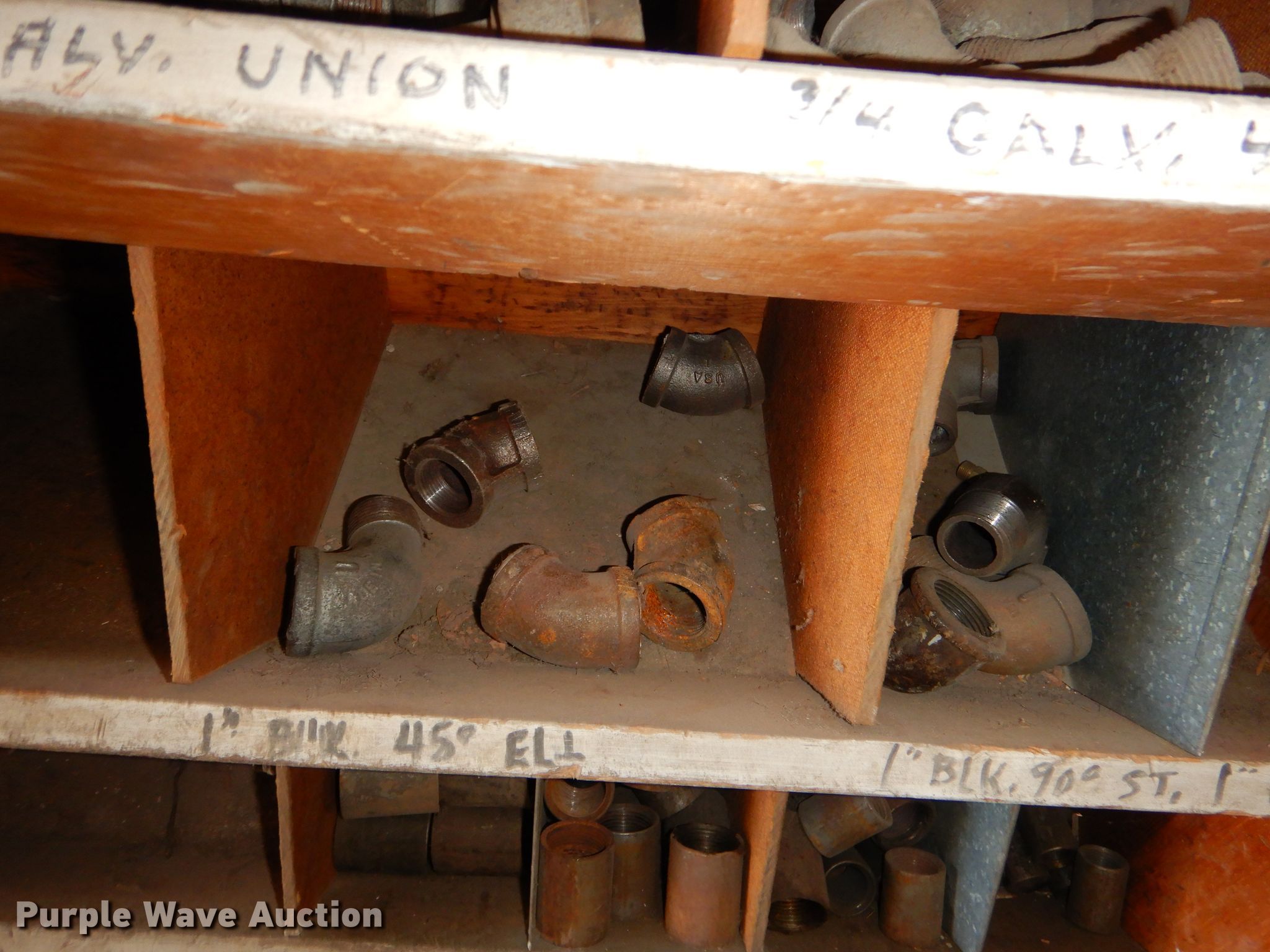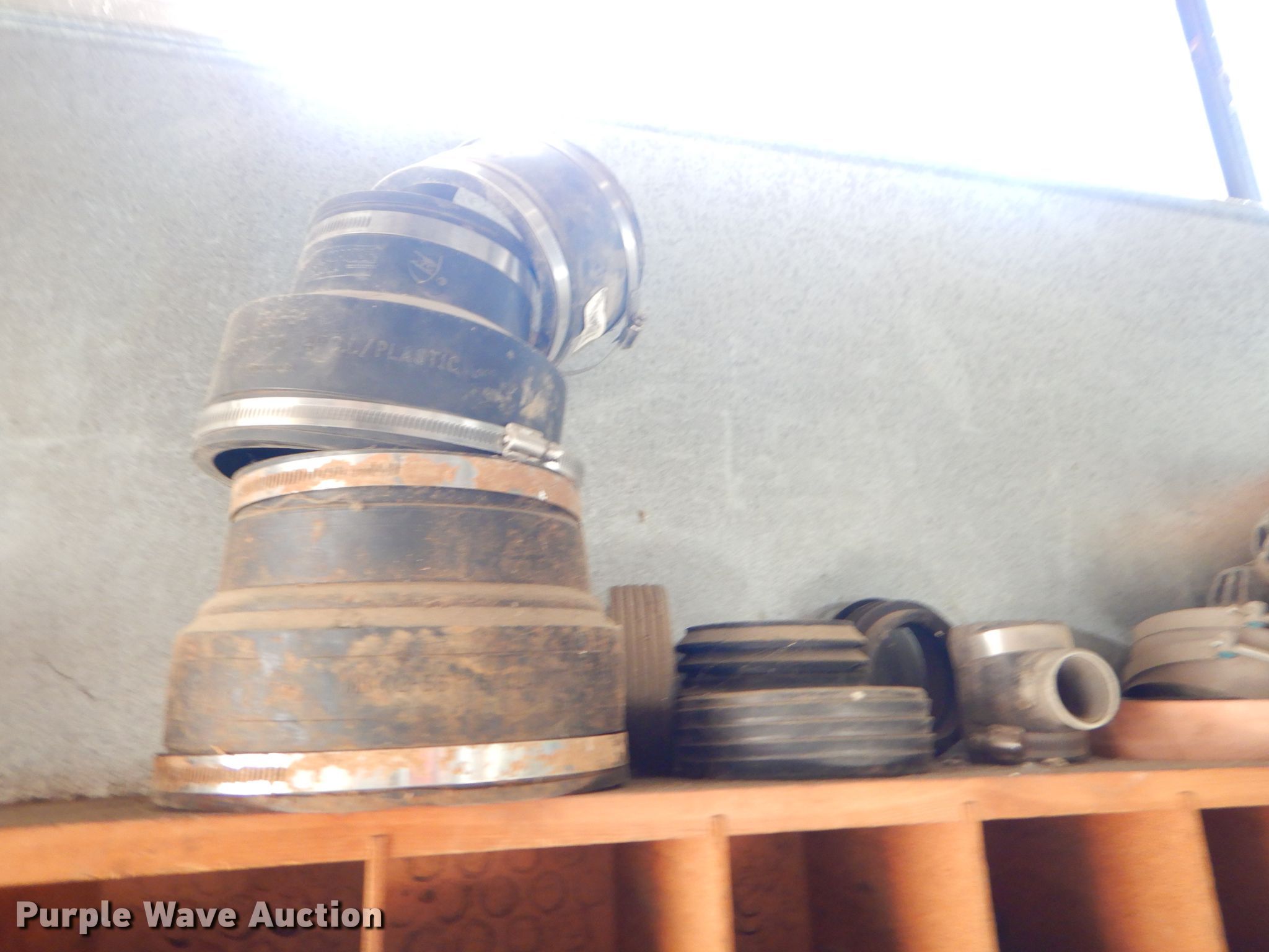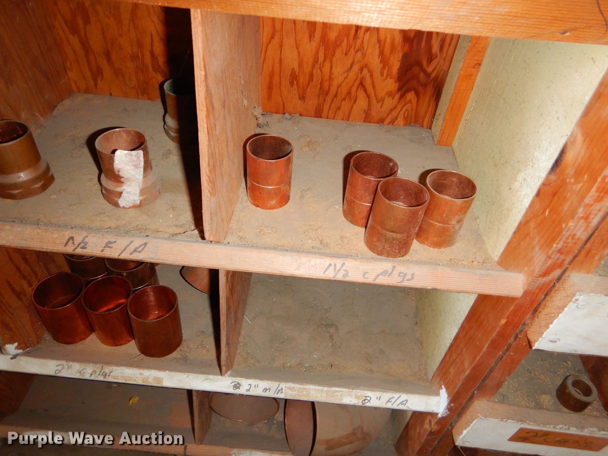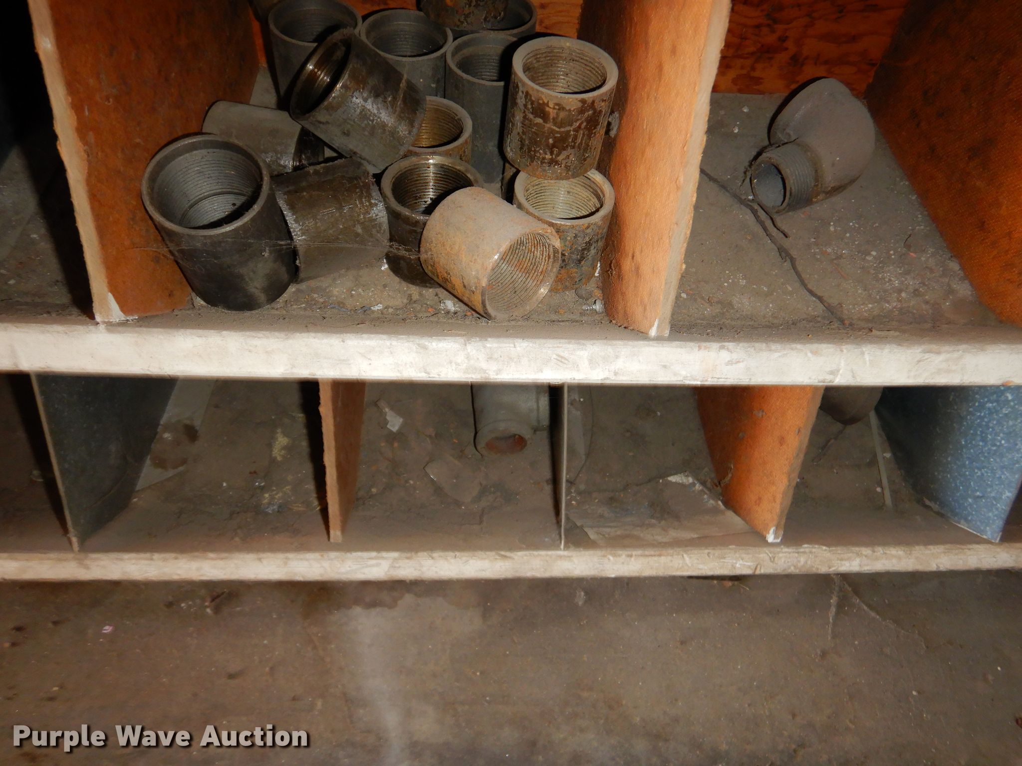 Purple Wave is selling a used Pipe in Kansas. This item is a Fittings with the following: Rubber couplers, Black fittings, Galvanized fittings, Copper/brass fittings, Valves, Wood shelving and more, Item must be removed by December 11