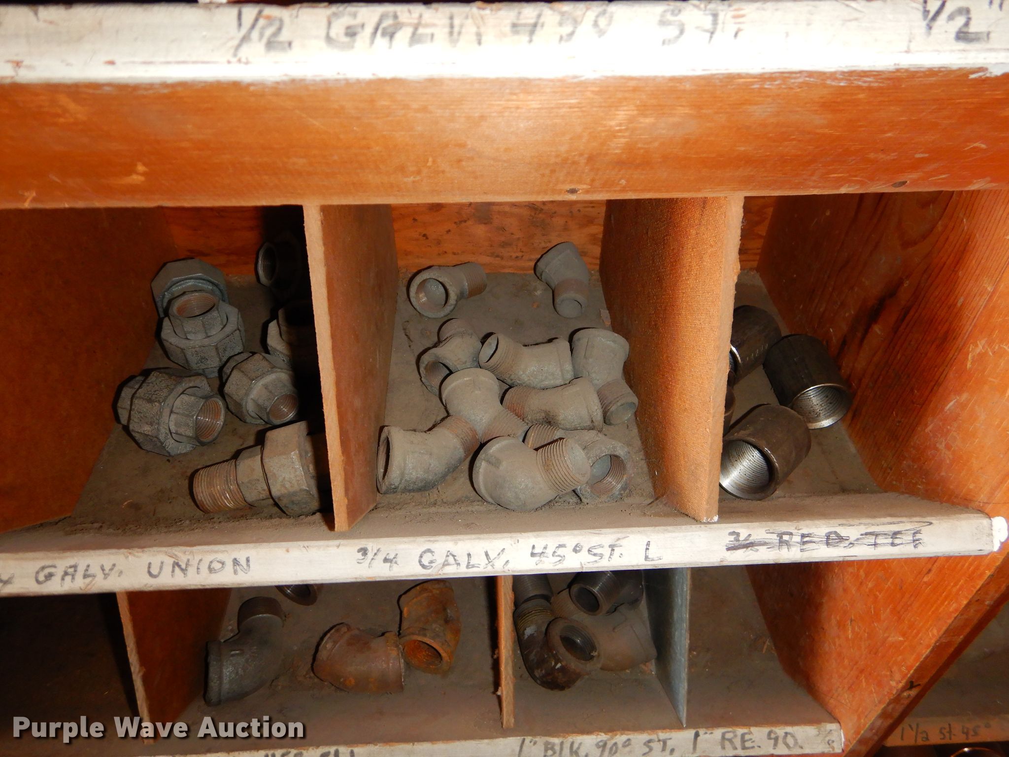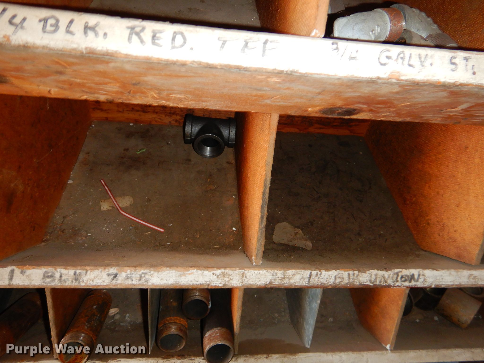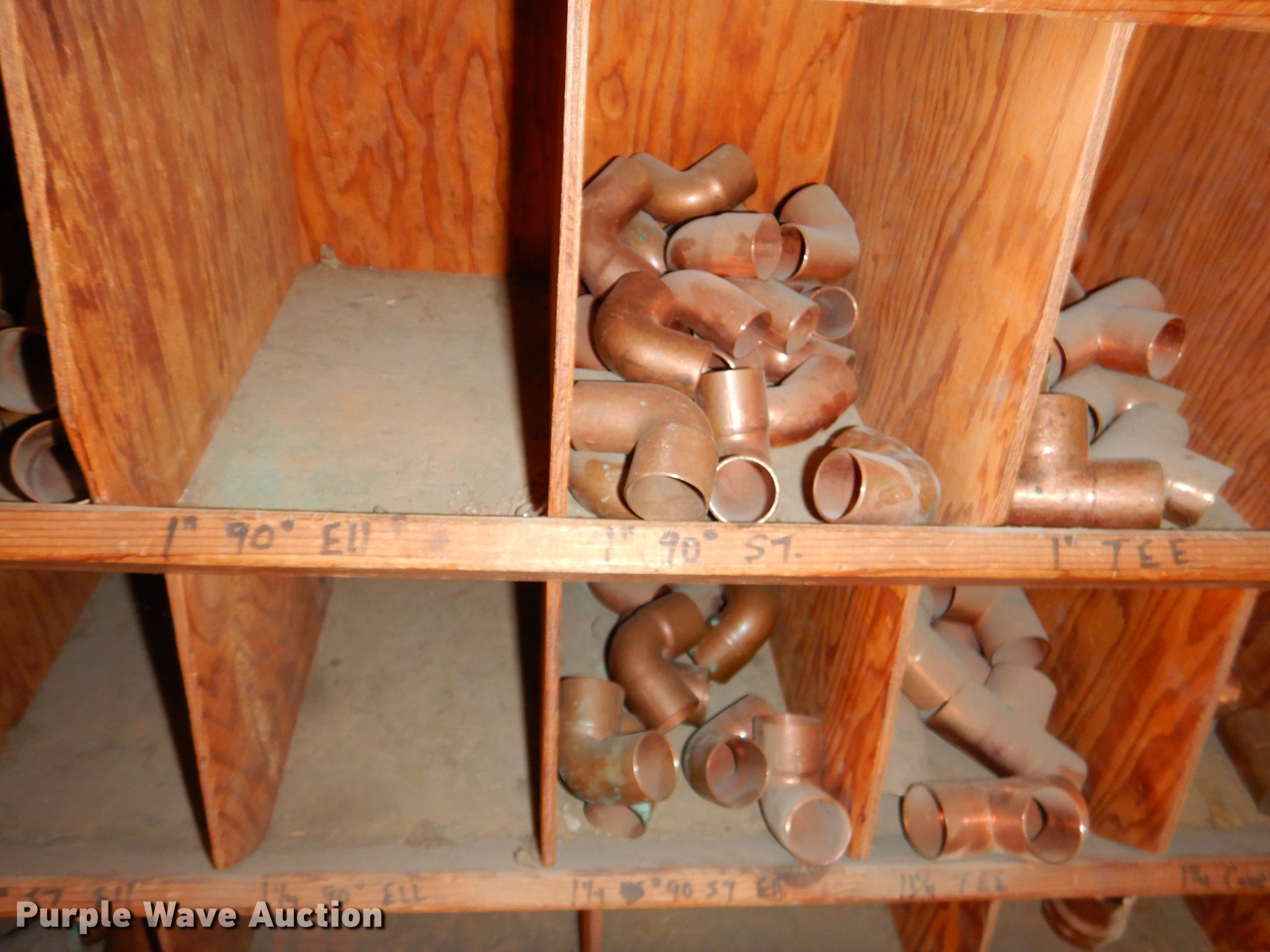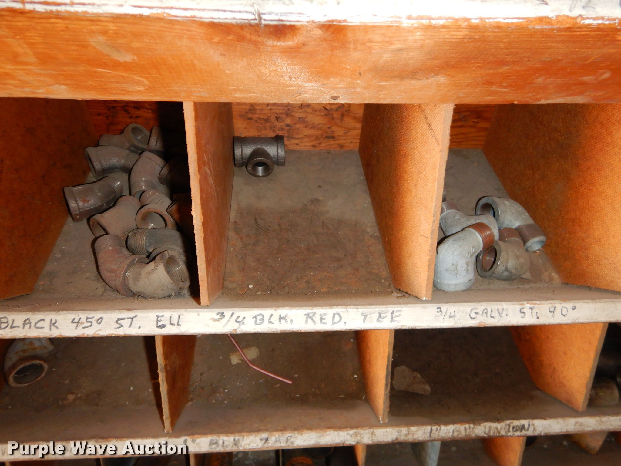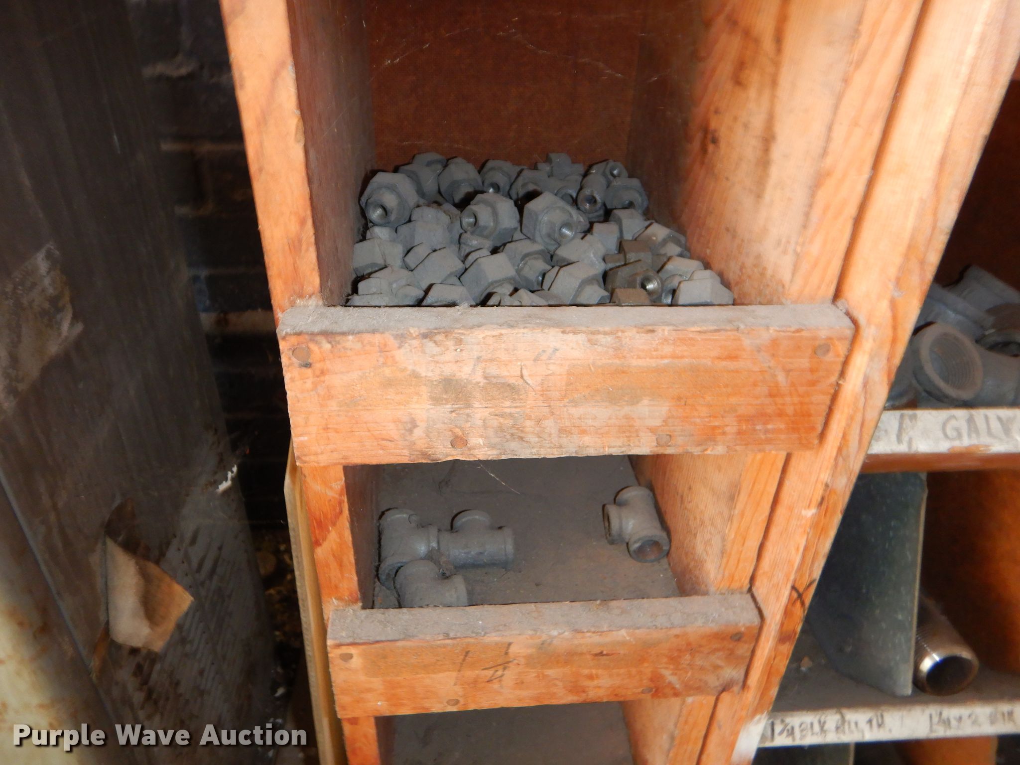 Purple Wave is selling a used Pipe in Kansas. This item is a Fittings with the following: Rubber couplers, Black fittings, Galvanized fittings, Copper/brass fittings, Valves, Wood shelving and more, Item must be removed by December 11