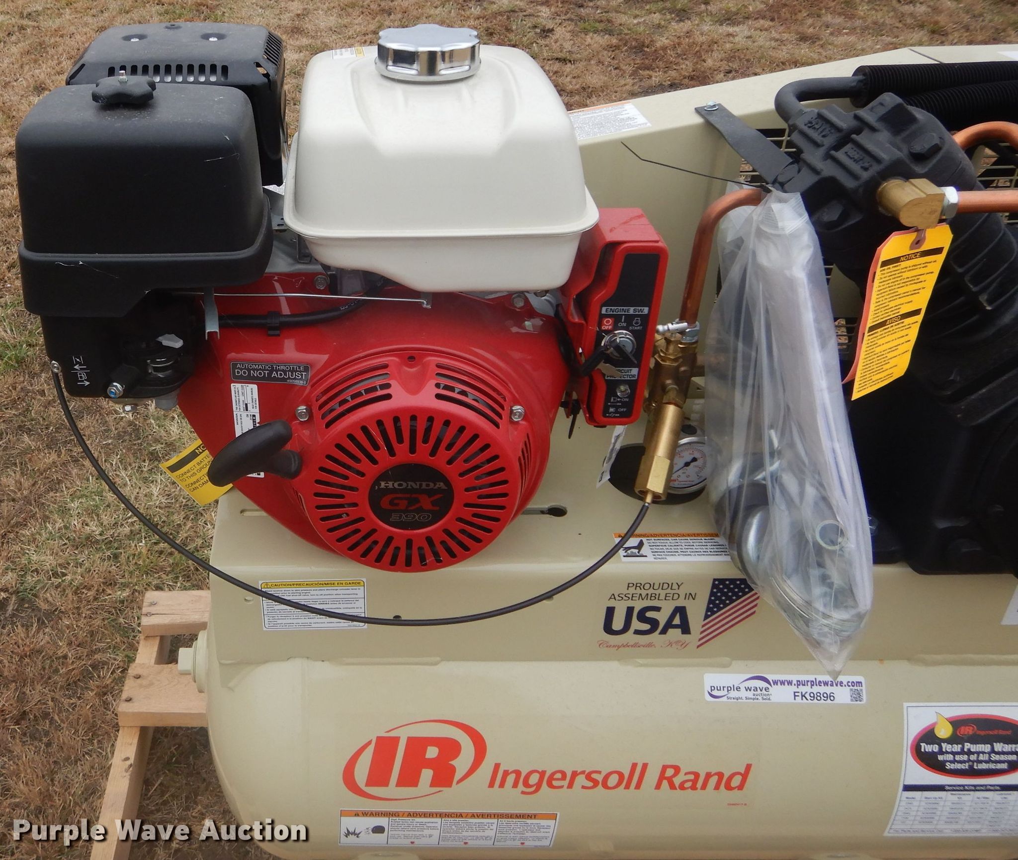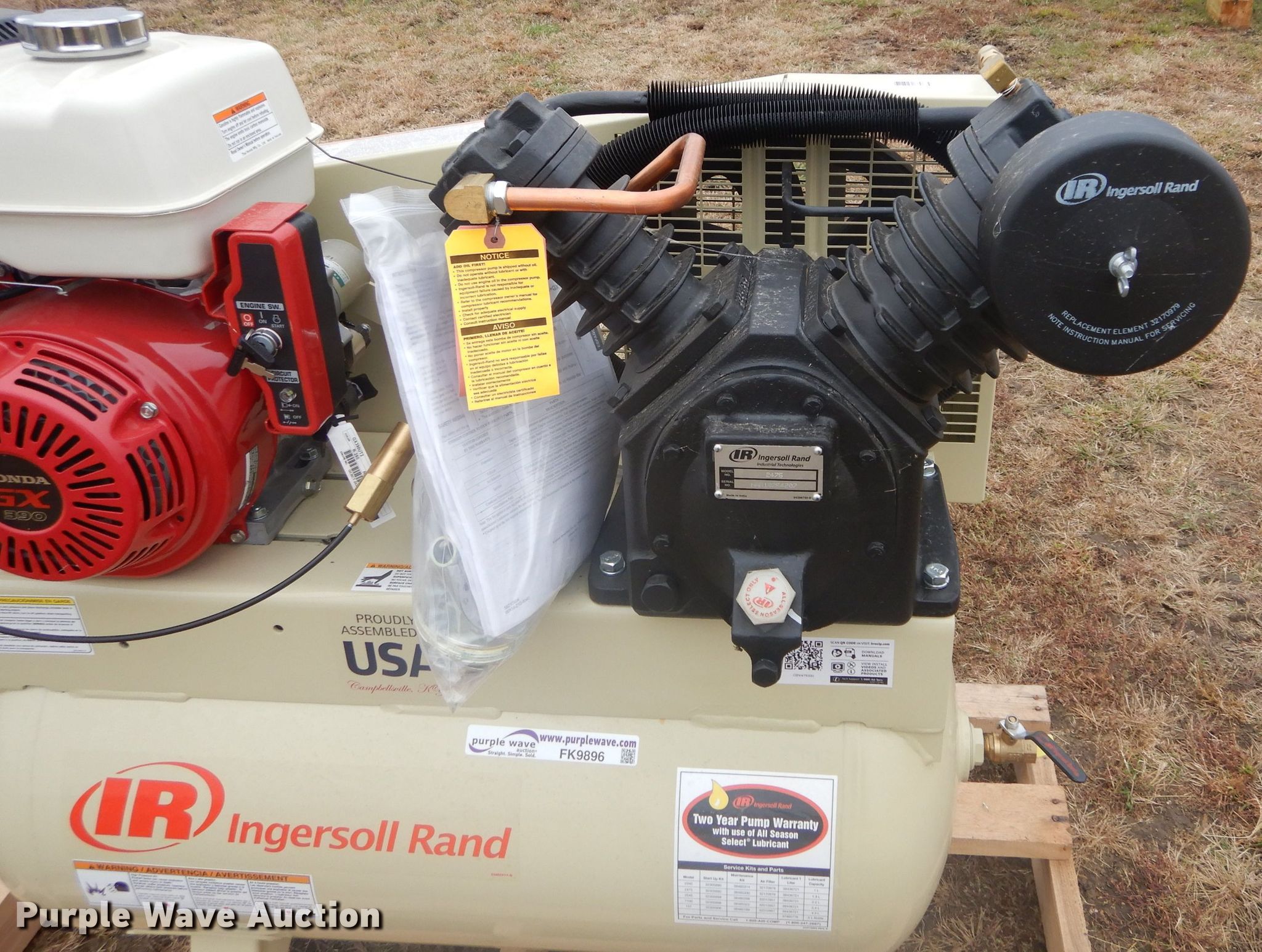 Purple Wave is selling a used Air Compressor in Oklahoma. This item is a Ingersoll Rand 2475 air compressor with the following: Honda GX390 single cylinder gas engine, 30 gallon tank, 175 max psi, Serial CBV475330