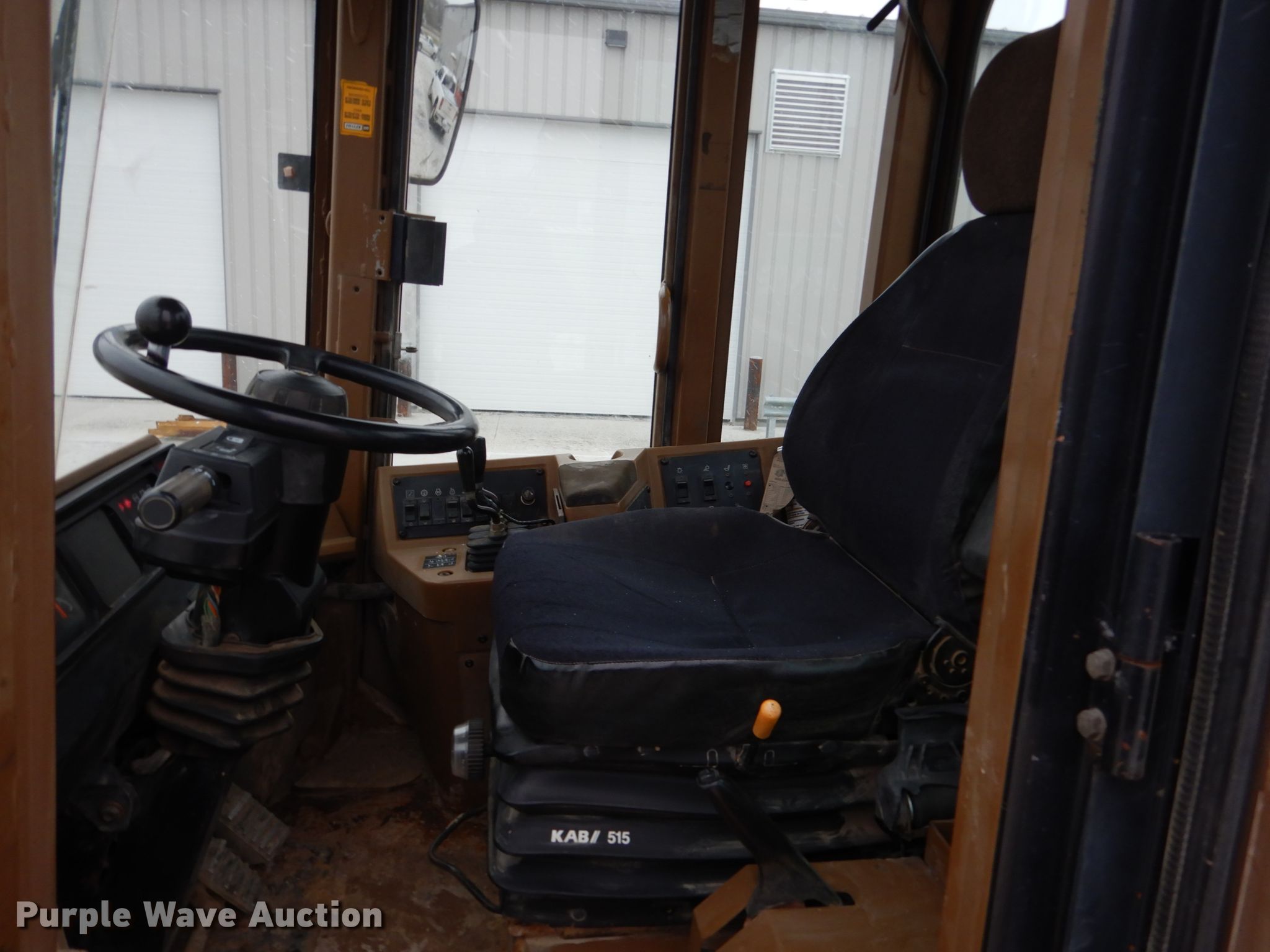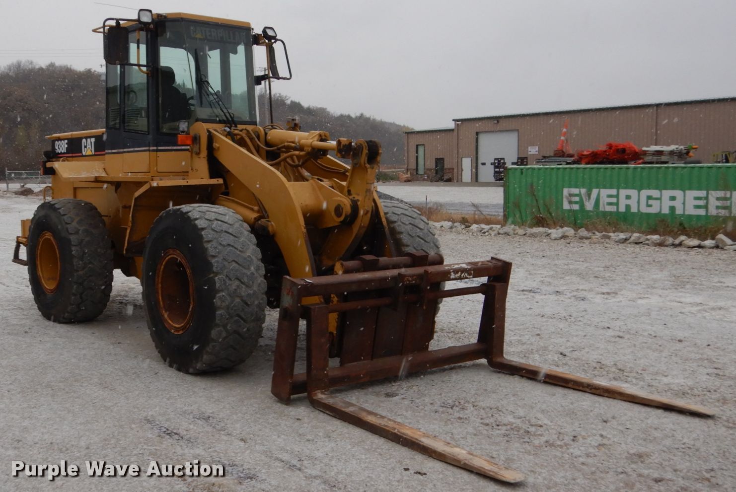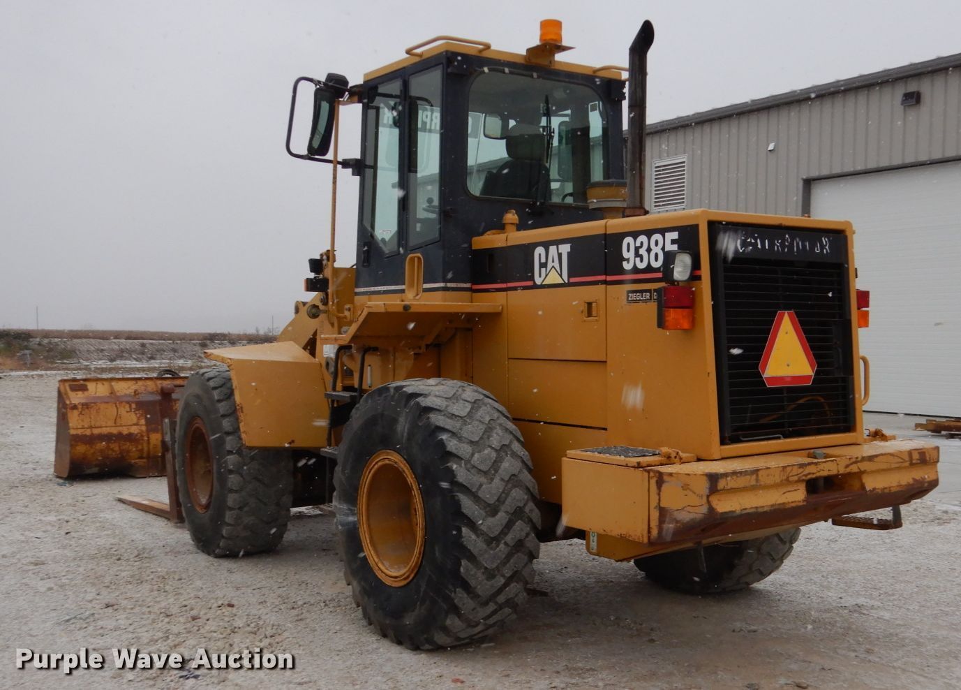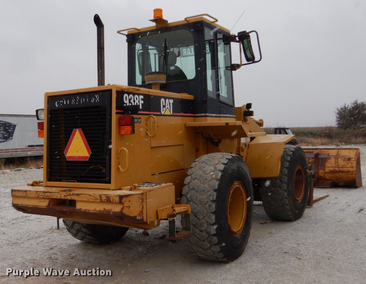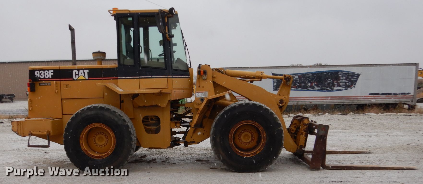Purple Wave is selling a used Wheel Loader in Iowa. This item is a 1996 Caterpillar 938F wheel loader with the following: 6,693 hours on meter, Caterpillar 3116 six cylinder diesel engine, Powershift transmission, 4F-4R gears, Enclosed cab, Heat, Two-lever bucket controls, 105"W bucket, Bolt-on cutting edge, 68"L pallet forks, Hydraulic quick coupler, Auxiliary hydraulics, 20.5-25 tires, Serial 1KM01577