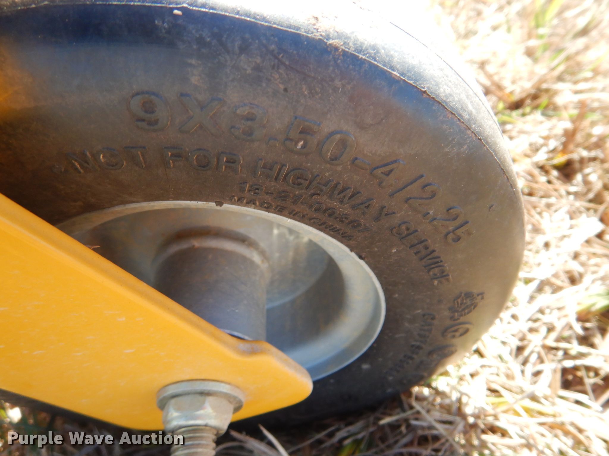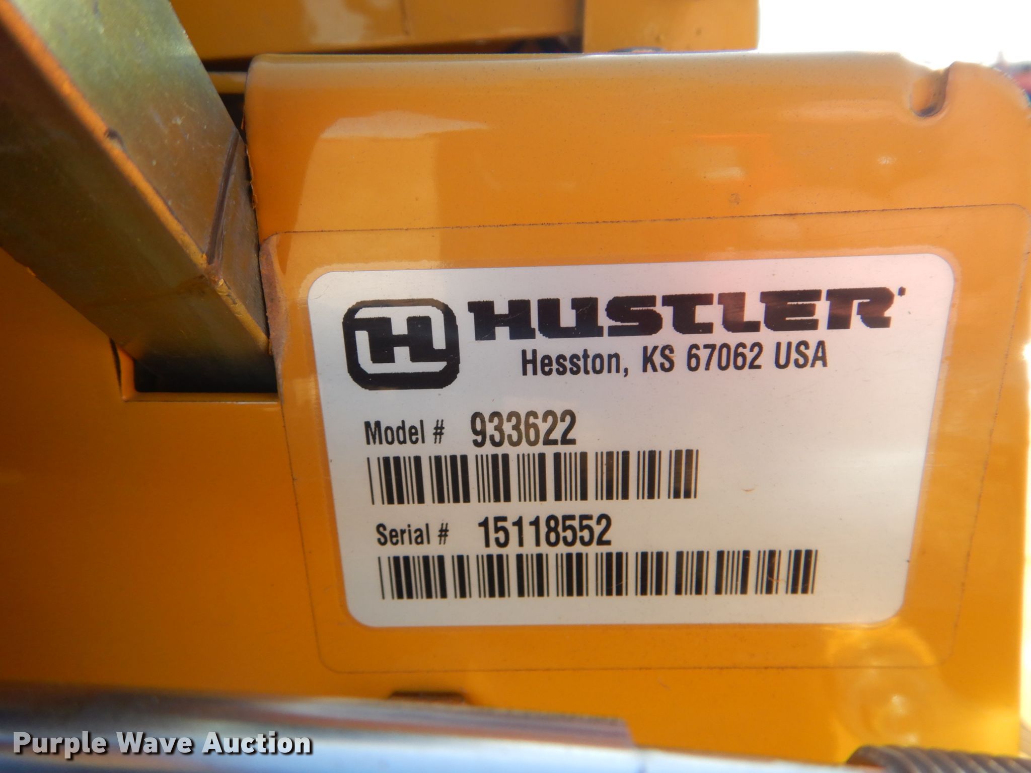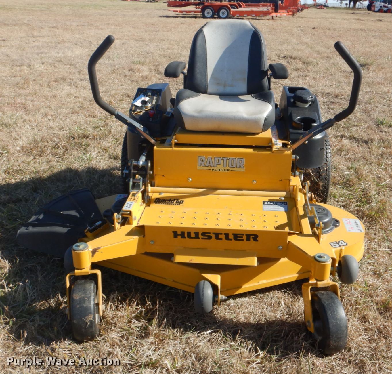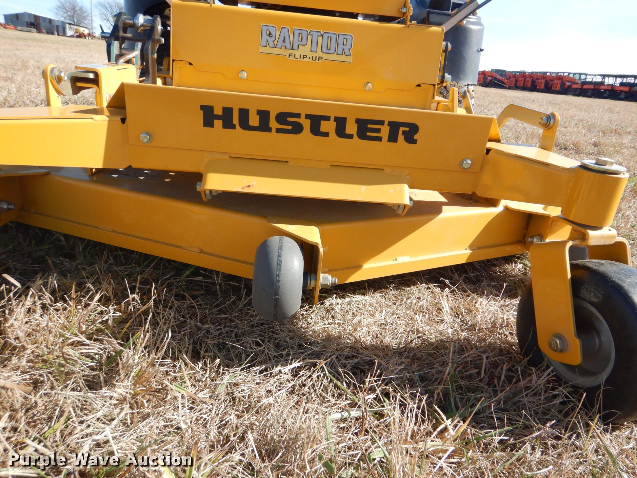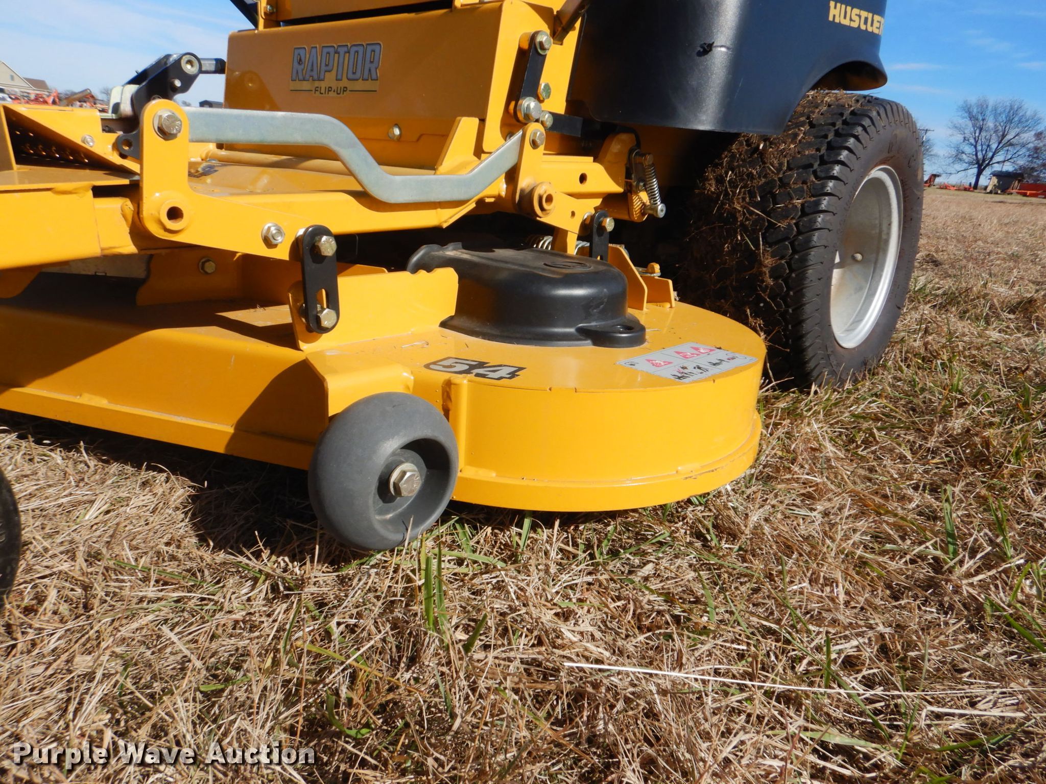 Purple Wave is selling a used Lawn Mower in Oklahoma. This item is a 2019 Hustler Raptor Flip-Up 933622 ZTR lawn mower with the following: 6 hours on meter, 54" cut, Kohler KT740 725cc two cylinder gas engine, 25 HP, Hydrostatic transmission, Hydraulic deck fold, 9x3.50-4.2.25 front tires, 20x10.00-10 NHS rear tires, Full limited warranty for four years or 400 hours from the date of purchase, Serial 15118552