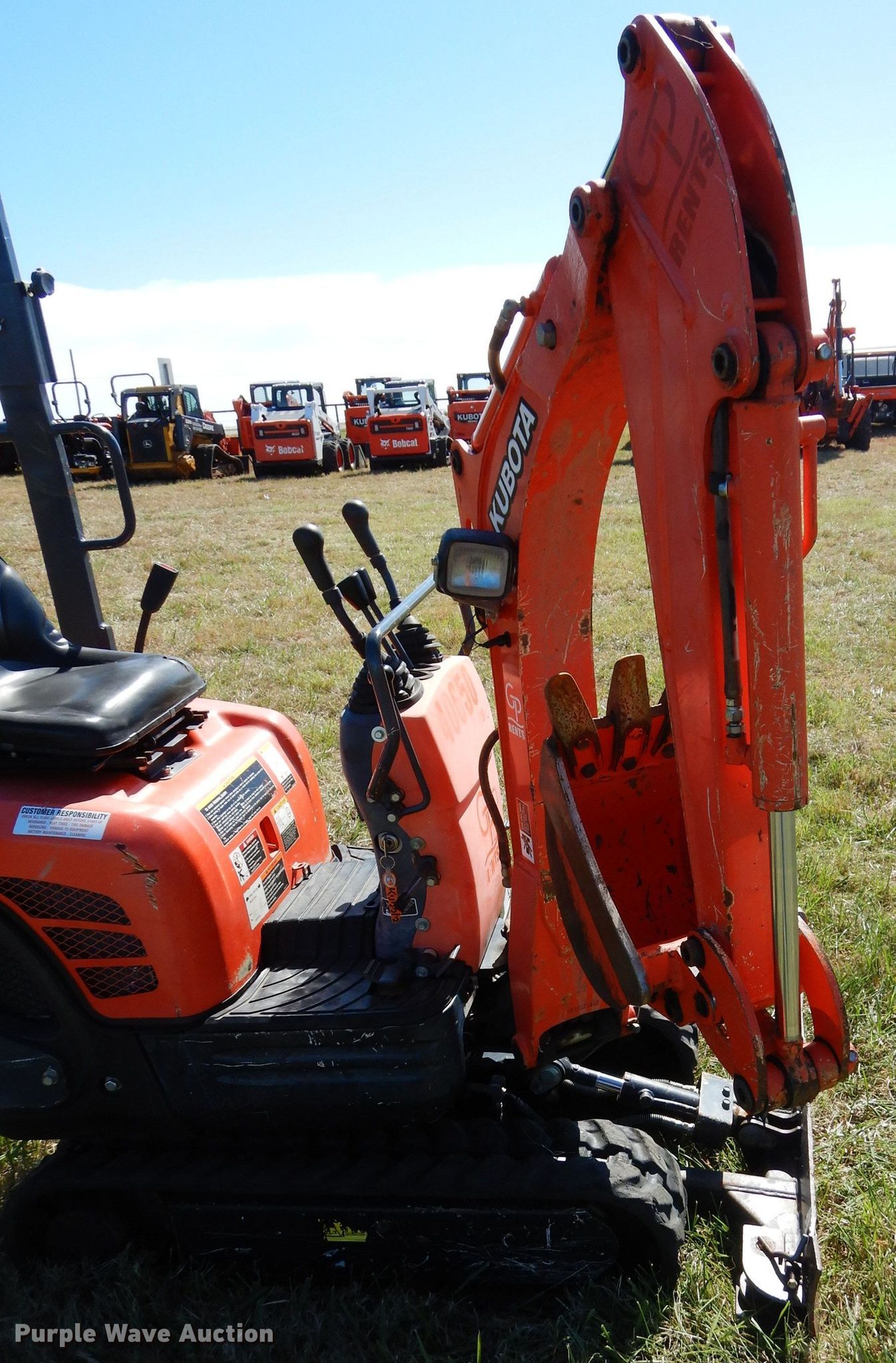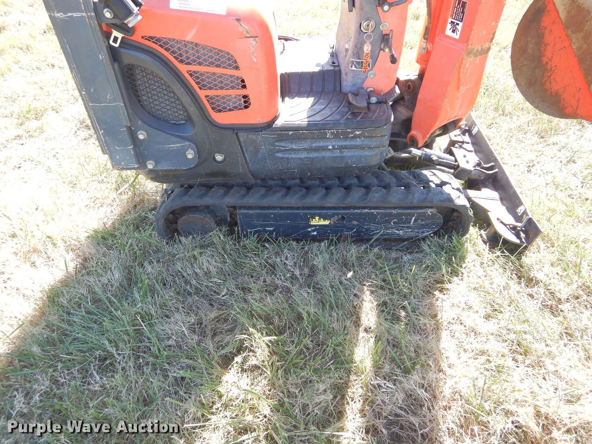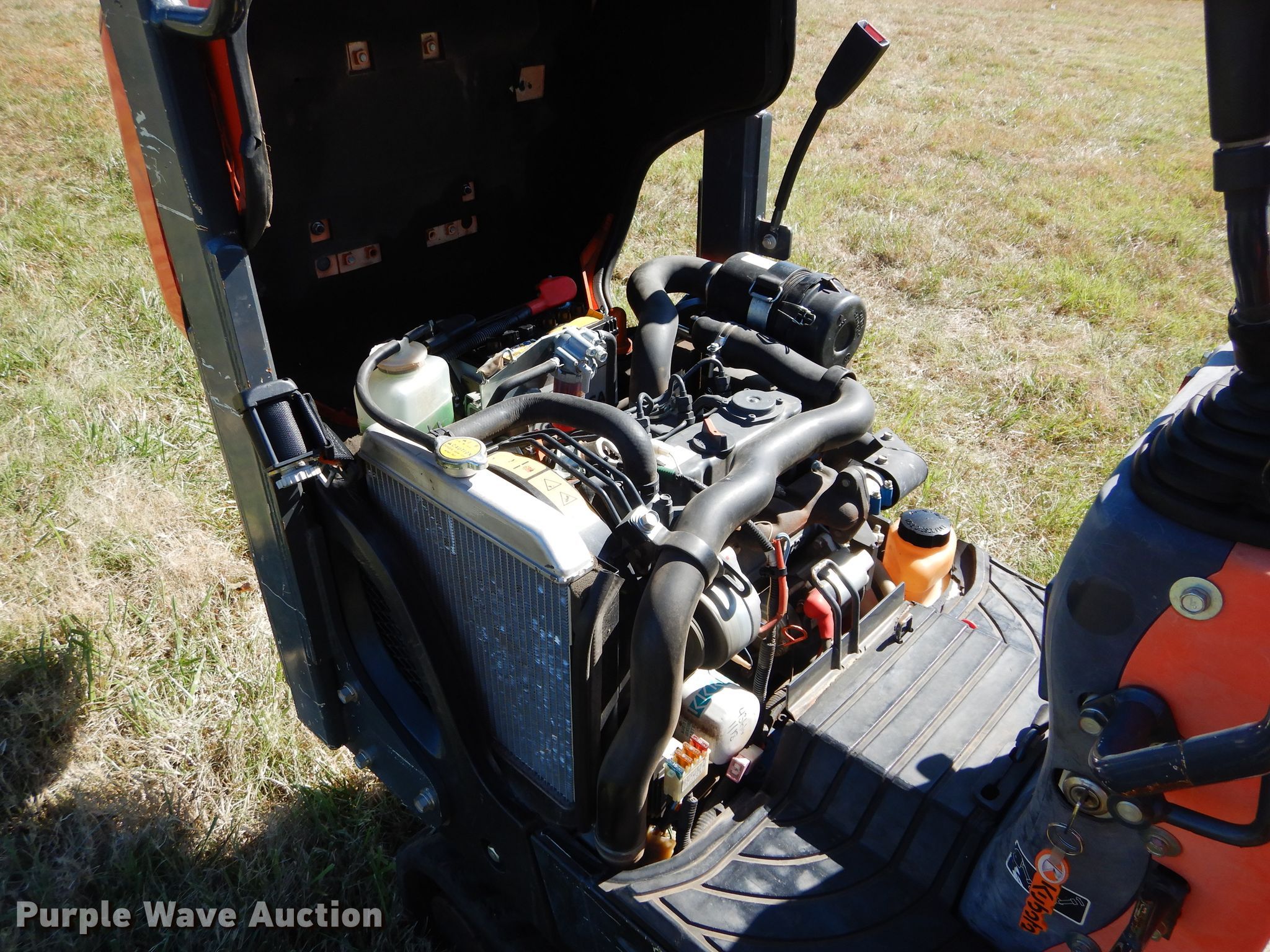 Purple Wave is selling a used Mini Excavator in Oklahoma. This item is a 2014 Kubota K008-3 mini excavator with the following: 709 hours on meter, Kubota D722-EF14 0.72L three cylinder diesel engine, 7.7 kW, Serial 4EE4935, Hydrostatic transmission, Two post ROPS, Pattern changer, 28"W backfill blade, Standard boom, 32" stick length, Kubota 10"W bucket, Bolt-on cutting edge, (3) teeth, 7"W rubber tracks, Serial 40650
