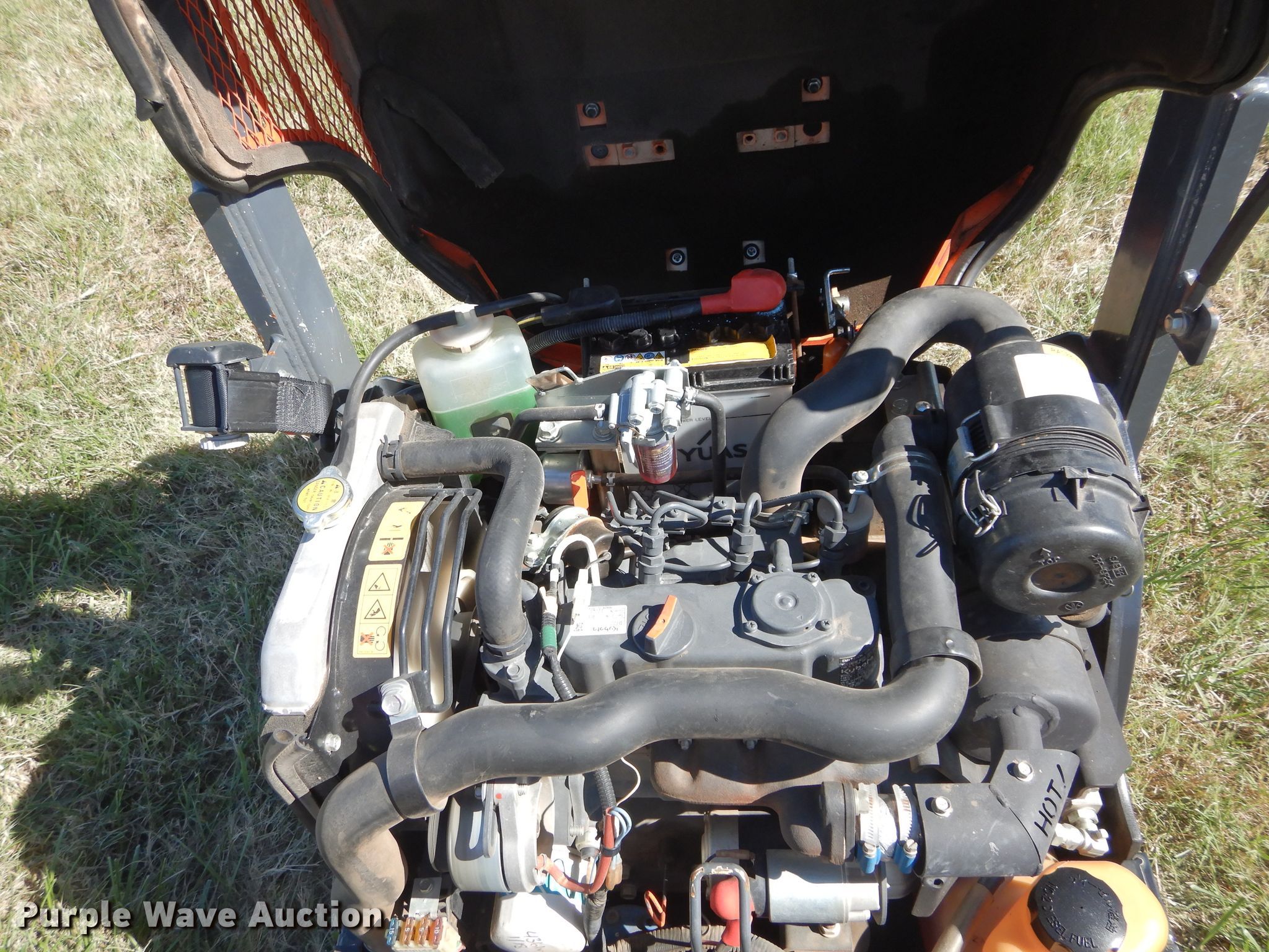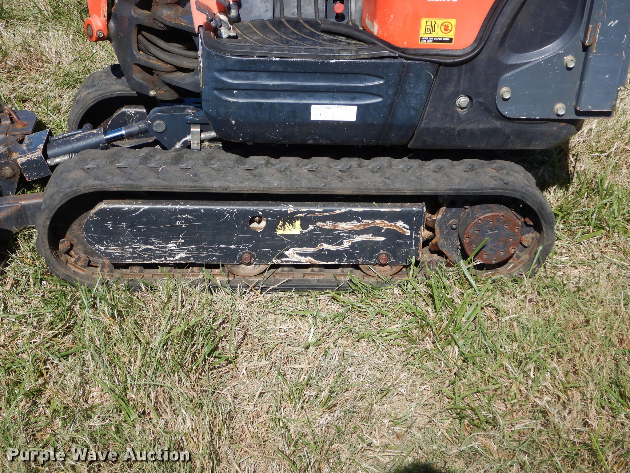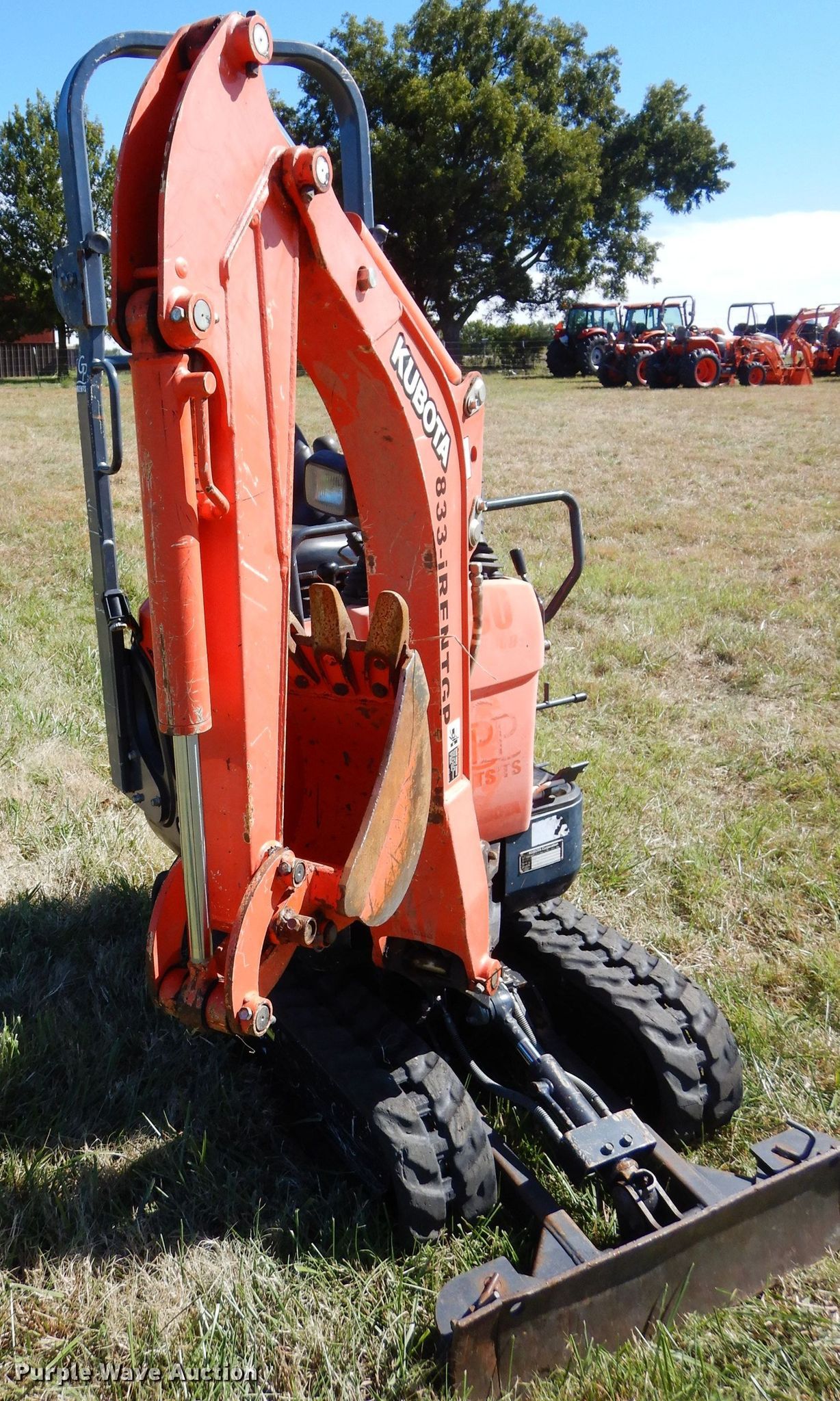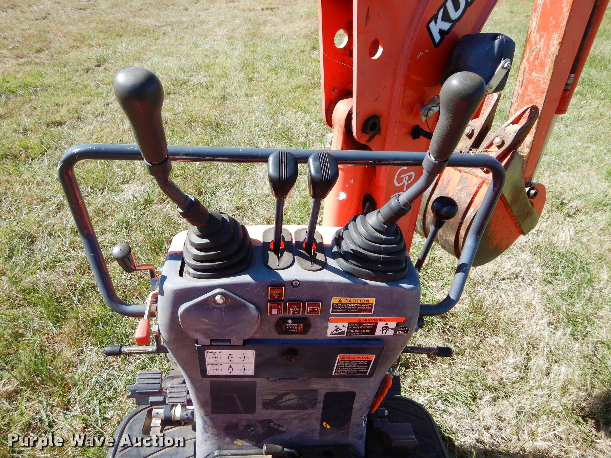 Purple Wave is selling a used Mini Excavator in Oklahoma. This item is a 2014 Kubota K008-3 mini excavator with the following: 709 hours on meter, Kubota D722-EF14 0.72L three cylinder diesel engine, 7.7 kW, Serial 4EE4935, Hydrostatic transmission, Two post ROPS, Pattern changer, 28"W backfill blade, Standard boom, 32" stick length, Kubota 10"W bucket, Bolt-on cutting edge, (3) teeth, 7"W rubber tracks, Serial 40650