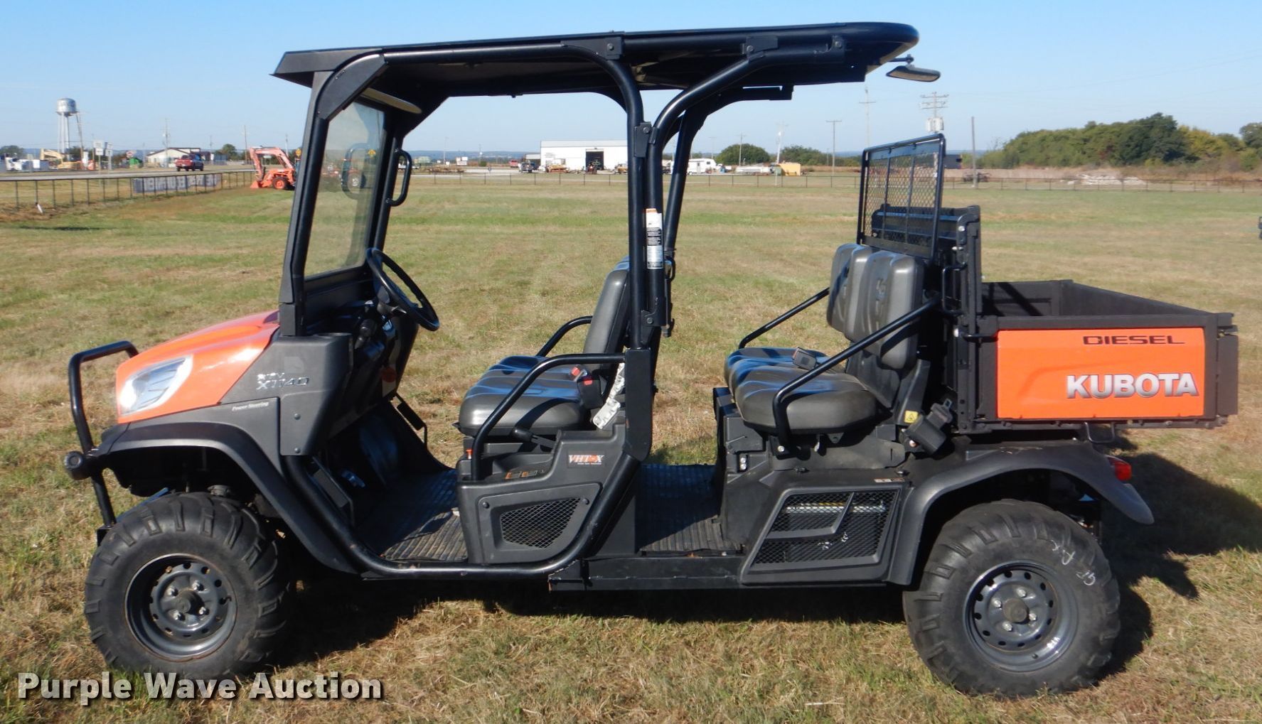 Purple Wave is selling a used Utility Vehicle in Oklahoma. This item is a 2018 Kubota RTV-X1140 utility vehicle with the following: 2,454 miles on odometer, 339 hours on meter, Kubota D1105-EF02 1.1L three cylinder diesel engine, 18.2 kW, Serial 1JE4315, Two speed hydrostatic transmission, Four wheel drive, Differential lock, OROPS, Four passenger capacity, 50"L x 60"W dump bed, Electric/hydraulic dump, OTR 25x10.00-12 NHS tires