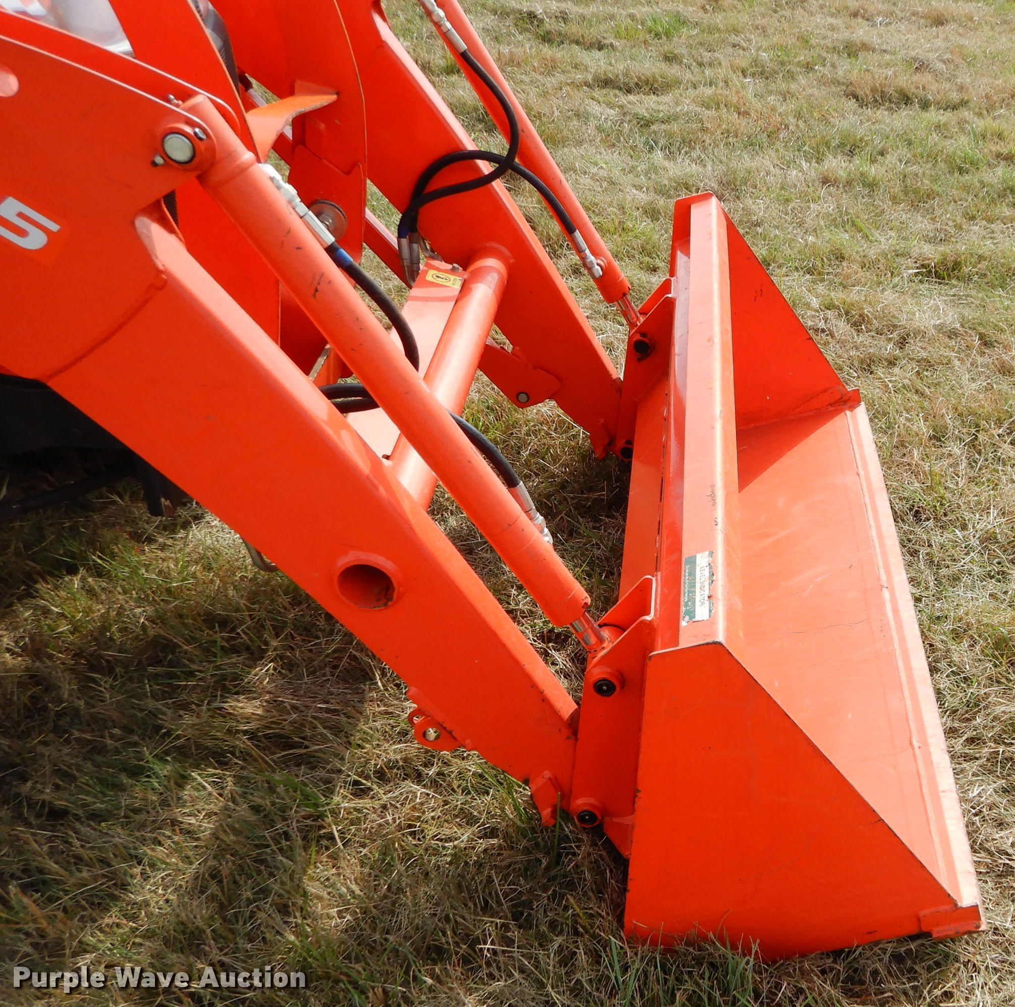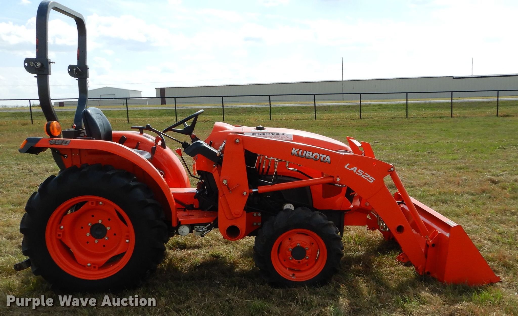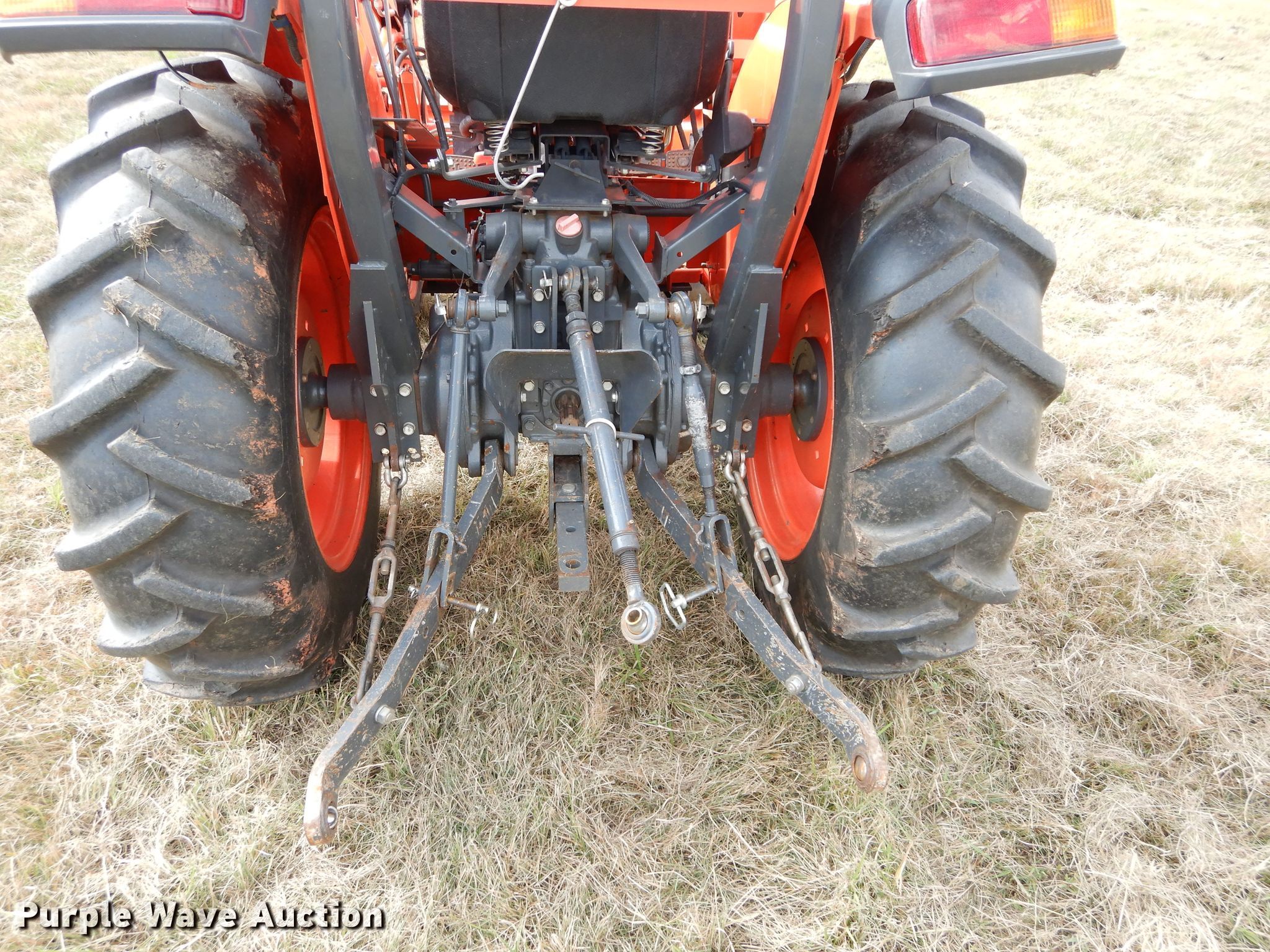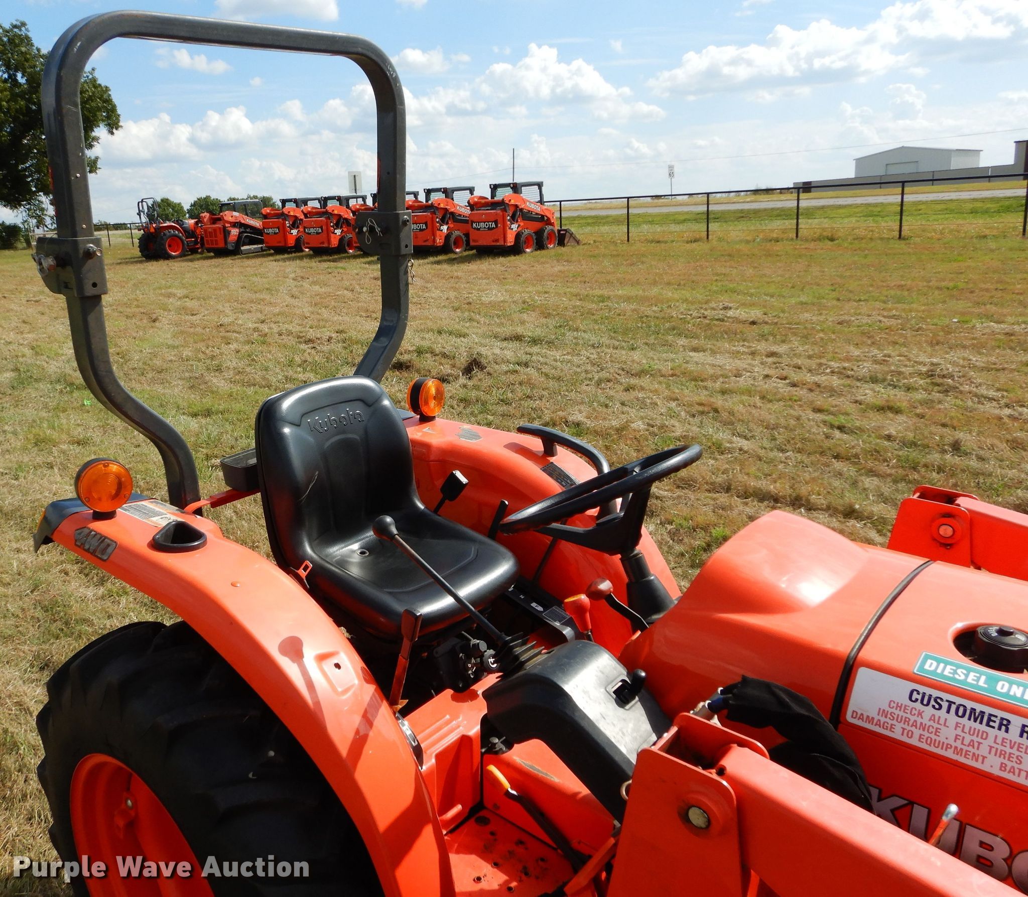 Purple Wave is selling a used Tractor in Oklahoma. This item is a 2017 Kubota L3301D MFWD tractor with the following: 693 hours on meter, Kubota TC10-15300 1.8L three cylinder diesel engine, 33 HP, Serial 7FV4399, Synchro transmission, 8F-8R gears, Left-hand reverser, Differential lock, Two post ROPS, Kubota LA525 loader, Kubota L2242 bucket, 60"W, Joystick controls, Three point, Top link, 540 PTO, 67" wheelbase, Goodyear 7.2-16 front tires, Titan 11.2-24 rear tires, Serial 60364