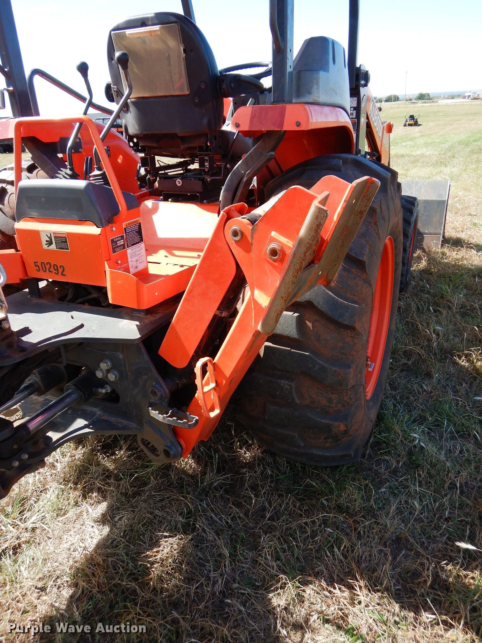 Purple Wave is selling a used Tractor Loader Backhoe in Oklahoma. This item is a 2018 Kubota M62 backhoe with the following: 644 hours on meter, Kubota V2403-CR-T-EF16 2.4L four cylinder diesel engine, 46.3 kW, Three speed hydrostatic transmission, Four wheel drive, Differential lock, OROPS, Wobble stick backhoe controls, Auxiliary electrical outlet, Kubota TL1800 loader bucket, 84"W, Bolt-on cutting edge, Backhoe model BT1400, Auxiliary hydraulics, Hydraulic thumb, Kubota 24"W bucket, Bolt-on cutting edge, (5) teeth, Serial A0358, Titan 10-16.5 NHS front tires, Titan 17.5L-24 rear tires, Serial 50292