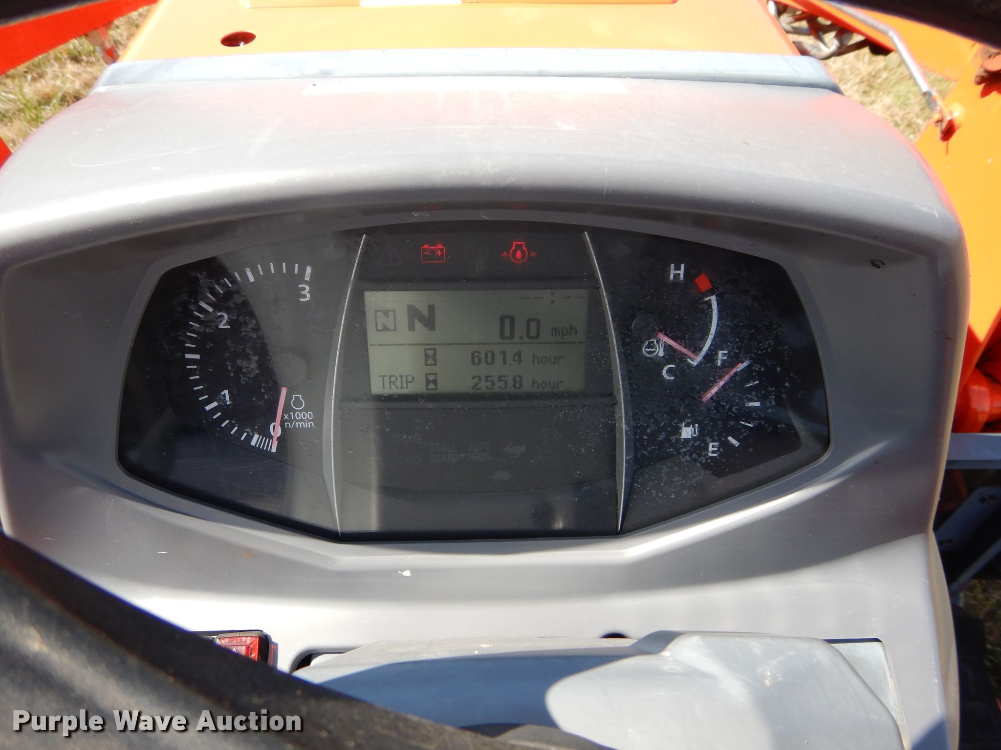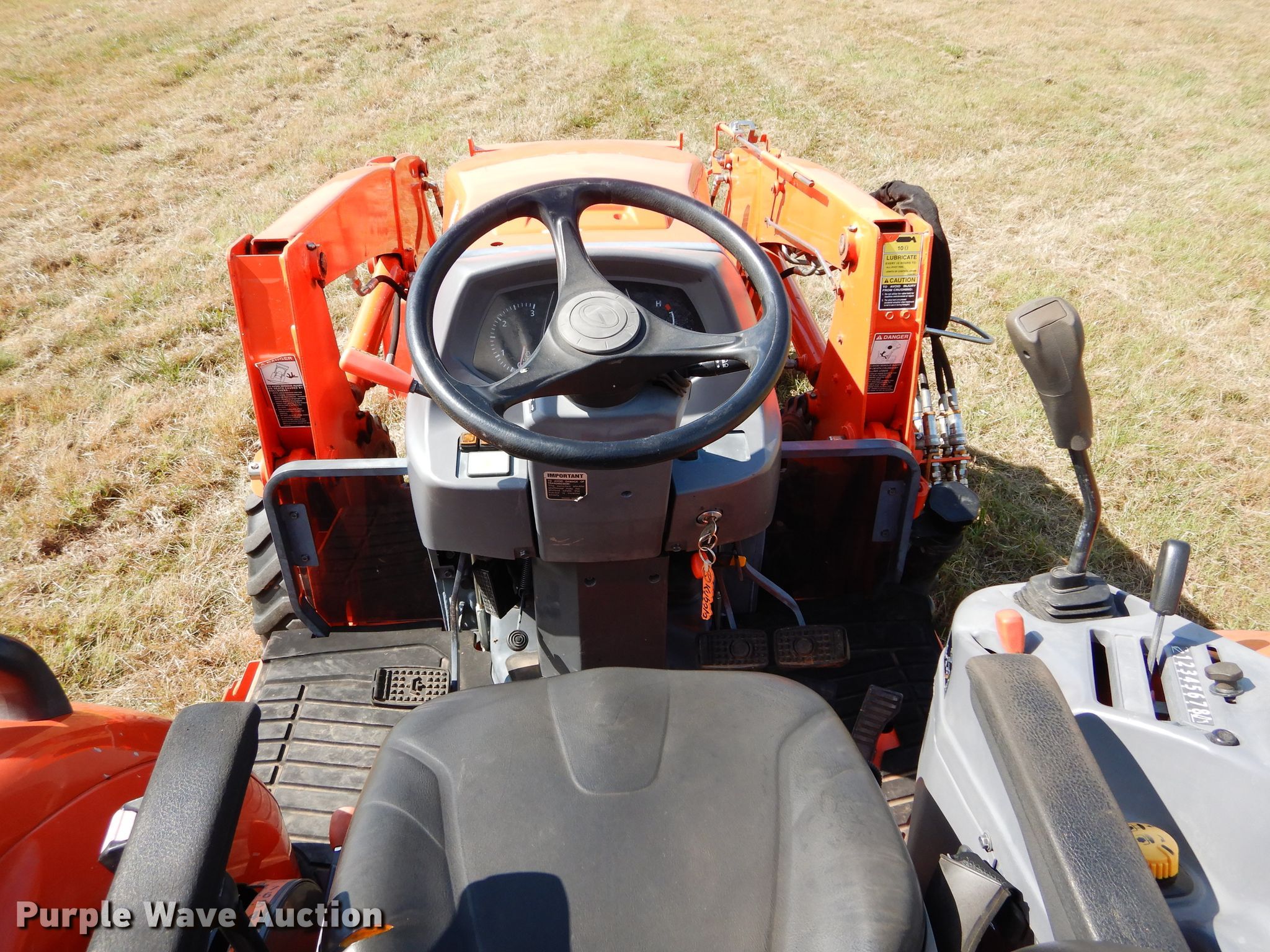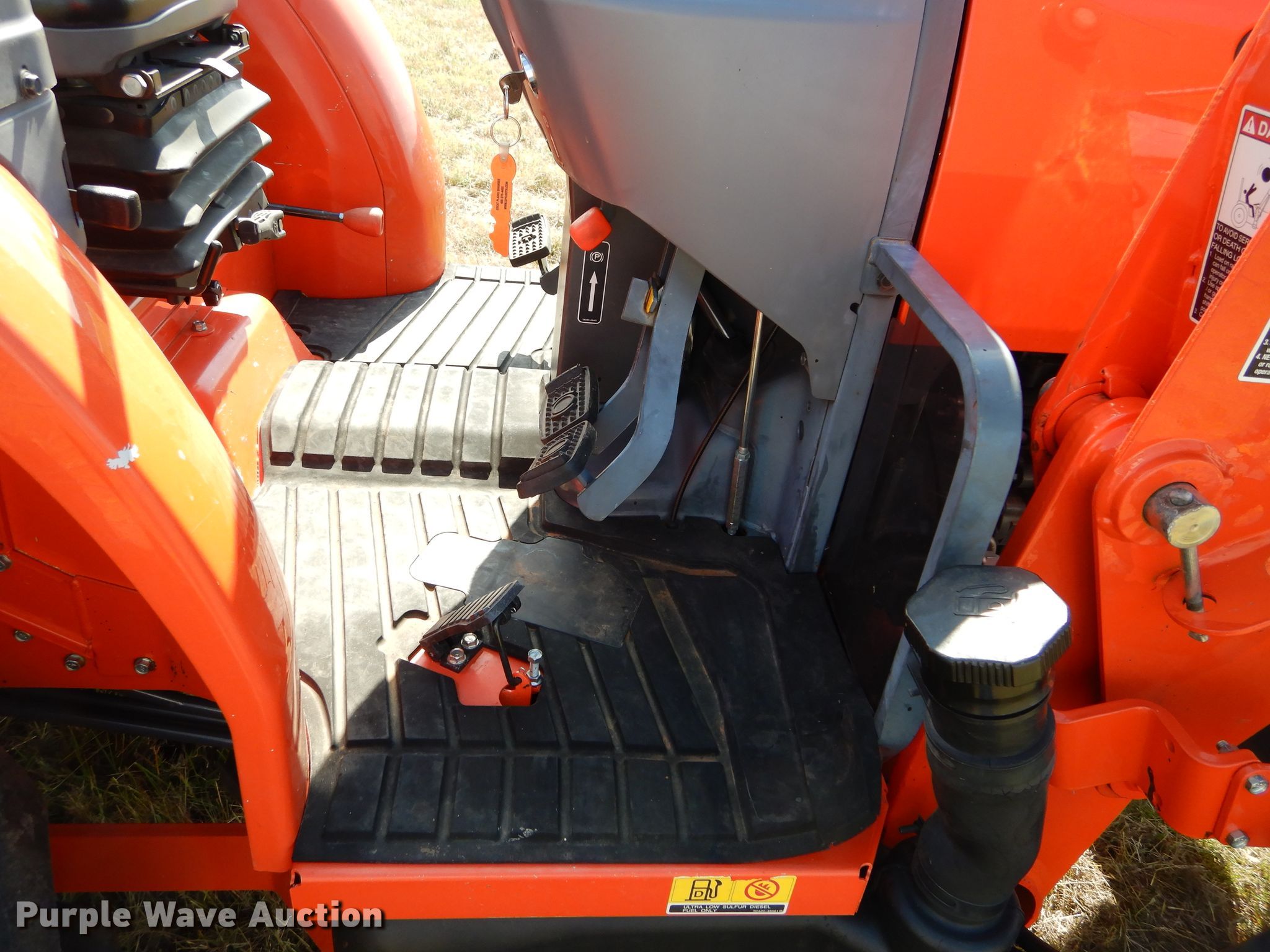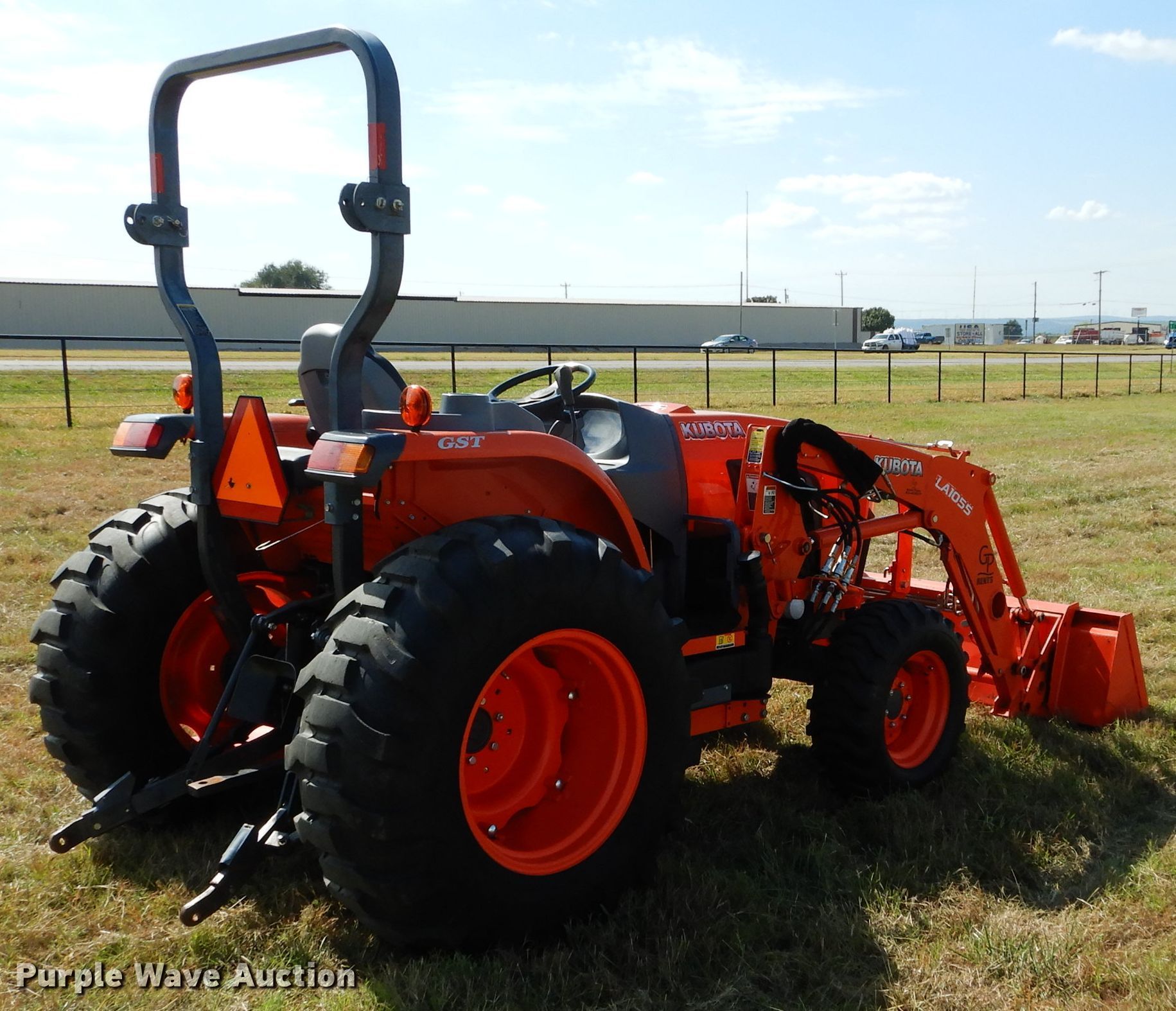 Purple Wave is selling a used Tractor in Oklahoma. This item is a 2017 Kubota L4760D MFWD tractor with the following: 602 hours on meter, Kubota 2.4L four cylinder diesel engine, 49 HP, Glide transmission, 12F-8R gears, Left-hand reverser, Two post ROPS, Kubota LA1055 loader, Kubota L2256 bucket, 66"W, Quick attach, Joystick controls, Three point, 540 PTO, 75" wheelbase, Titan 10-16.5 NHS front tires, Titan 17.5-24 rear tires, Serial 30835