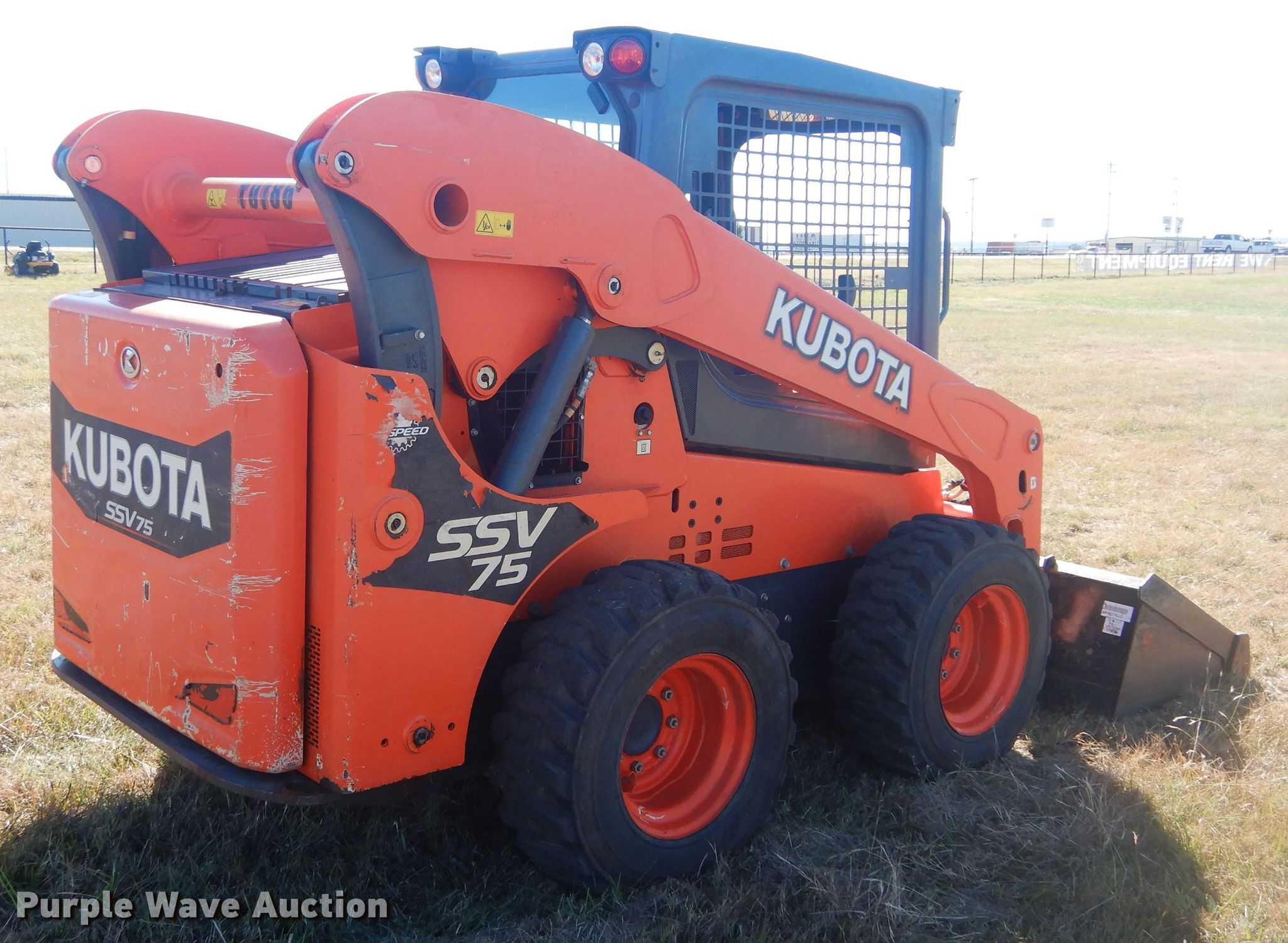 Purple Wave is selling a used Skid Steer Loader in Oklahoma. This item is a 2016 Kubota SSV75 skid steer with the following: 810 hours on meter, Kubota E3307-CR-T-EF02 3.3L four cylinder diesel engine, Serial JKBXL03.3EKD, Two speed hydrostatic transmission, OROPS, Foot bucket controls, Auxiliary hydraulics, Manual quick coupler, 68"W bucket, Bolt-on cutting edge, 12-16.5 tires, Serial 10786