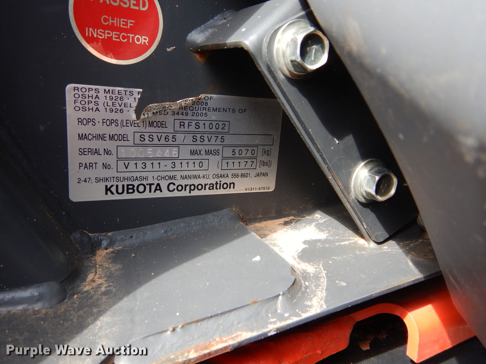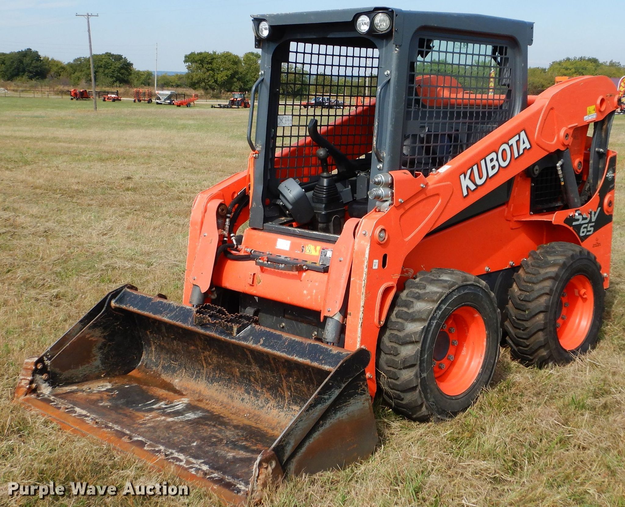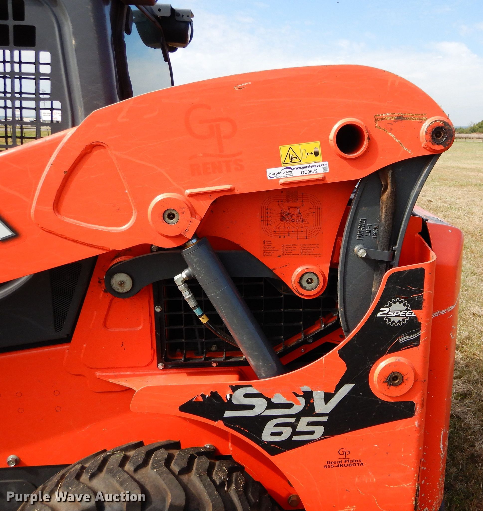 Purple Wave is selling a used Skid Steer Loader in Oklahoma. This item is a 2017 Kubota SSV65 skid steer with the following: 700 hours on meter, Kubota V2607-VR-T-EF08 2.6L four cylinder diesel engine, Hydrostatic transmission, OROPS, Hand bucket controls, Auxiliary hydraulics, Manual quick coupler, 68"W bucket, Bolt-on cutting edge, 10-16.5 tires, Serial 13215