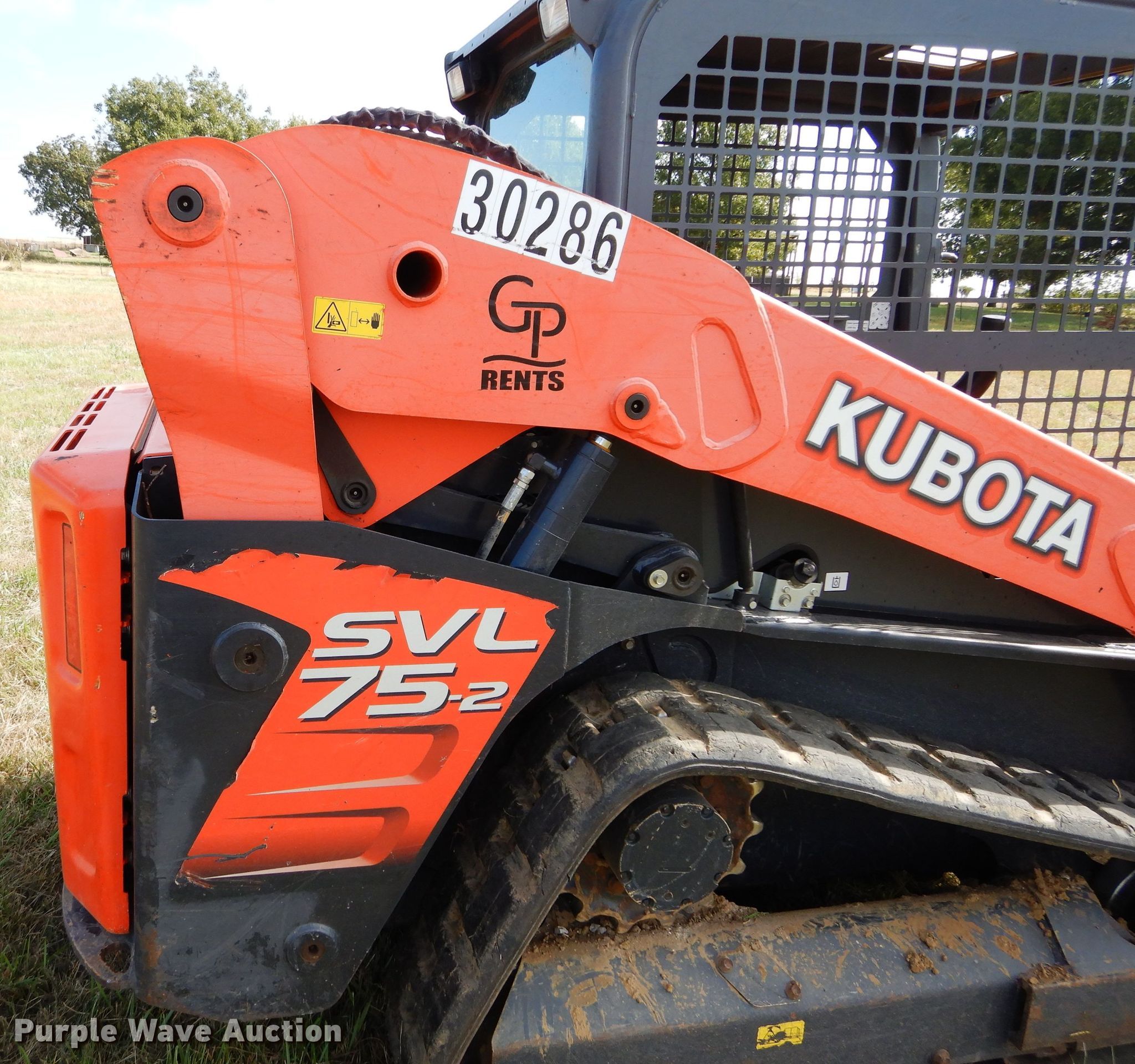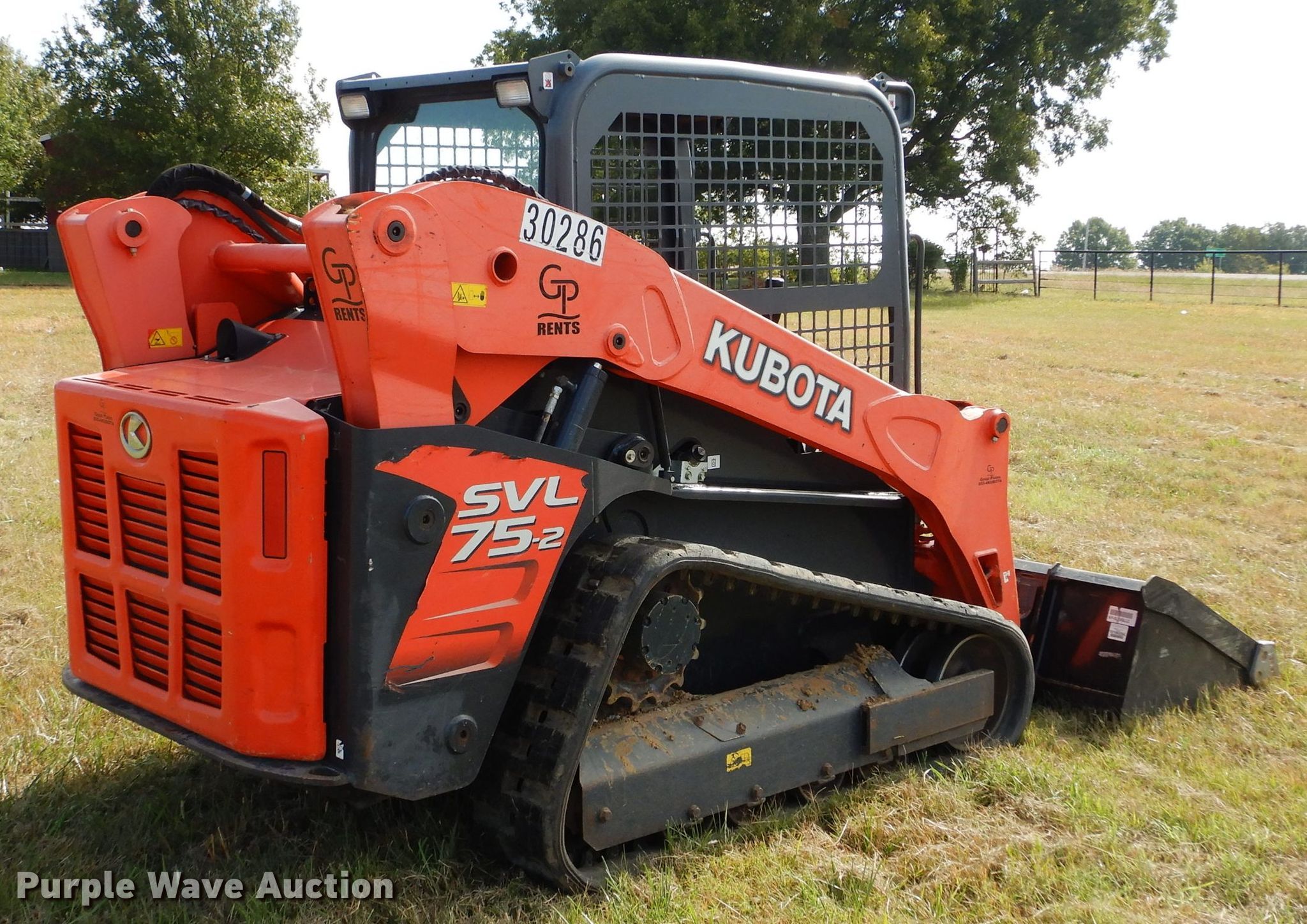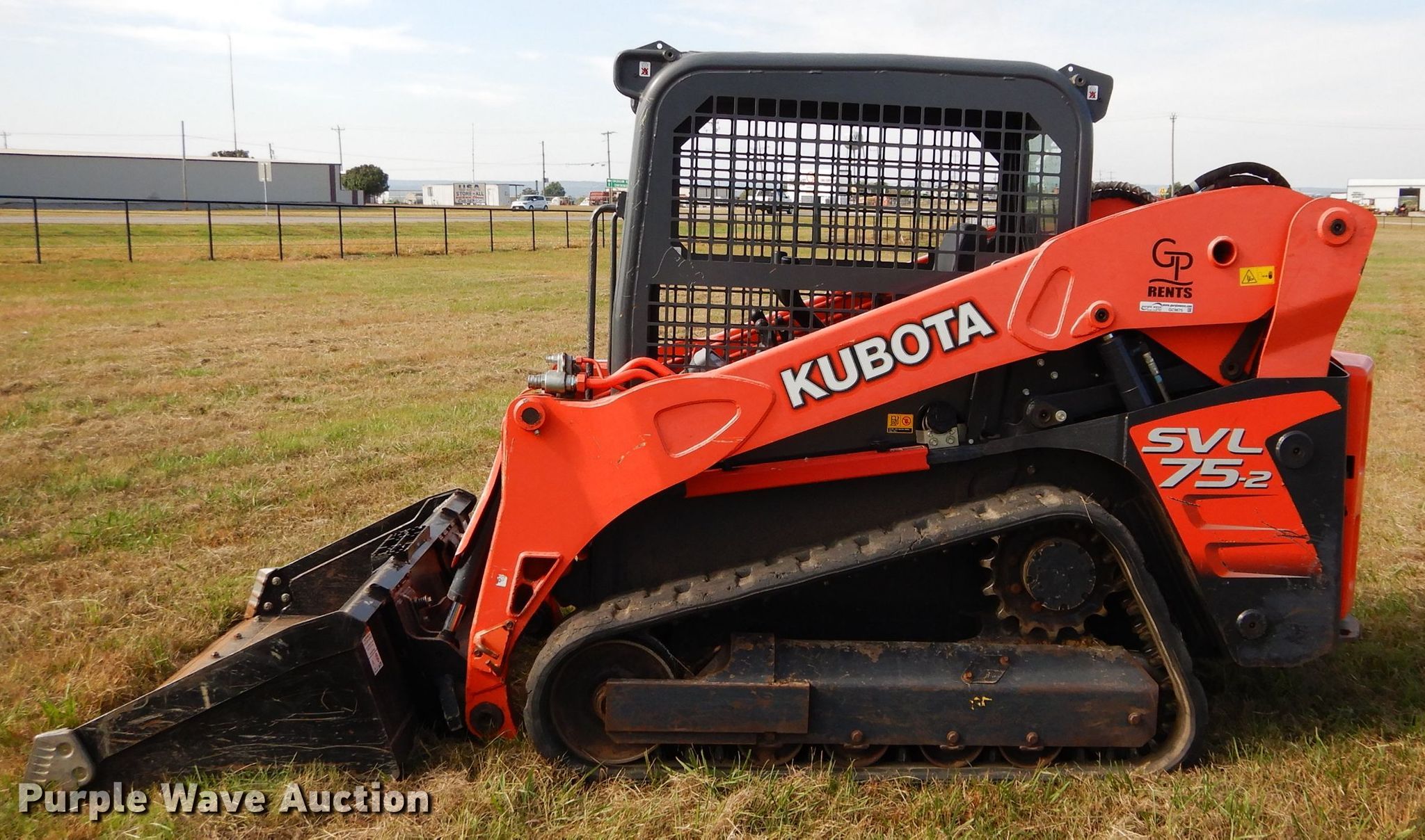 Purple Wave is selling a used Tracked Skid Steer Loader in Oklahoma. This item is a 2015 Kubota SVL75-2 skid steer with the following: 640 hours on meter, Kubota V3307-CT-T-EF04 3.3L four cylinder diesel engine, Serial FKBXL03.3EKD, Hydrostatic transmission, Open station/canopy, Hand bucket controls, 68"W bucket, Bolt-on cutting edge, Manual quick coupler, Auxiliary hydraulics, 12"W tracks, Serial 24339