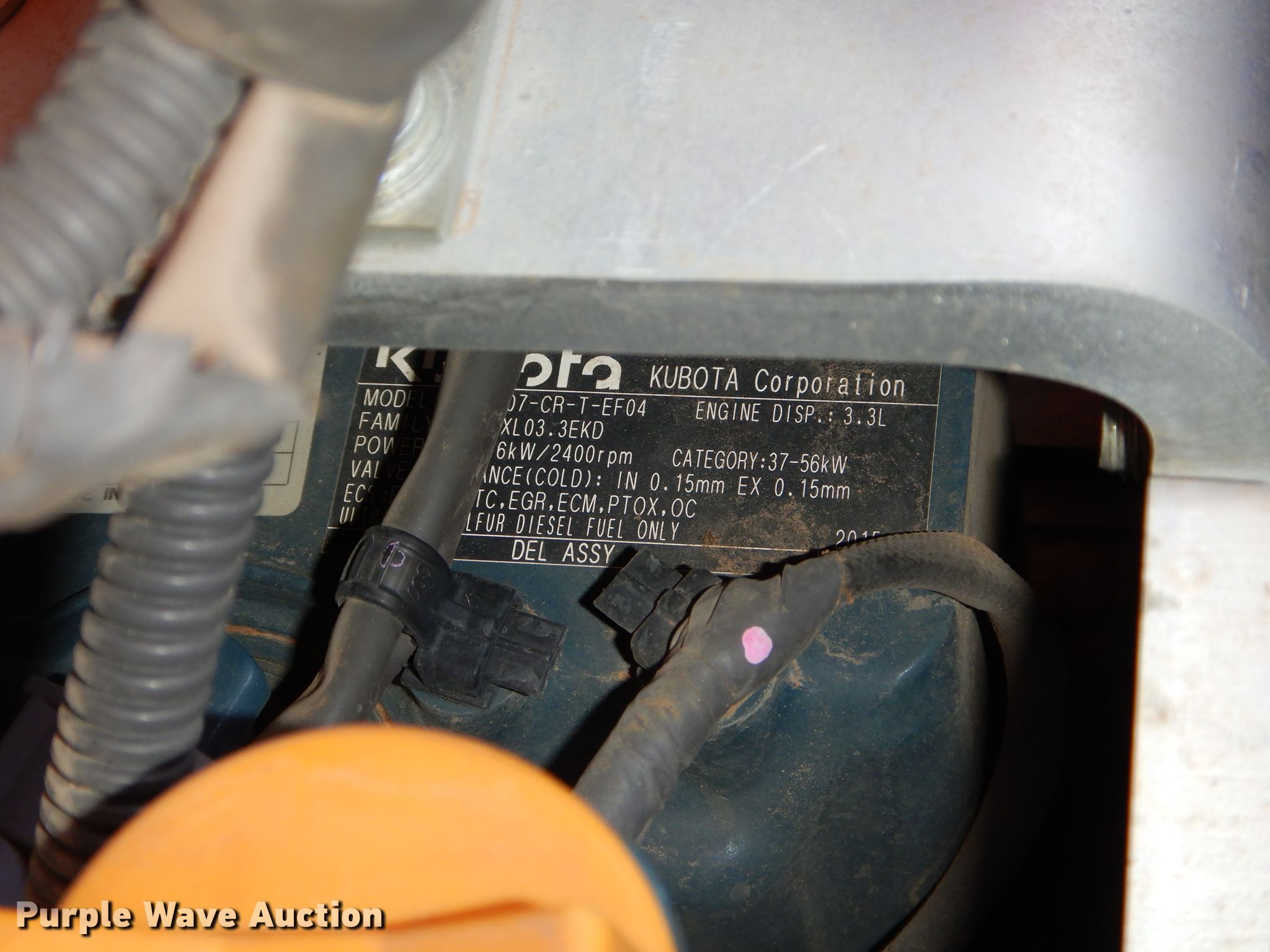 2015 Kubota SVL75-2 skid steer. 640 hours on meter, Kubota V3307-CT-T-EF04 3.3L four cylinder diesel engine Serial FKBXL03.3EKD, Hydrostatic transmission, Open station/canopy Hand bucket controls, 68"W bucket Bolt-on cutting edge, Manual quick coupler, Auxiliary hydraulics, 12"W tracks, Serial 24339. Great Plains Kubota - Open inspection Dec. 7, 9. 90 County Rd. Davis, OK 73030