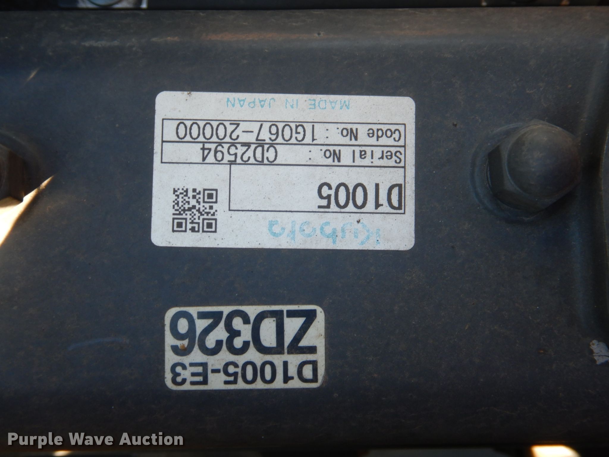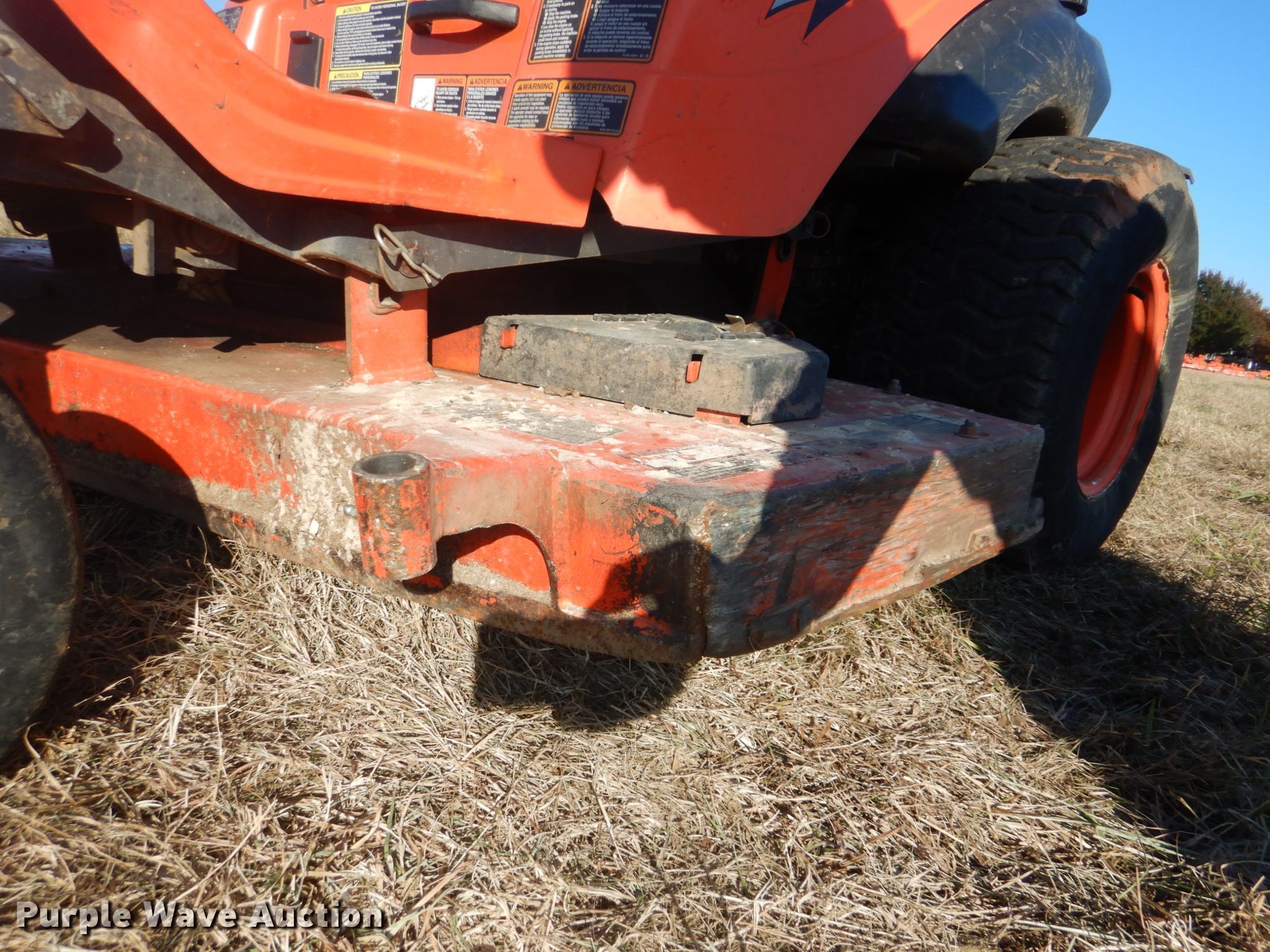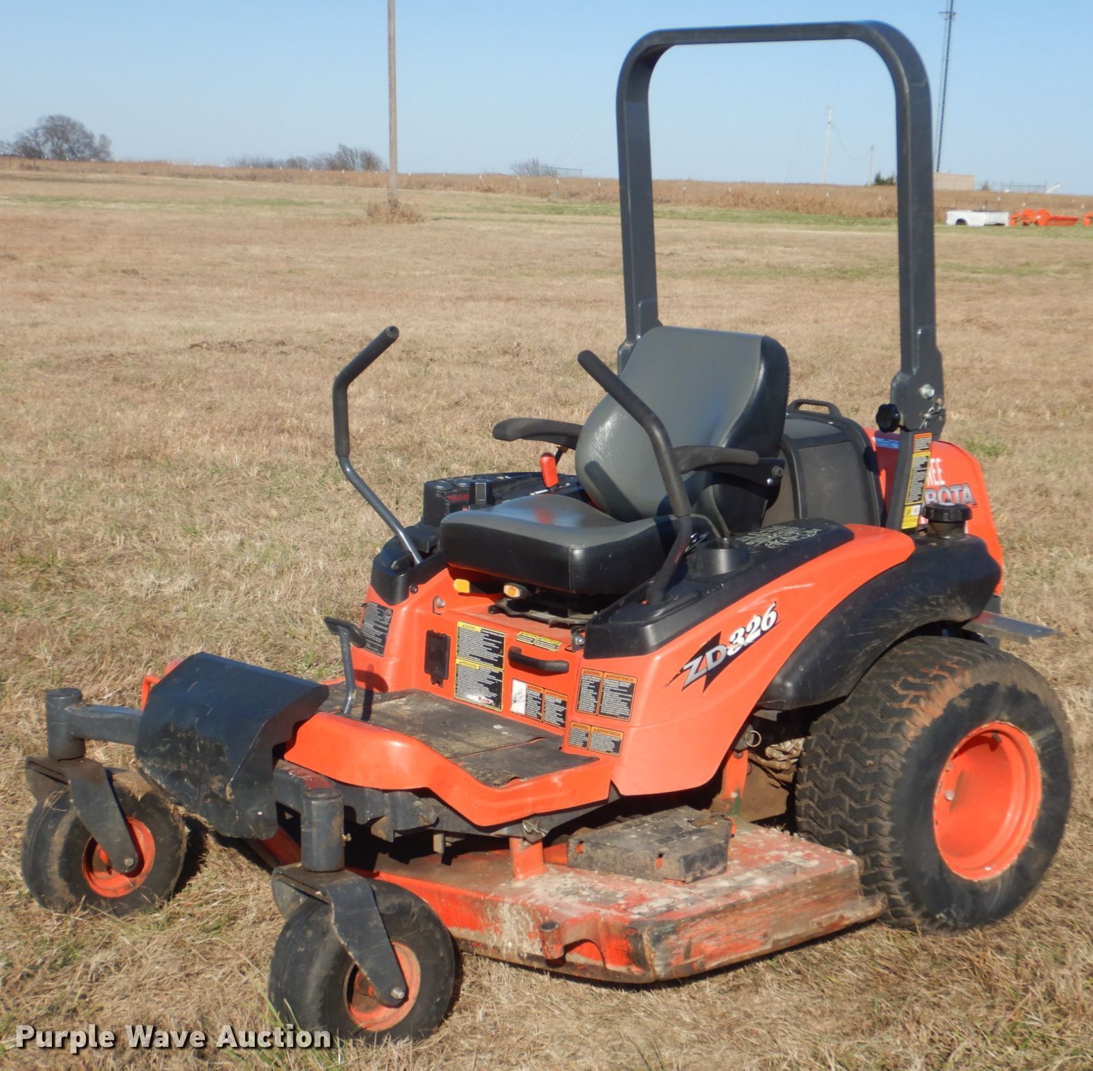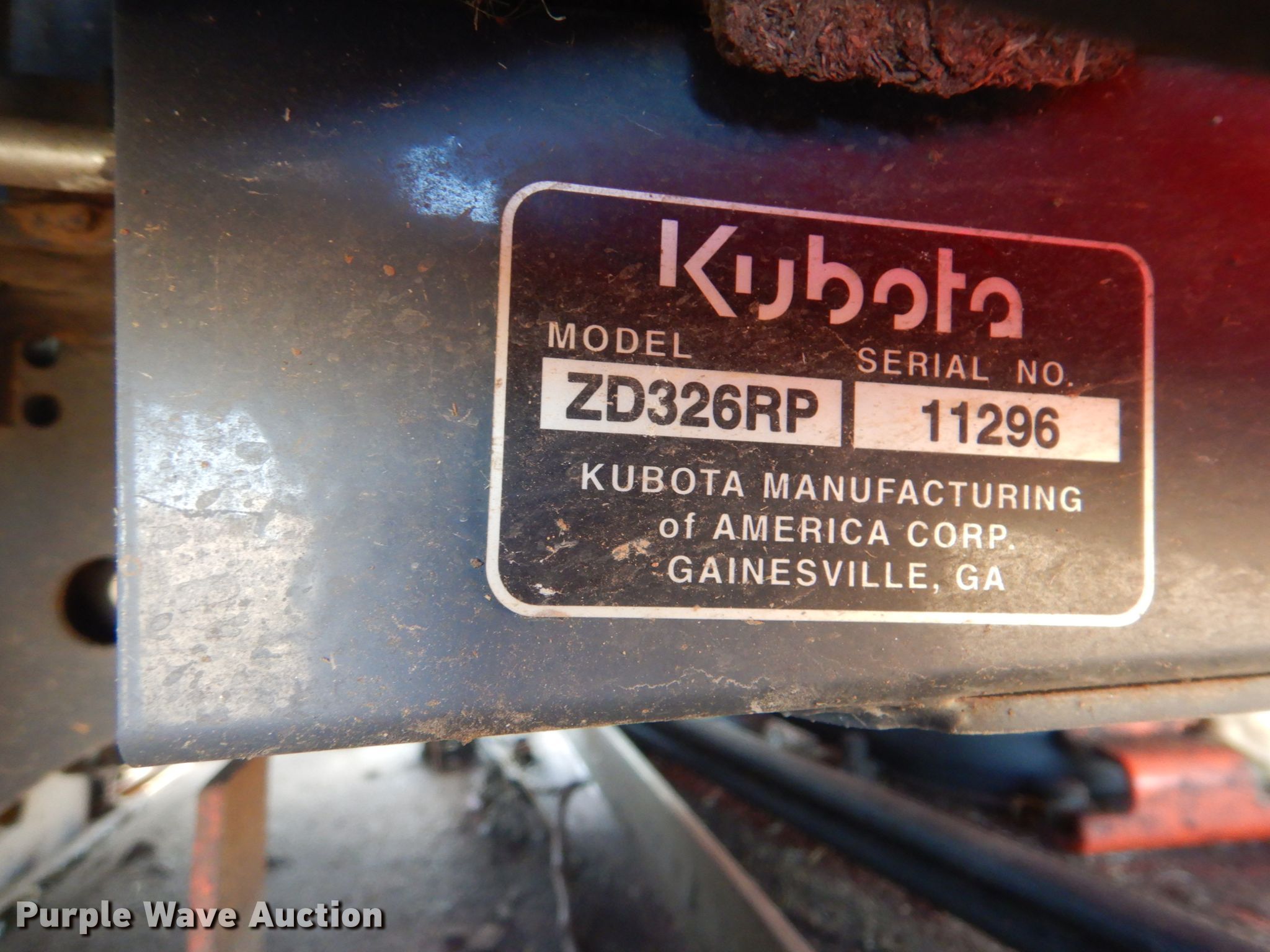 Purple Wave is selling a used Lawn Mower in Oklahoma. This item is a Kubota ZD326 ZTR lawn mower with the following: 927 hours on meter, 32" cut, Kubota D1005-EU9 three cylinder diesel engine, Serial CD2594, Hydrostatic transmission, OROPS, Kubota RCK60R-331Z mower deck, Deestone 6.00-6/4.50 front tires, Deestone 26x12.00 rear tires, Serial 11296