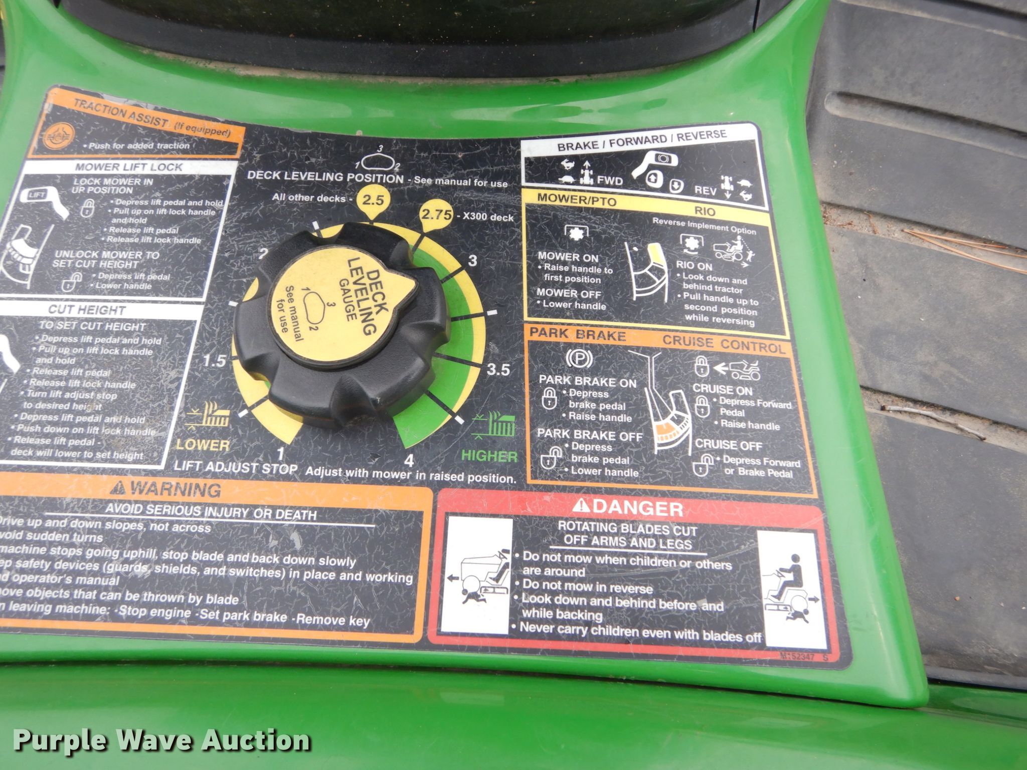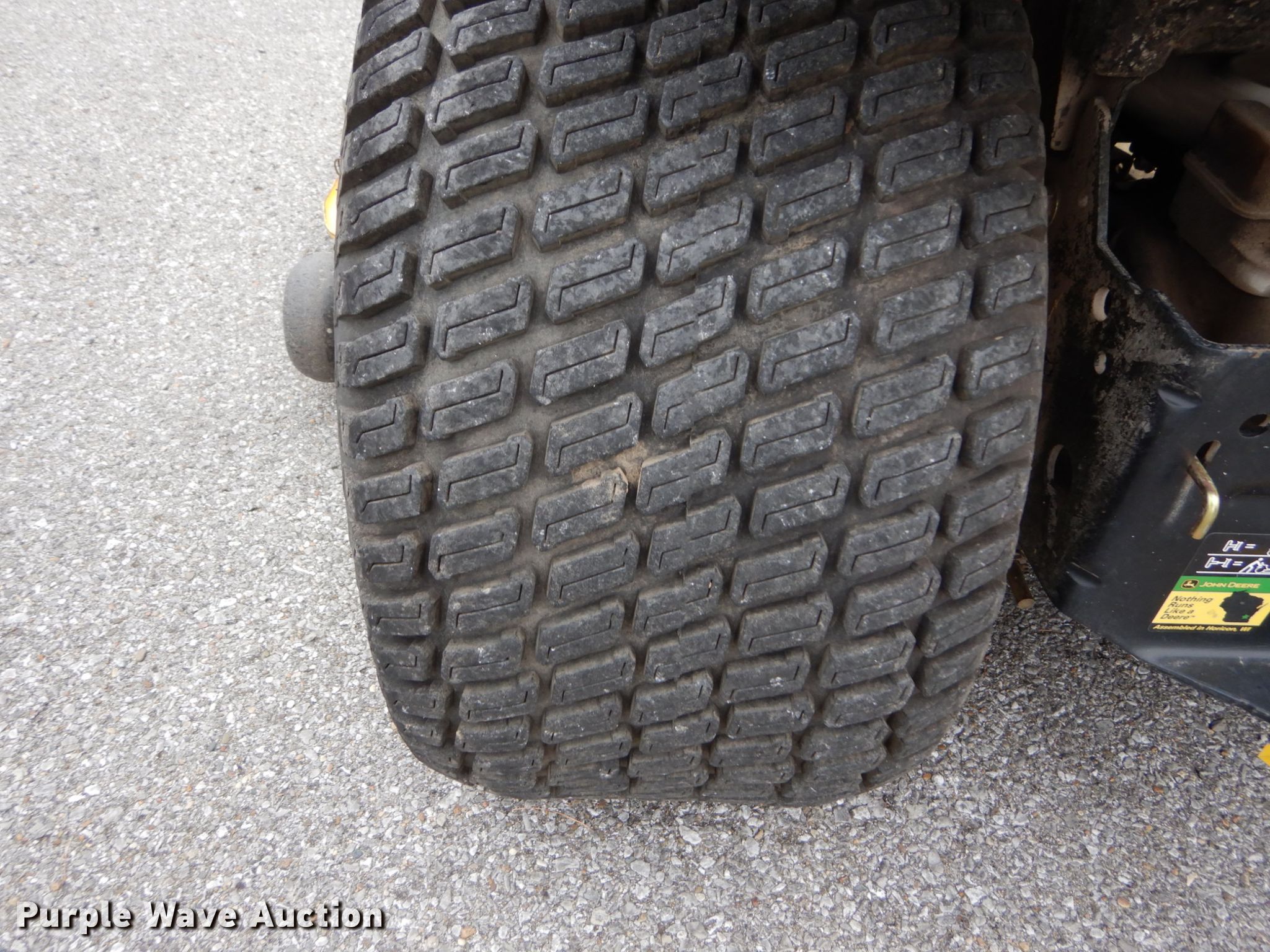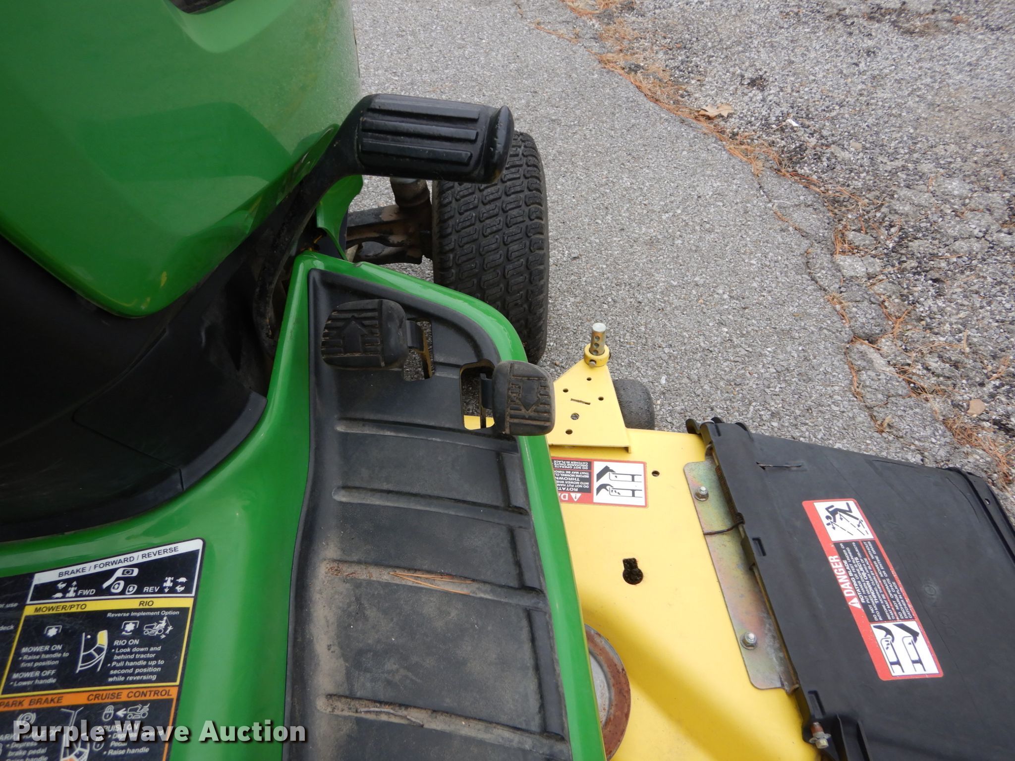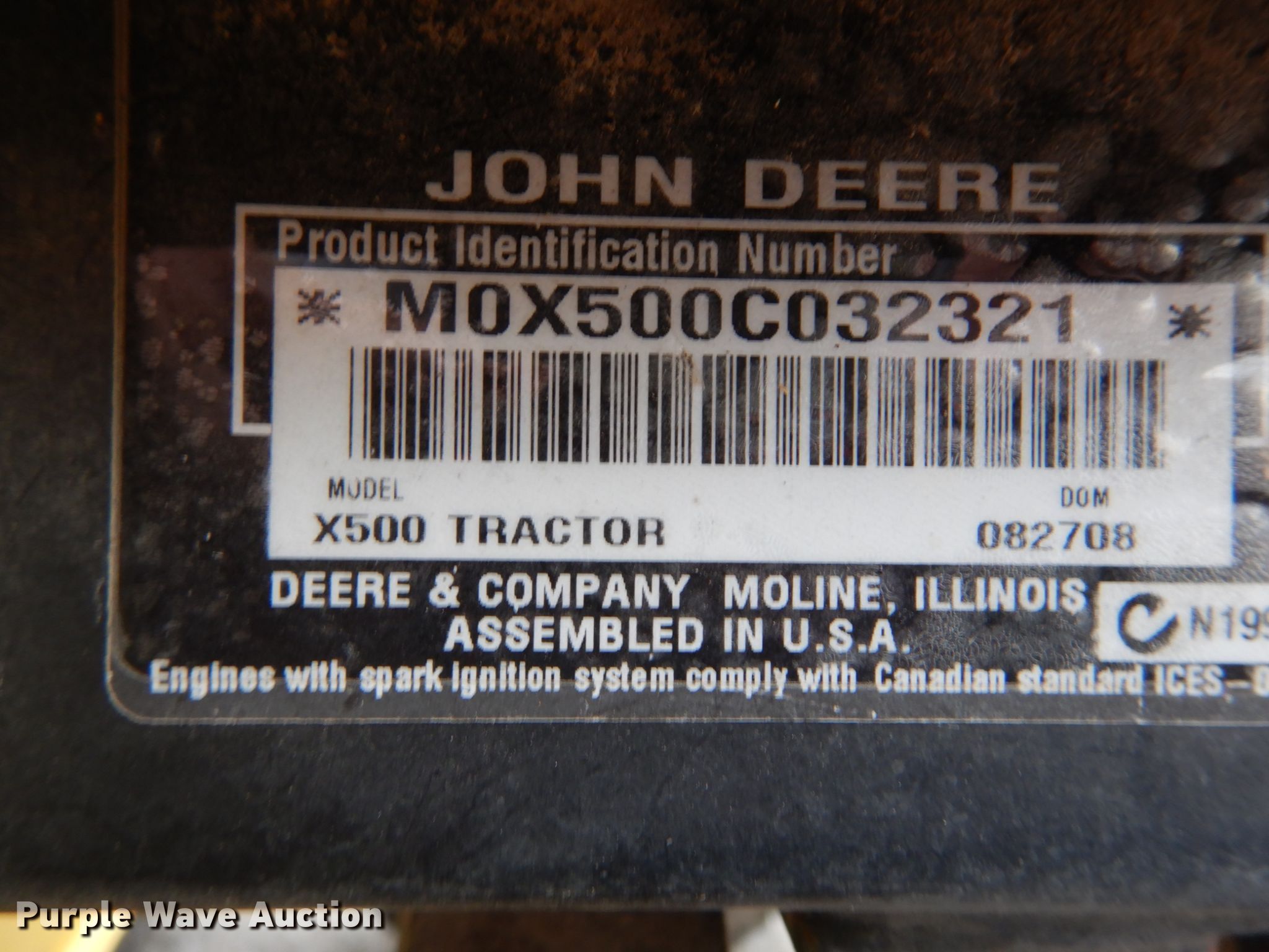 Purple Wave is selling a used Lawn Mower in Illinois. This item is a 2008 John Deere X500 lawn mower with the following: 633 hours on meter, 54" cut, Kawasaki two cylinder gas engine, 17 HP, Hydrostatic transmission, 16x6.50-8 front tires, 24x12.00-12 rear tires, Hood cracked, Serial M0X500C032321, Unit# 133986