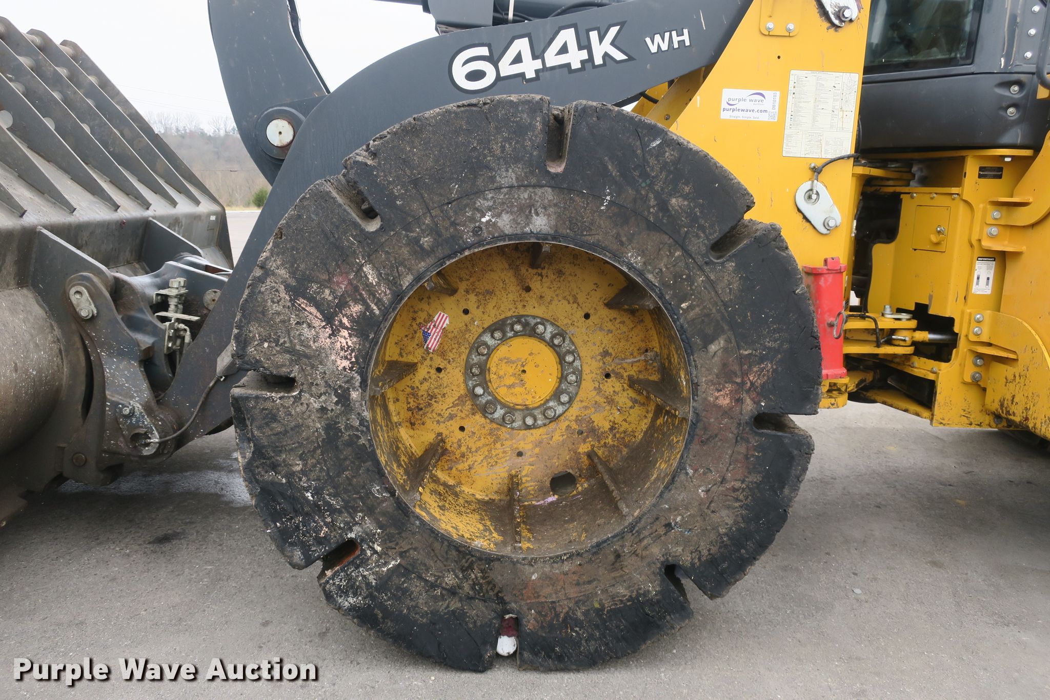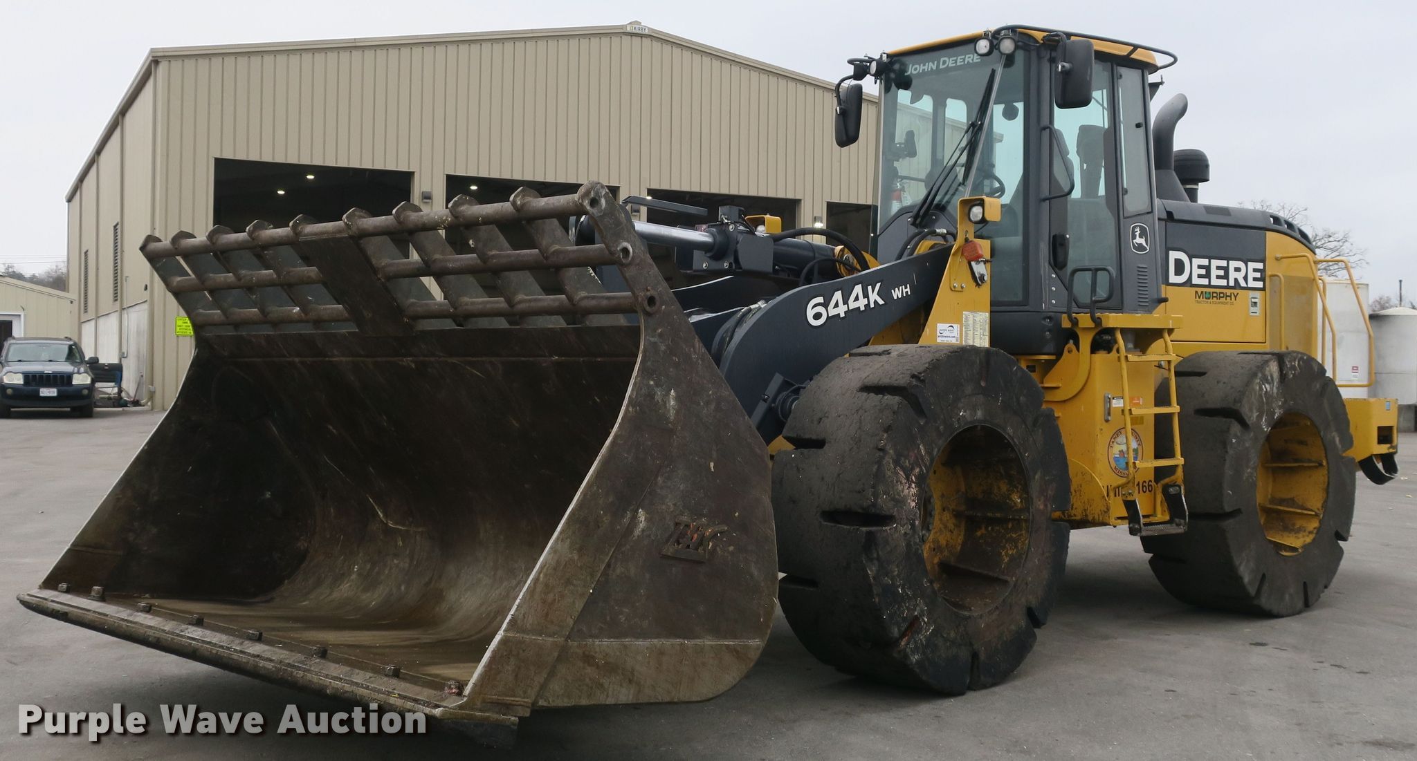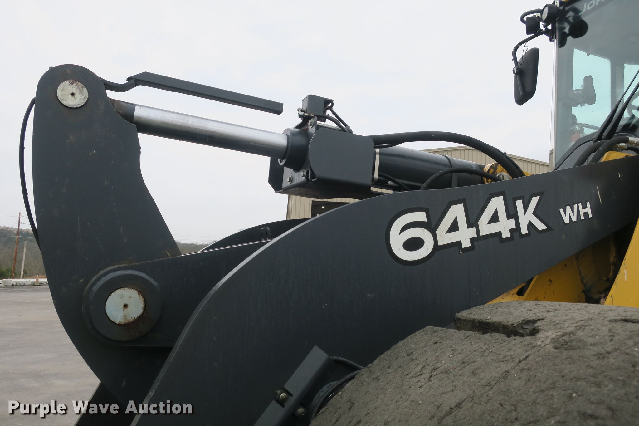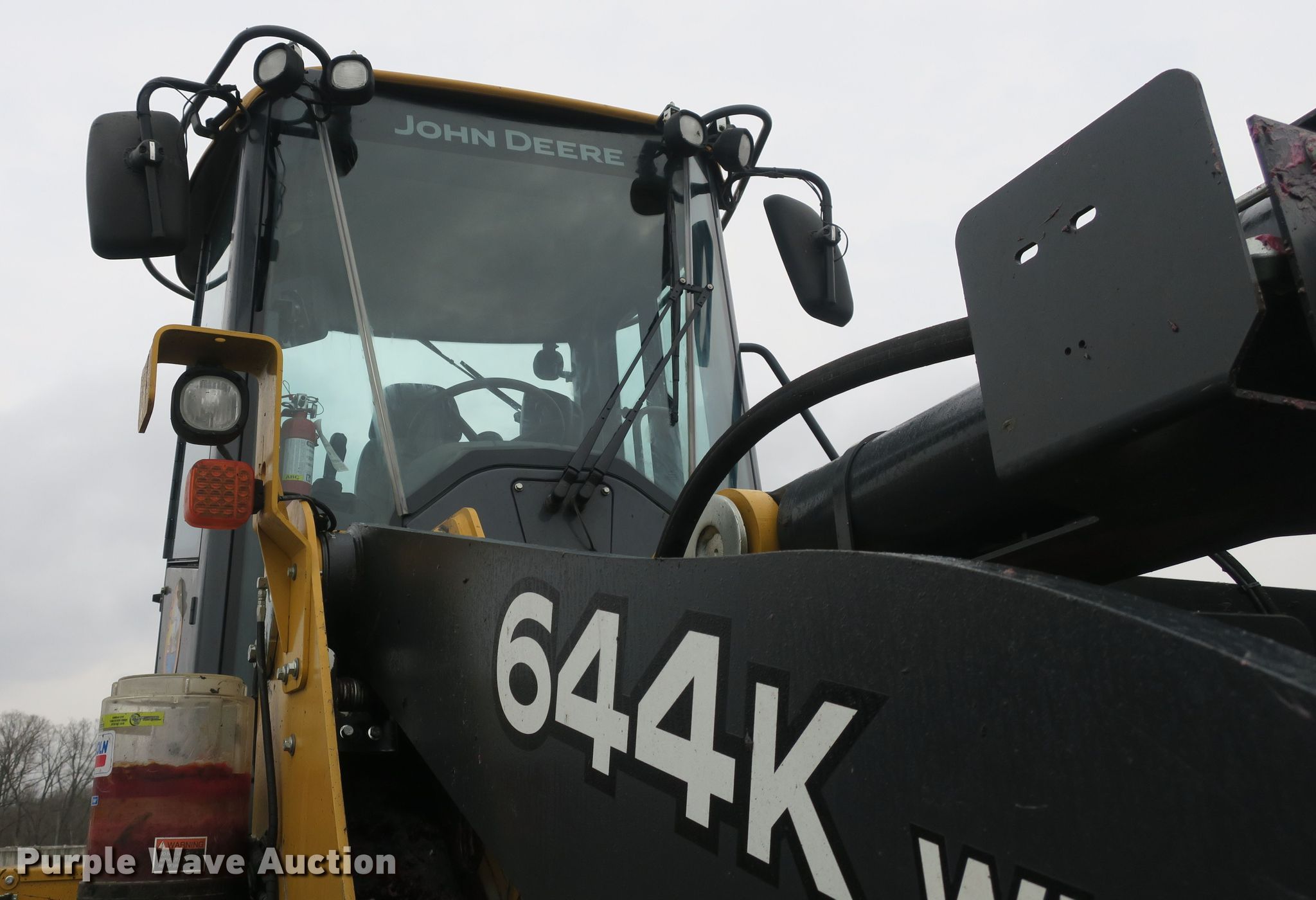 Purple Wave is selling a used Wheel Loader in Missouri. This item is a 2016 John Deere 644K wheel loader with the following: 4,106 hours on meter, John Deere Powertech 9.0L six cylinder diesel engine, Powershift transmission, 4F-4R gears, Front and rear differential lock, EROPS, Joystick steering or steering wheel, AC and heat, Heated seat, Joystick bucket controls, Ride control, Backup camera, Tag 128"W bucket, Bolt-on cutting edge, John Deere 117"W bucket, Bolt-on cutting edge, Four cu.yd. capacity, Self-leveling, Hydraulic quick coupler, Hydraulic belly pan, Auxiliary hydraulics, Setco 23.5 x 66 x 15 solid tires, Manuals, Engine rebuilt at 3,150 hours, Transferable warranty, Serial 1DW644K2TGF675456