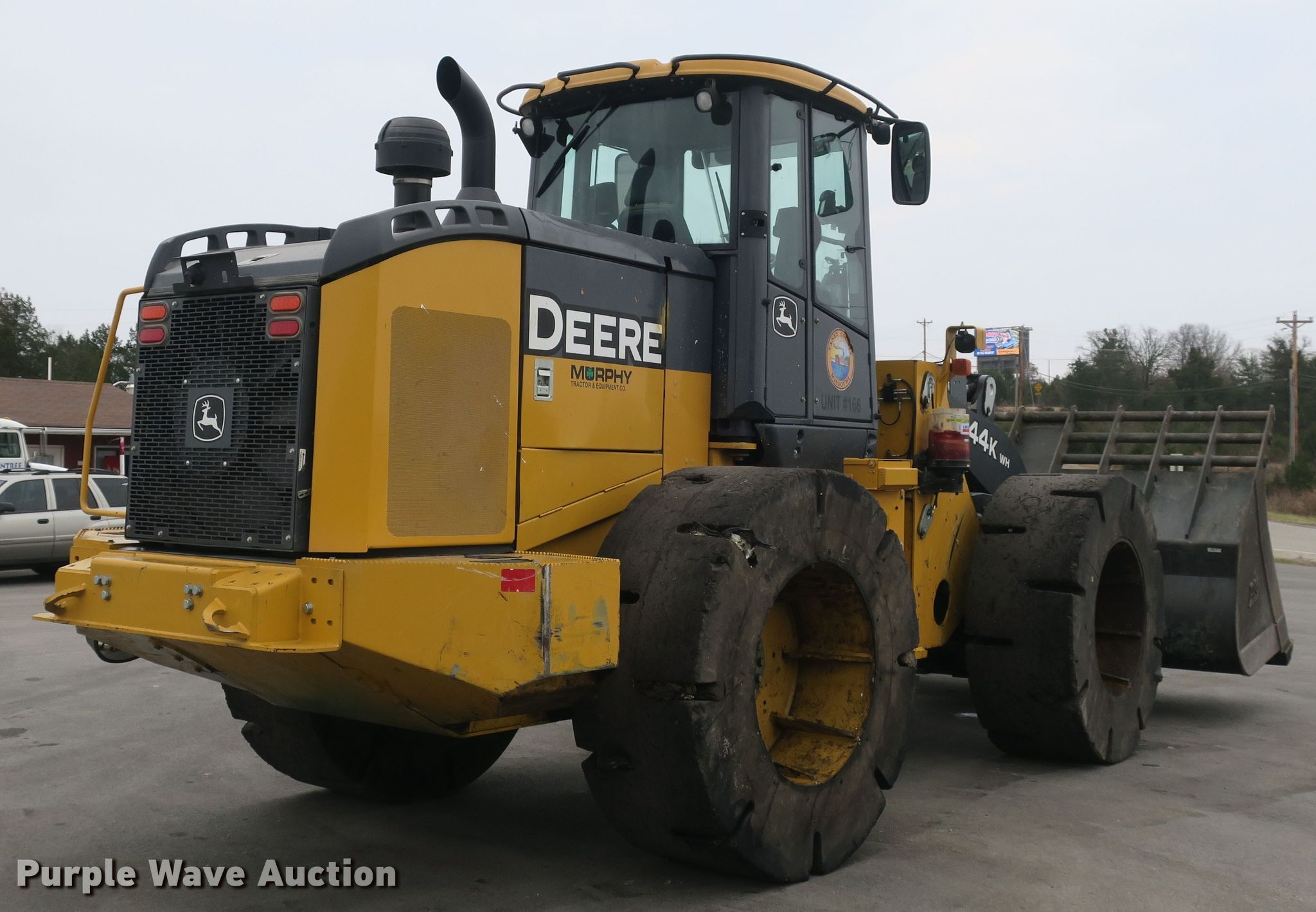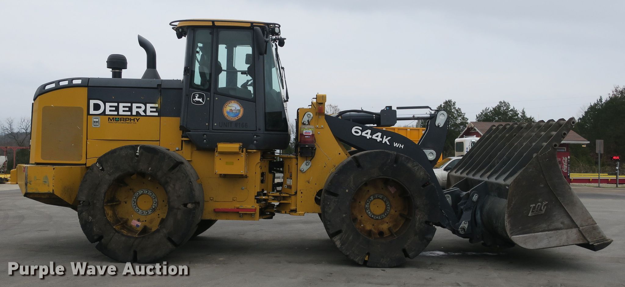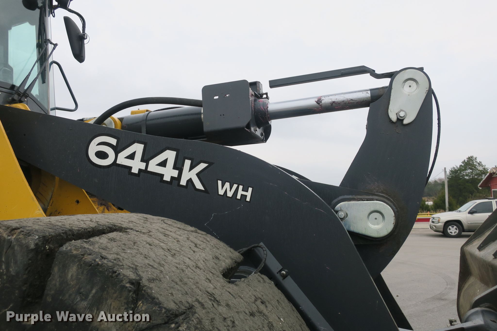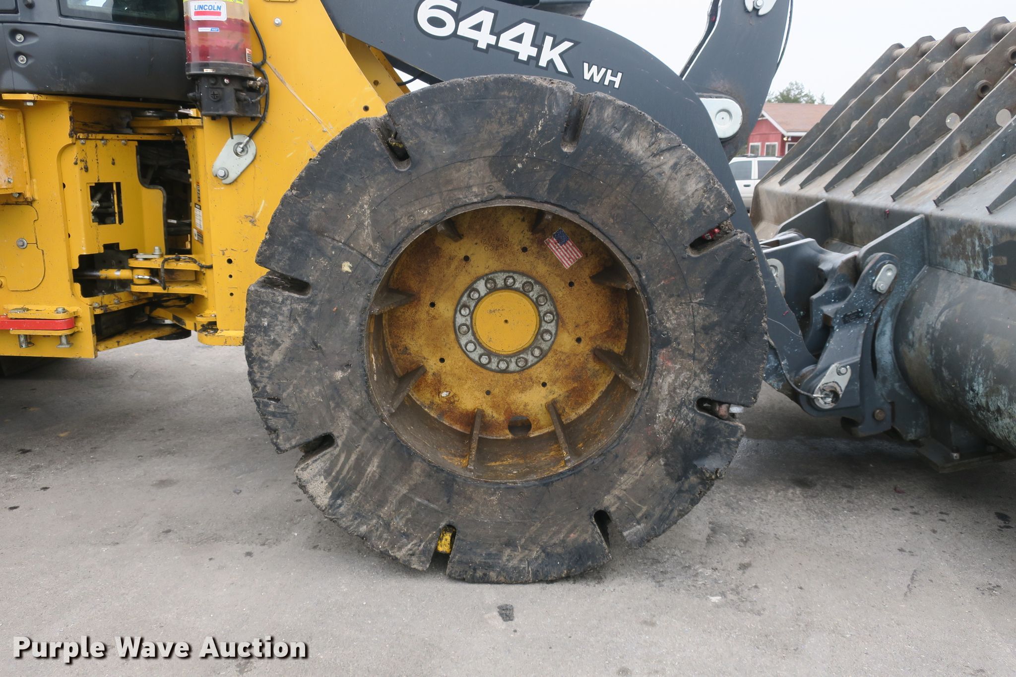 Purple Wave is selling a used Wheel Loader in Missouri. This item is a 2016 John Deere 644K wheel loader with the following: 4,106 hours on meter, John Deere Powertech 9.0L six cylinder diesel engine, Powershift transmission, 4F-4R gears, Front and rear differential lock, EROPS, Joystick steering or steering wheel, AC and heat, Heated seat, Joystick bucket controls, Ride control, Backup camera, Tag 128"W bucket, Bolt-on cutting edge, John Deere 117"W bucket, Bolt-on cutting edge, Four cu.yd. capacity, Self-leveling, Hydraulic quick coupler, Hydraulic belly pan, Auxiliary hydraulics, Setco 23.5 x 66 x 15 solid tires, Manuals, Engine rebuilt at 3,150 hours, Transferable warranty, Serial 1DW644K2TGF675456