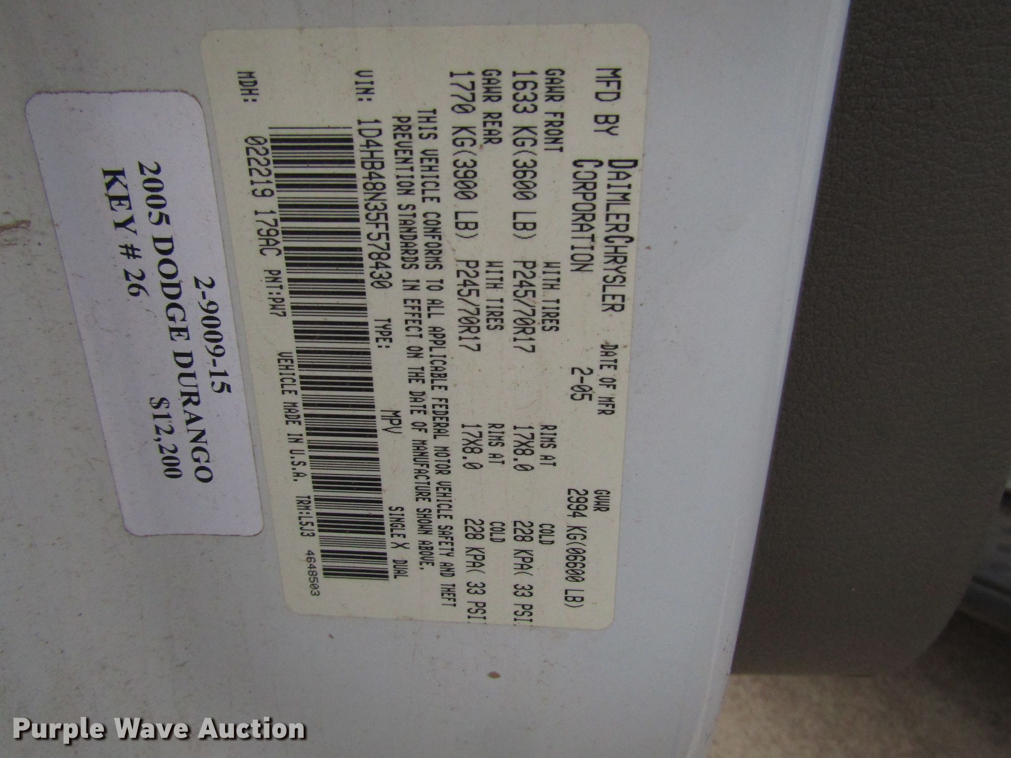 Purple Wave is selling a used Passenger Vehicle in Oklahoma. This item is a 2005 Dodge Durango SUV with the following: 111,735 miles on odometer, 4.7L V8 SOHC 16V gas engine, Automatic transmission, Four wheel drive, AC and heat, Cruise, Power windows, locks, and seat, 245/70R17 tires, Possible brake issues, Possible power steering issue, Check engine light on