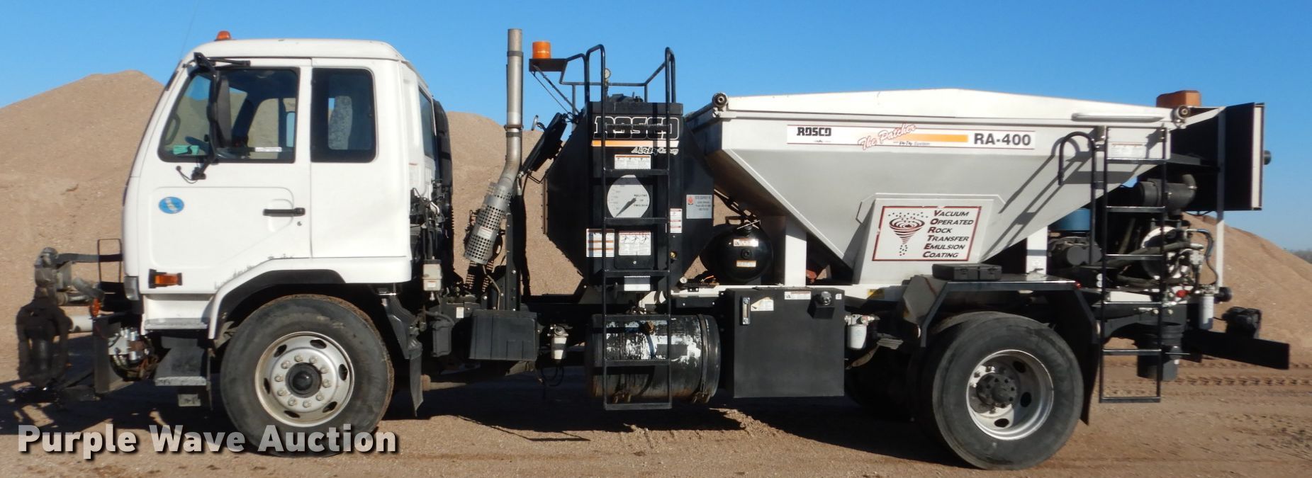 Purple Wave is selling a used Oil Distributor Truck in Nebraska. This item is a 2010 UD 3300 truck with Rosco RA-400 patcher with the following: 26,393 miles on odometer, Hino J08E-UJ six cylinder diesel engine, Automatic transmission, Single axle, AC and heat, PTO, Rosco RA400 patcher, Kubota four cylinder diesel engine, Hydraulic top lids, Hydraulic front boom swing and lift, Spring suspension, Air brakes, GVWR 32,900 lbs, 11R22.5 tires