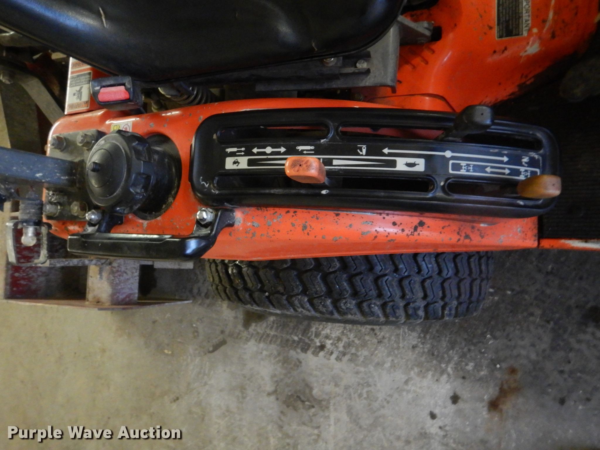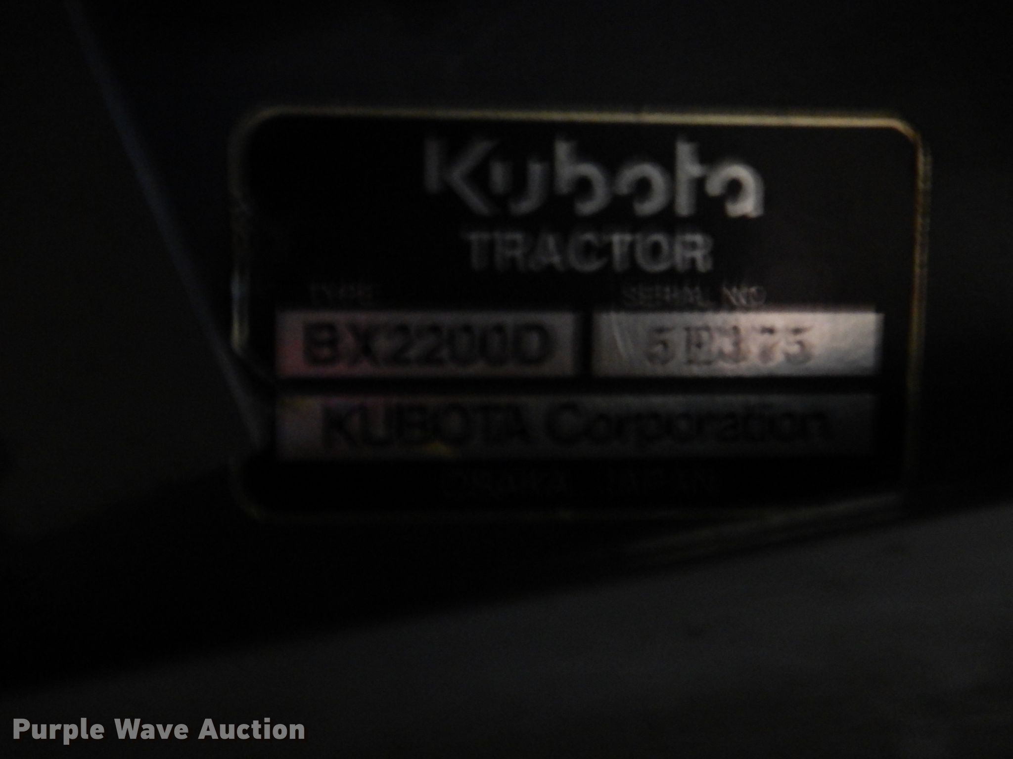 Purple Wave is selling a used Tractor in Oklahoma. This item is a Kubota BX2200D tractor with the following: 558 hours on meter, Kubota D905E-TVCS 0.9L three cylinder diesel engine, Two speed hydrostatic transmission, Kubota LA21 loader, 48"W bucket, Joystick controls, 540 PTO, Atlas box blade, 48"W, 55" wheelbase, 18x8.50-8 tires, Serial 5E375