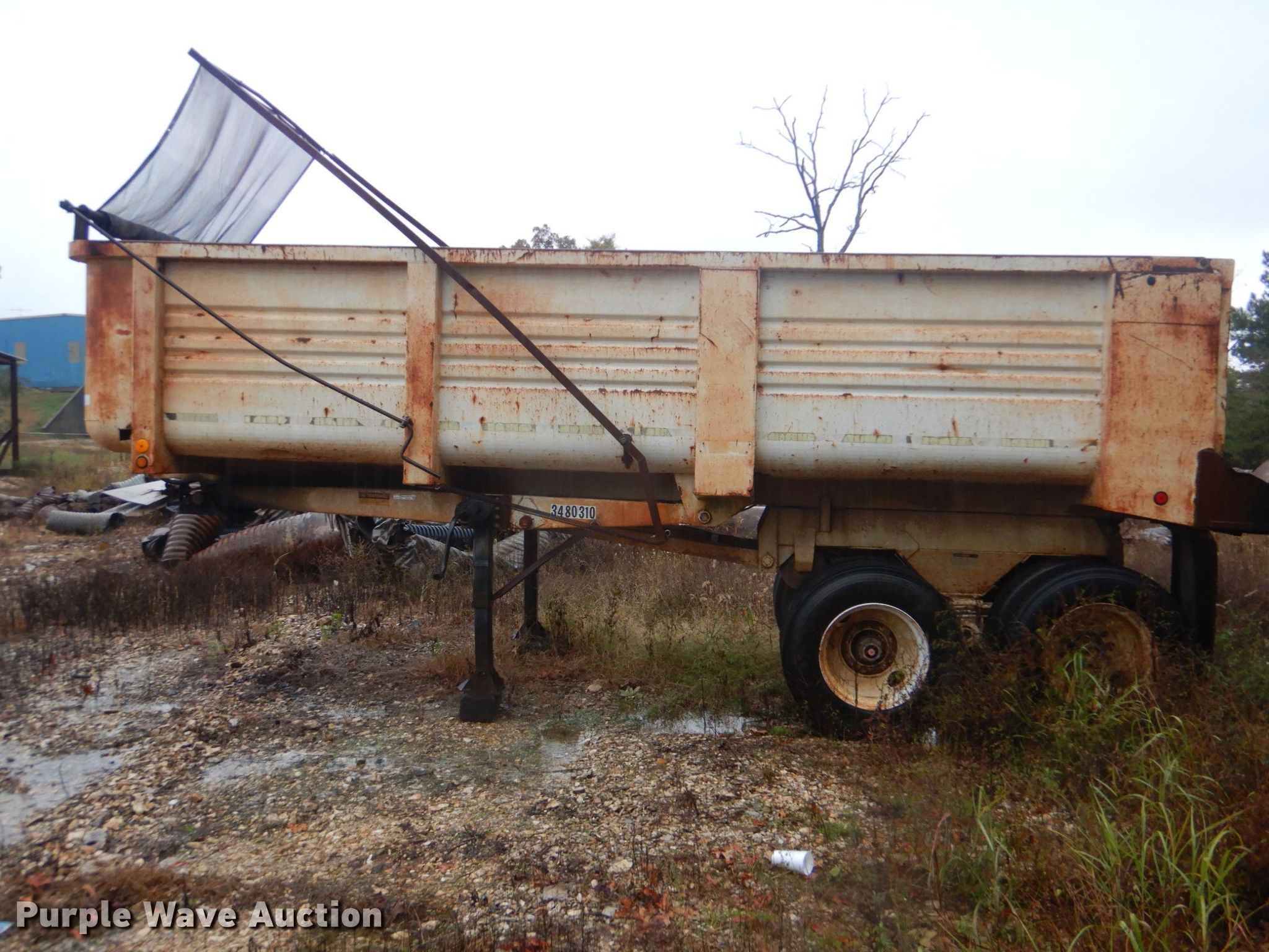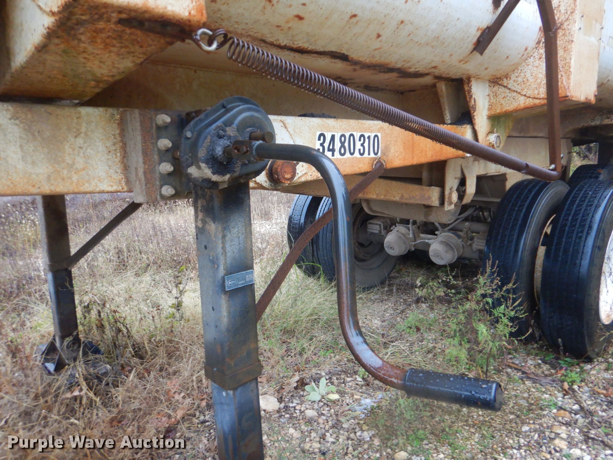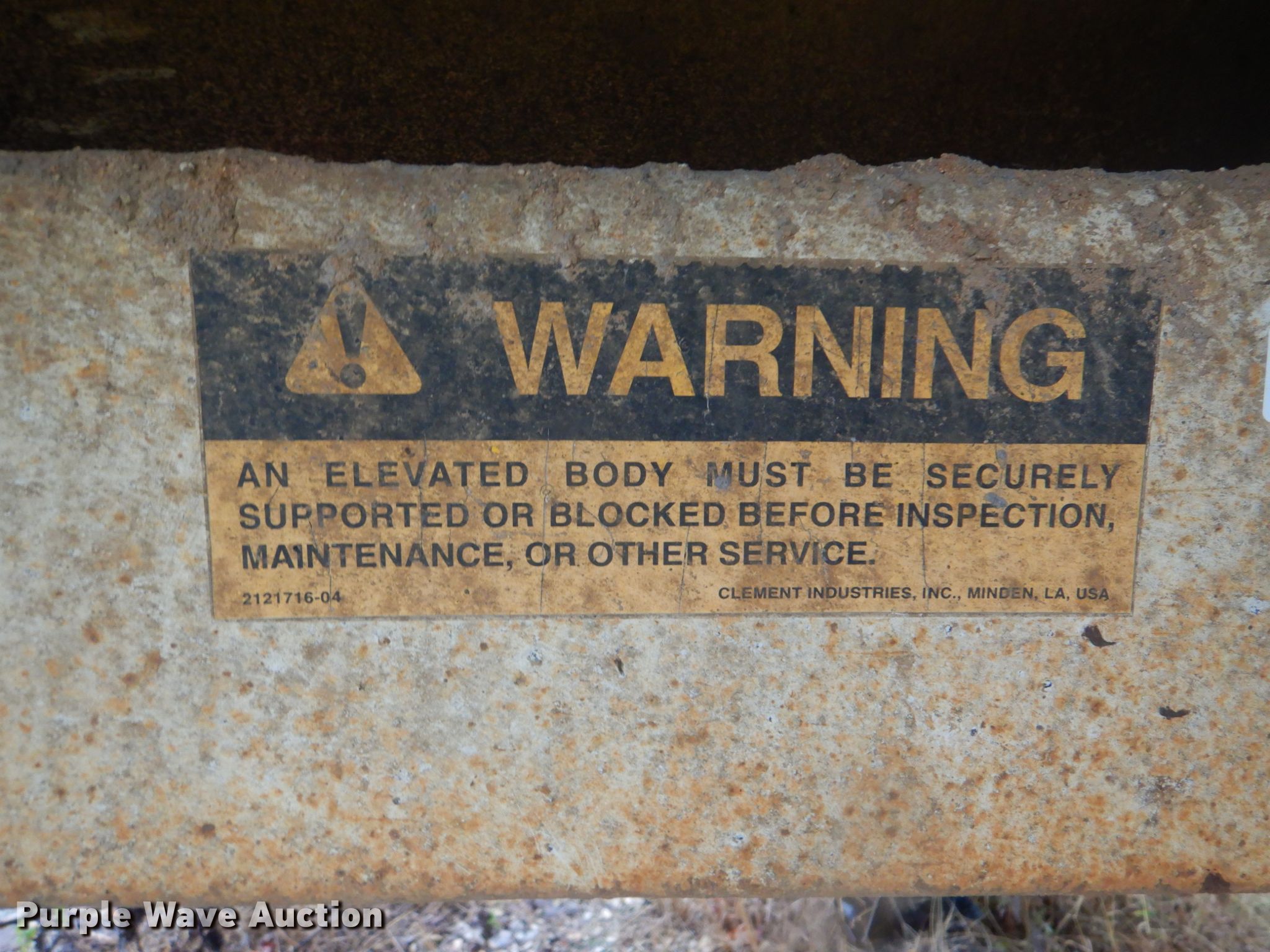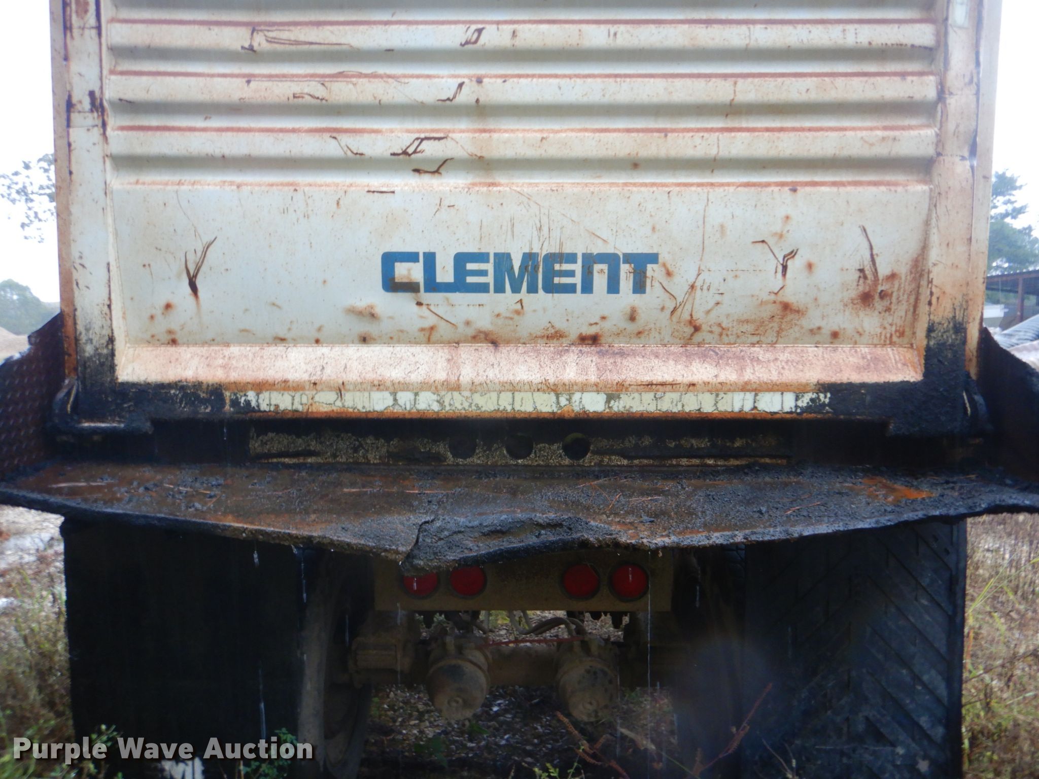 Purple Wave is selling a used End Dump Rock Trailer in Oklahoma. This item is a 1994 Clement HSLW2326 end dump trailer with the following: 23'L x 95"W overall, 52" side height, Single hydraulic cylinder, Air operated end gate, 24 ton capacity, Dual leg landing gear, Spring suspension, Air brakes, Tandem axle, 11R24.5 tires