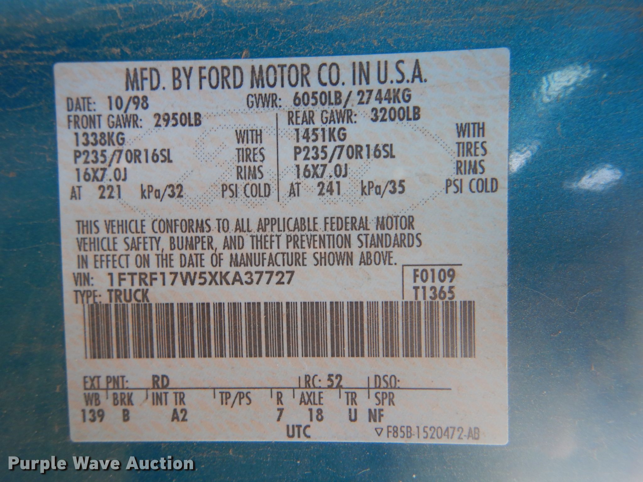 Purple Wave is selling a used 1/2 Ton Pickup or Van in Oklahoma. This item is a 1999 Ford F150 pickup truck with the following: 89,736 miles on odometer, 4.6L V8 SOHC 16V gas engine, Automatic transmission, AC and heat, P235/70R16 tires, Tailgate missing, Battery not included