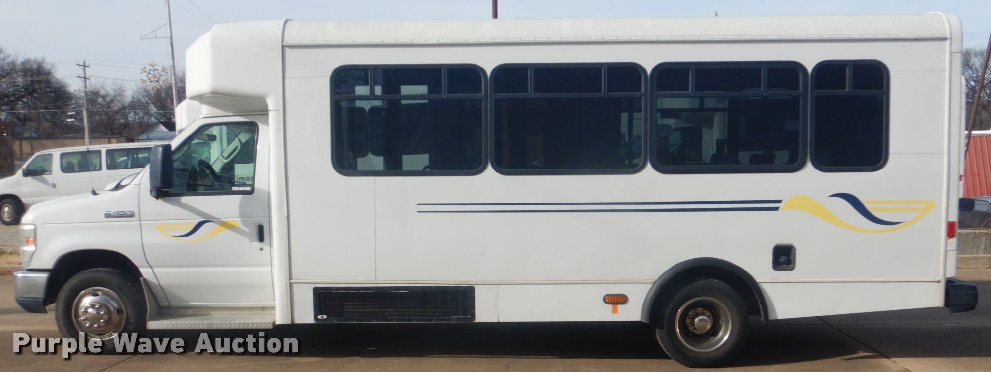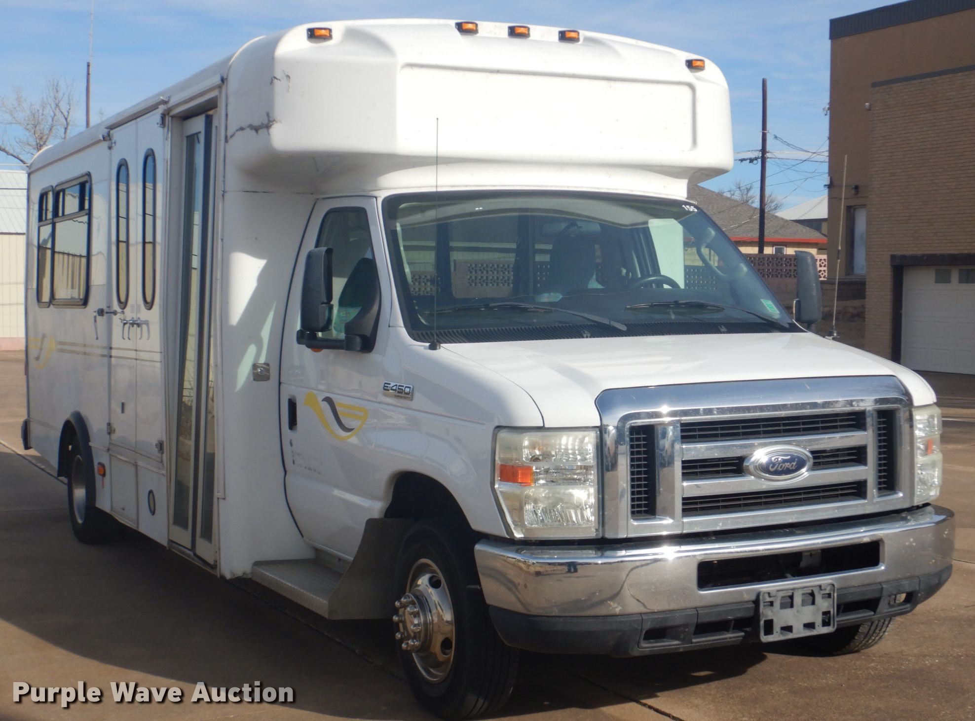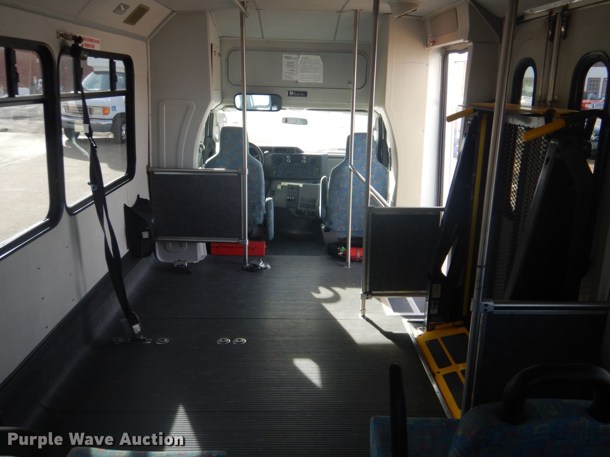 Purple Wave is selling a used Bus in Oklahoma. This item is a 2009 Ford Econoline E450 shuttle bus with the following: 172,759 miles on odometer, 6.8L V10 SOHC 20V gas engine, Automatic transmission, Single axle, AC and heat, Electric passenger sliding door, 13 passenger capacity, Wheelchair lift, Spring suspension, Hydraulic brakes, Dynapro LT225/75R16 tires, GVWR 14,500 lbs, Airbag sensor light on, Cracked windshield