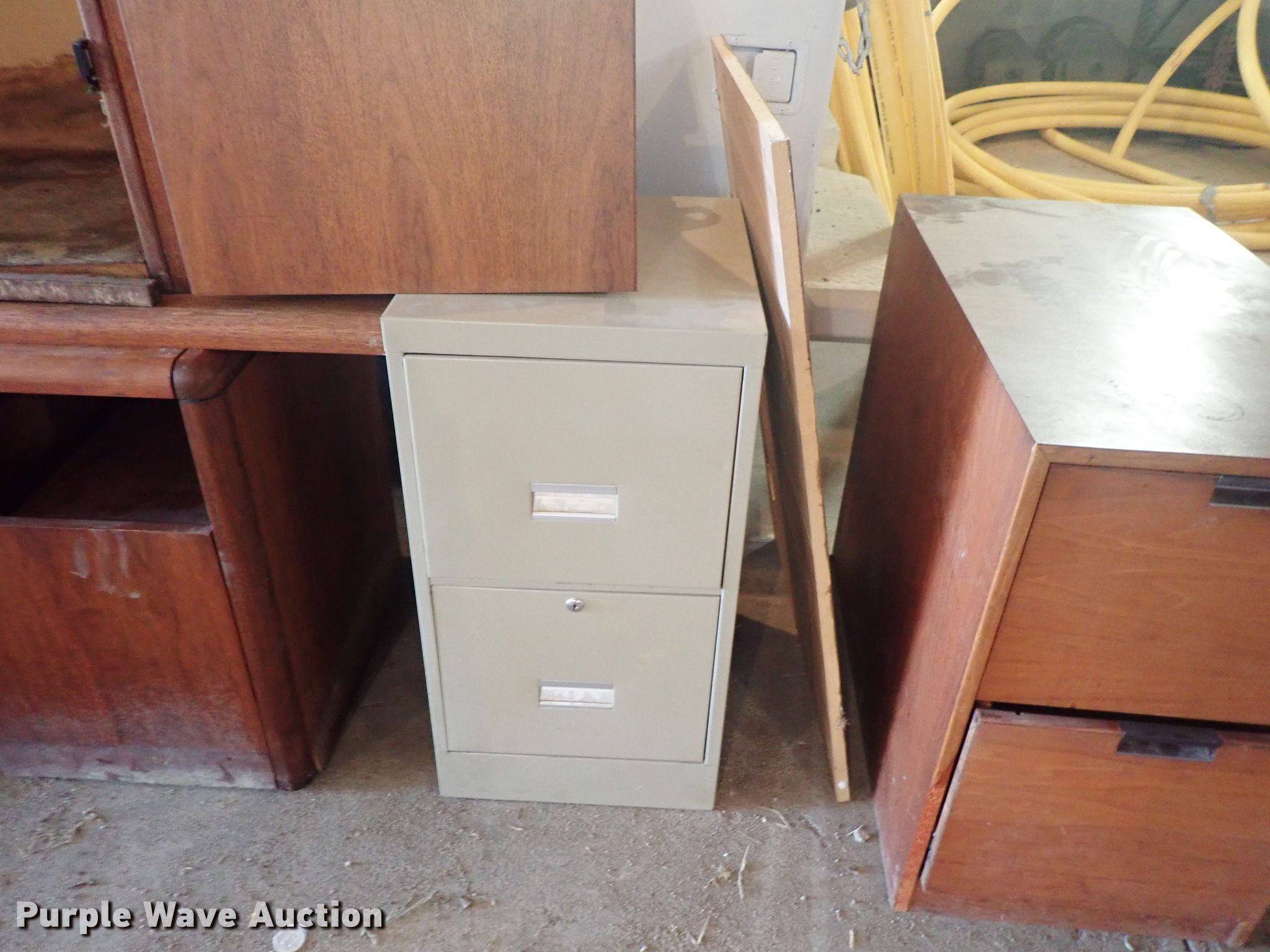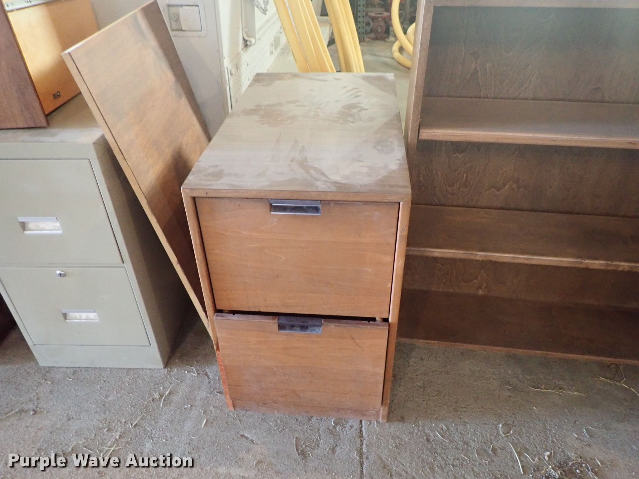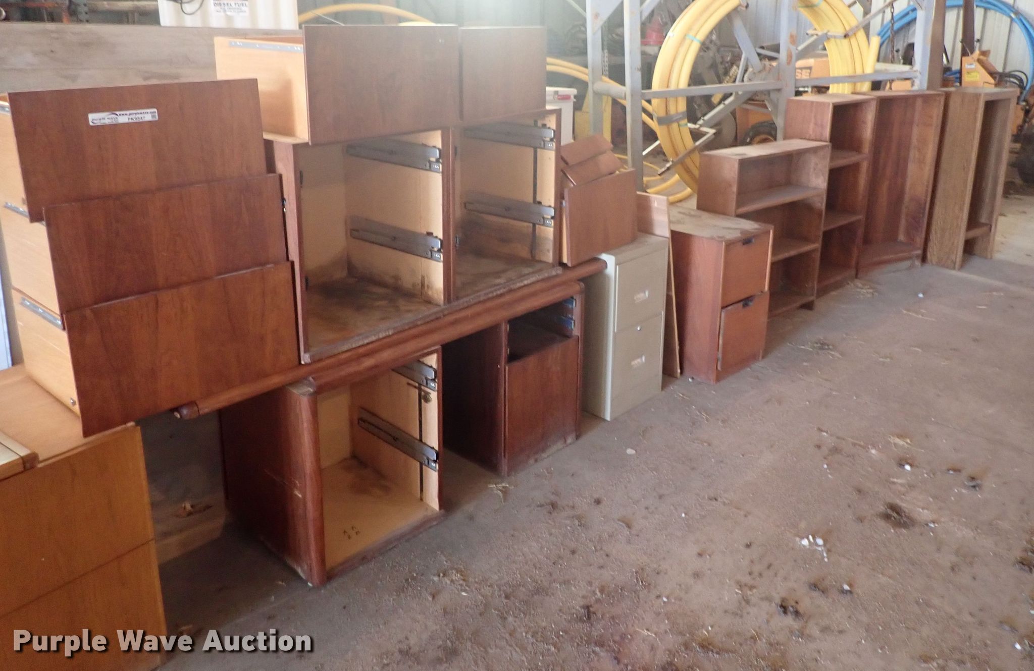 Purple Wave is selling a used Furniture in Kansas. This item is a Furniture with the following: (2) wood desks, (2) wood cabinets, (4) wood shelves, (2) wood file cabinets, Metal file cabinet