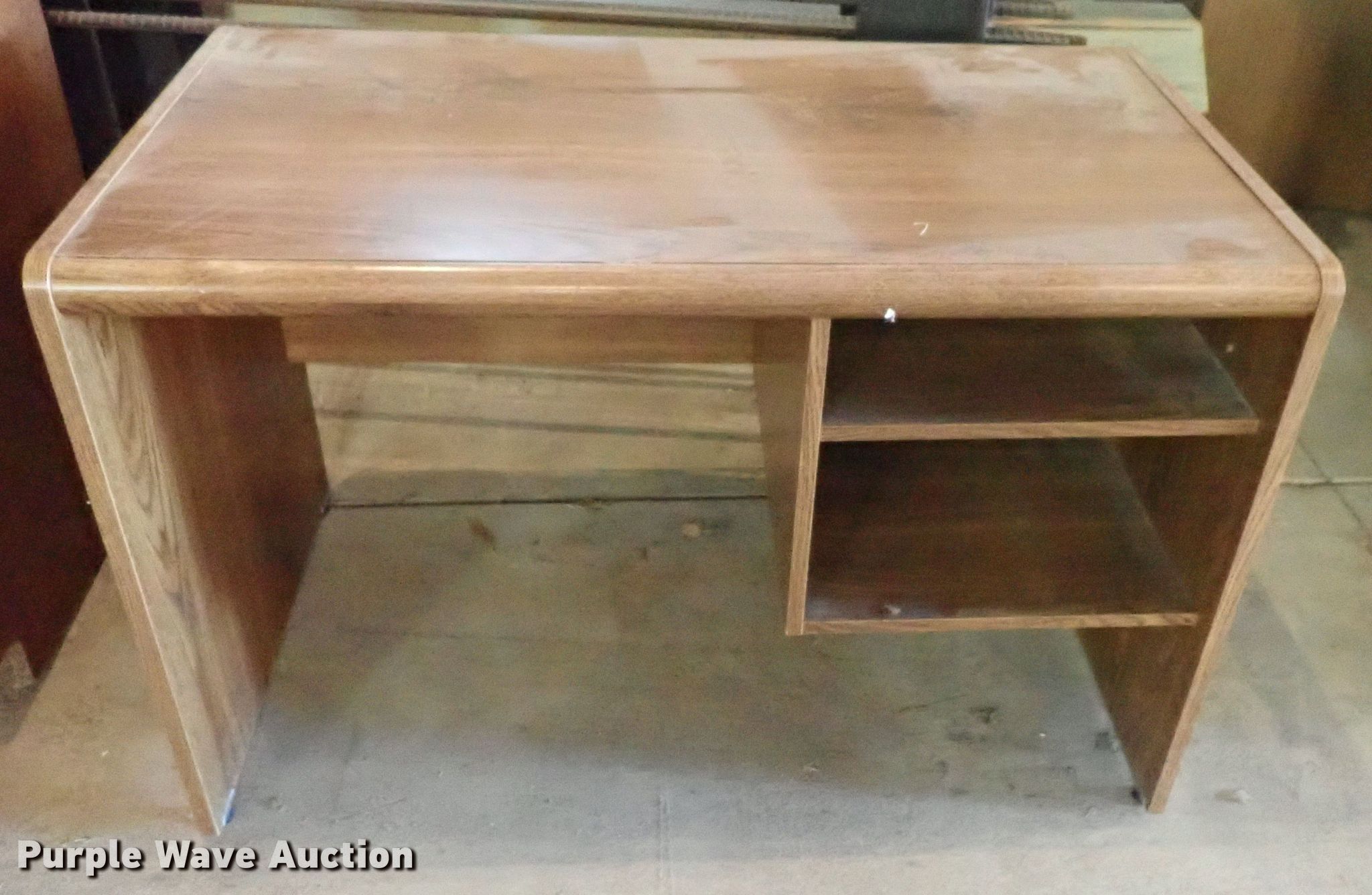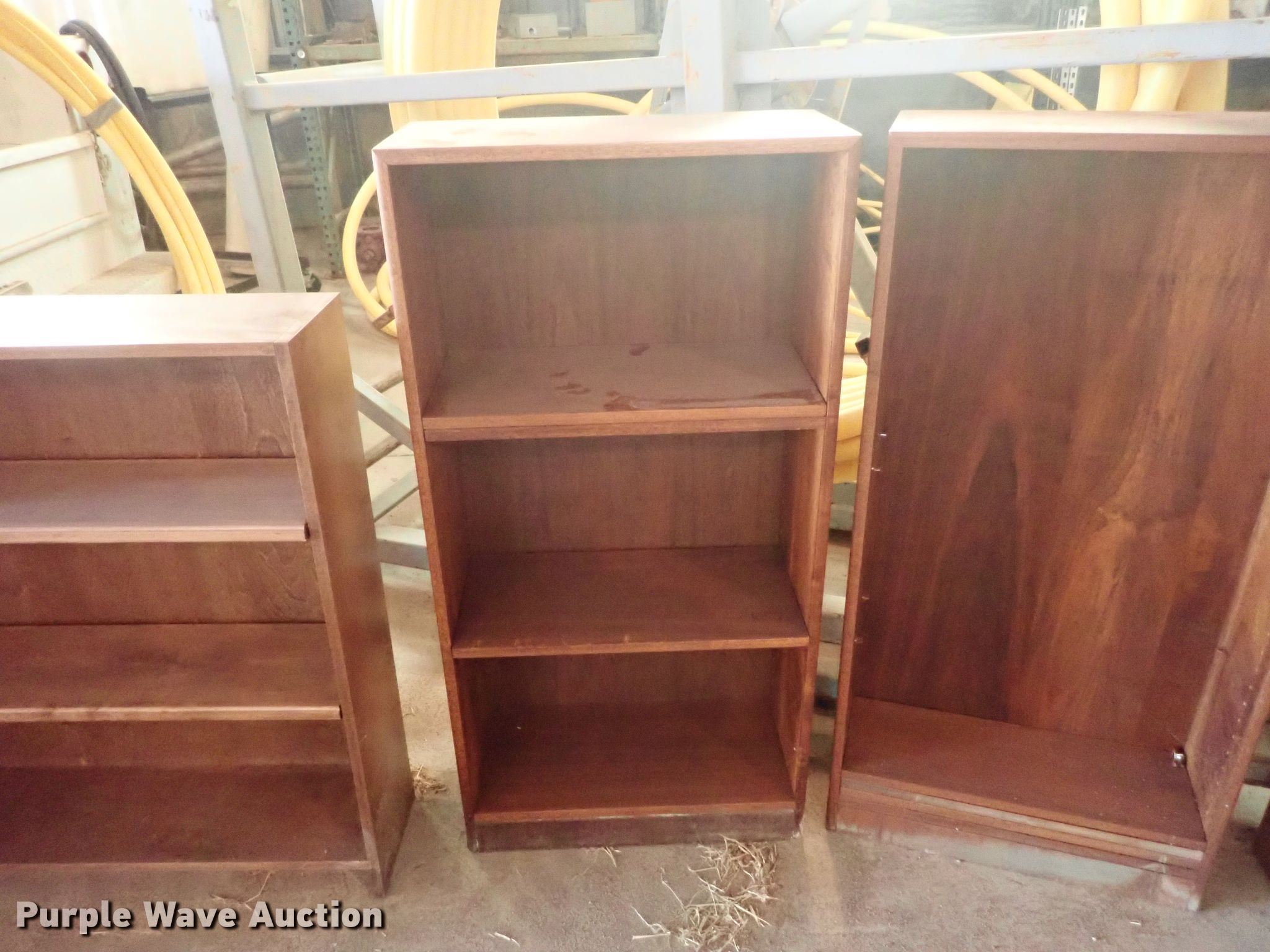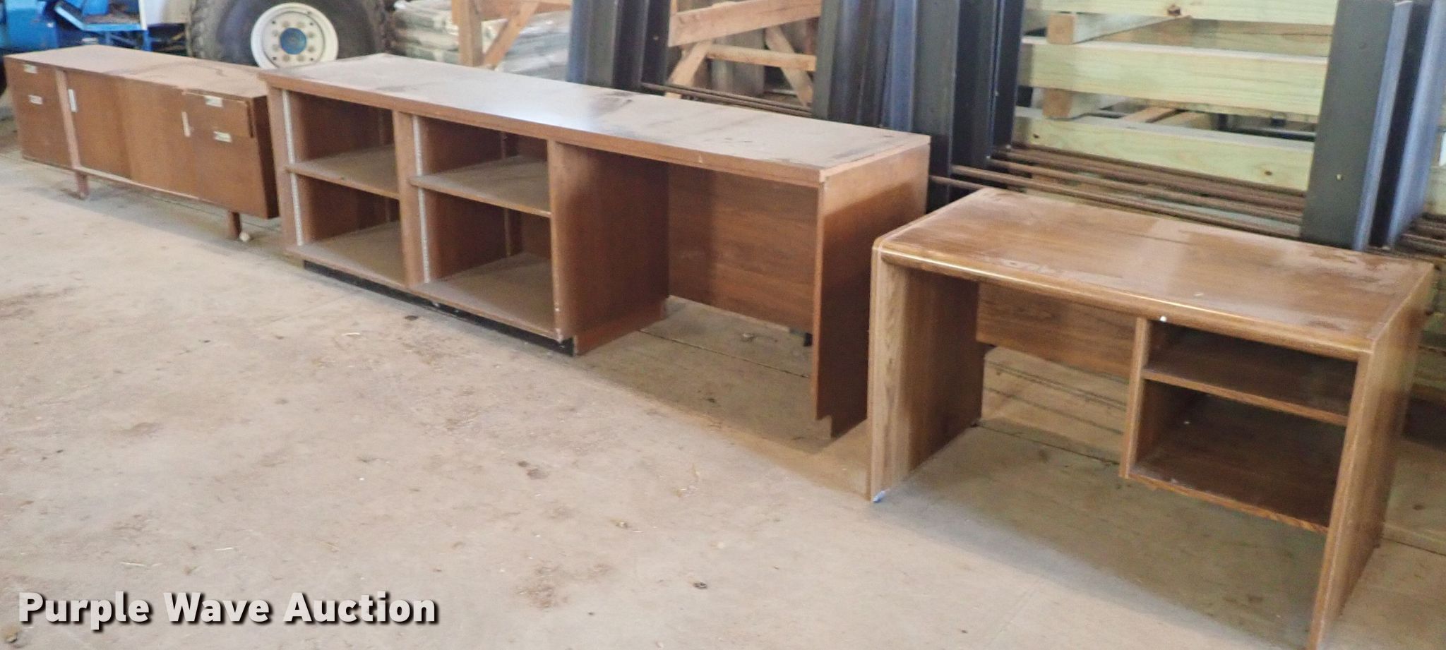 Purple Wave is selling a used Furniture in Kansas. This item is a Furniture with the following: (2) wood desks, (2) wood cabinets, (4) wood shelves, (2) wood file cabinets, Metal file cabinet