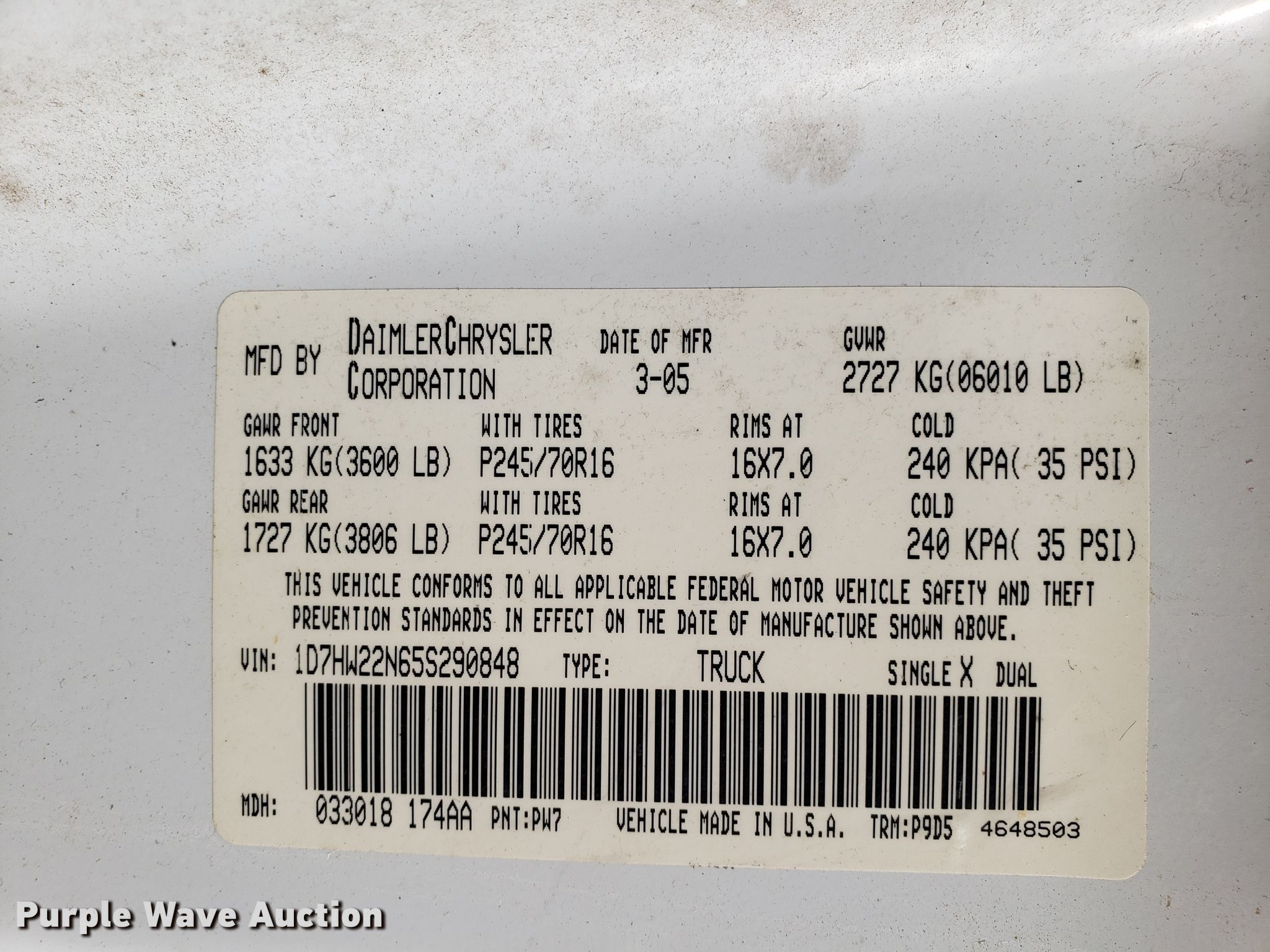 Purple Wave is selling a used Compact Pickup or Van in Missouri. This item is a 2005 Dodge Dakota Club Cab pickup truck with the following: 55,623 miles on odometer, 4.7L V8 SOHC 16V gas engine, Automatic transmission, Four wheel drive, 245/70R16 tires, Check engine light on