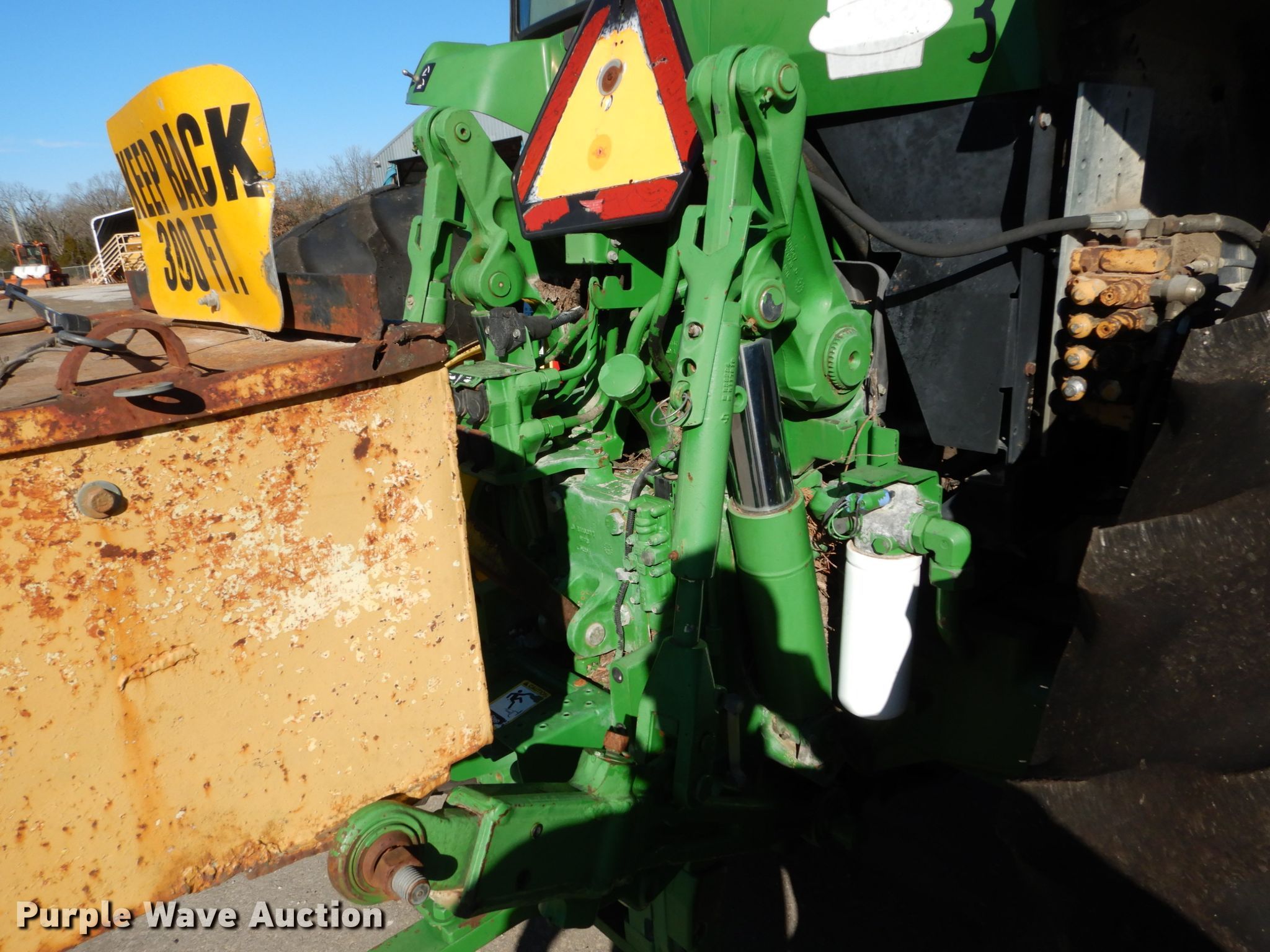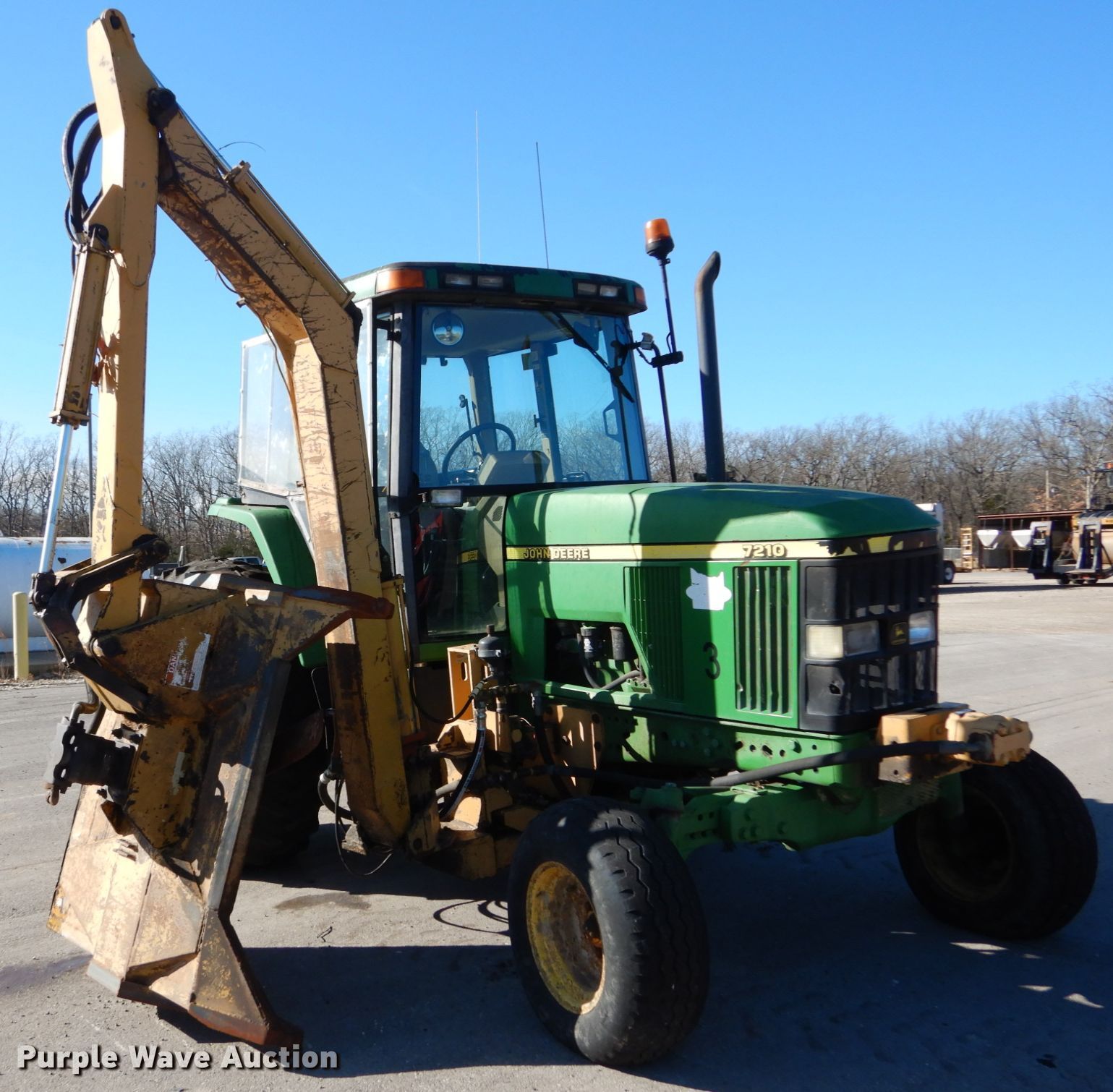 Purple Wave is selling a used Tractor in Missouri. This item is a 2000 John Deere 7210 tractor with the following: 6,863 hours on meter, John Deere 6068 6.8L six cylinder diesel engine, 110 HP, Synchro transmission, 12F-4R gears, Differential lock, AC and heat, 540/1000 PTO, (2) rear hydraulic remotes, Tiger side boom rotary mower, 14'L boom, 51"W mower deck, Serial MK-2413, 11L-16 front tires, 18.4-34 rear tires, Serial RW7210S033076, Unit# 800