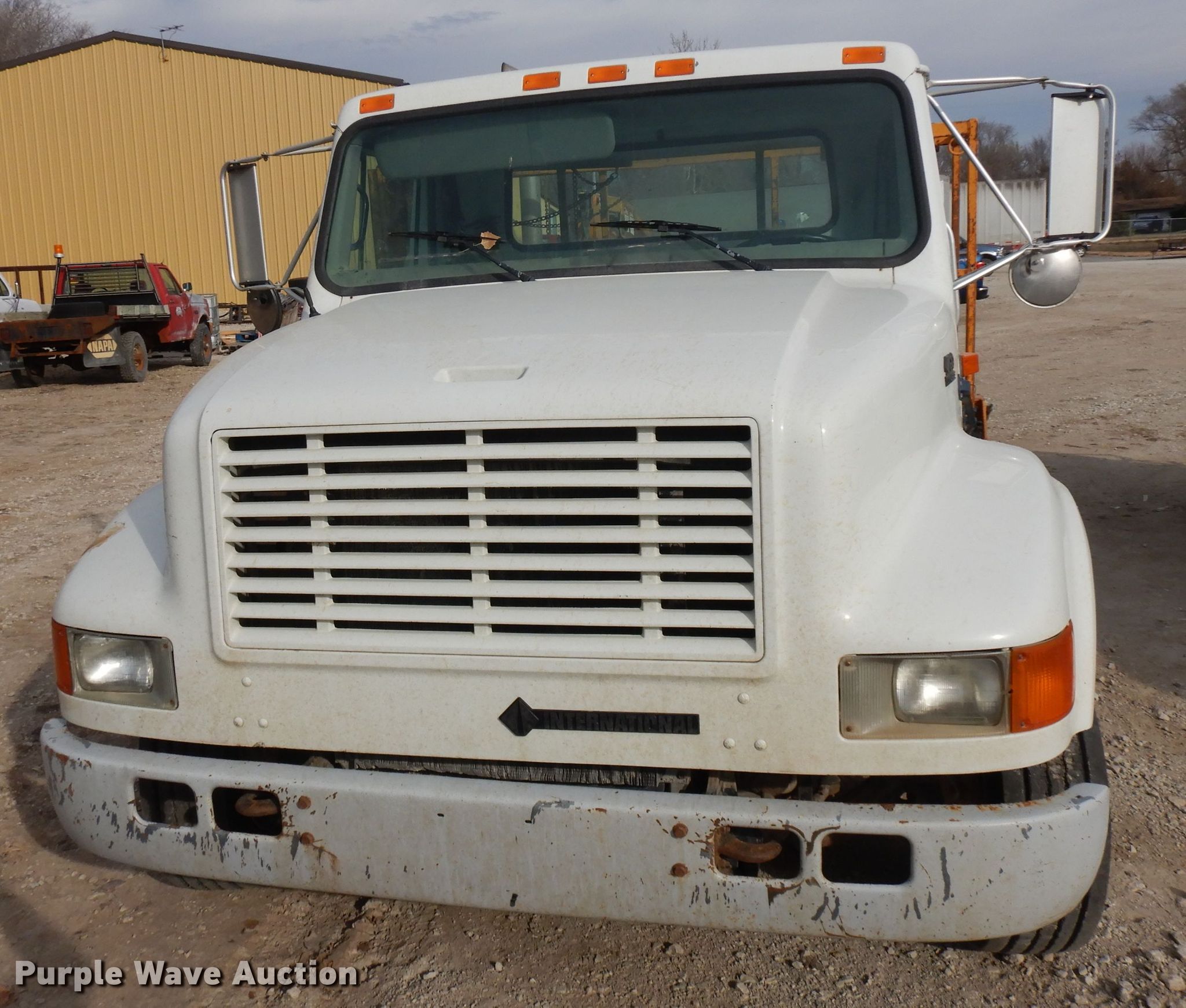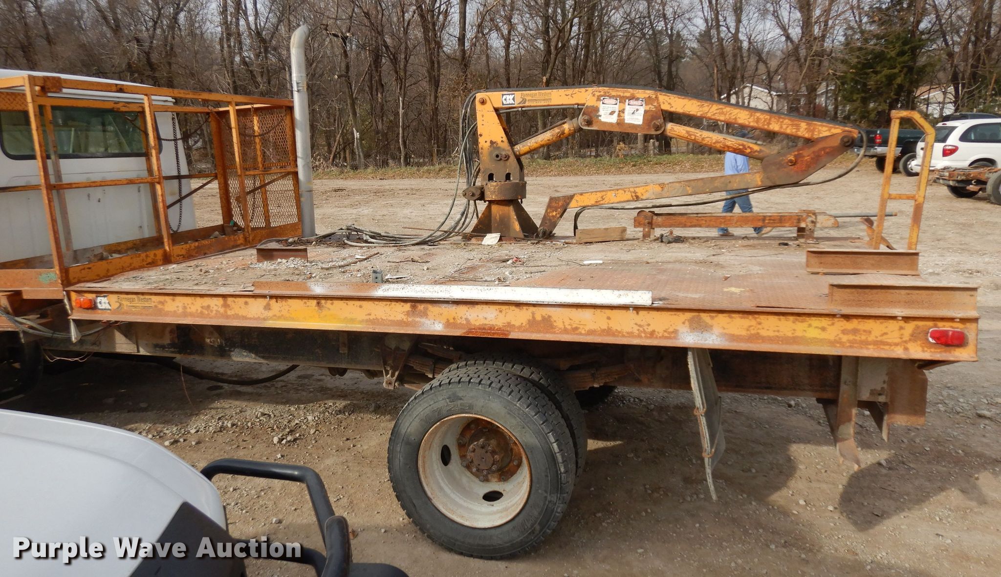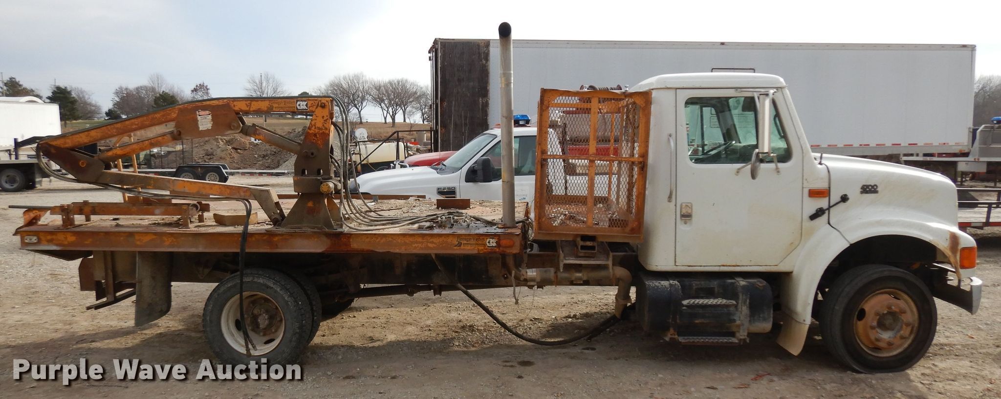 Purple Wave is selling a used Service Truck in Kansas. This item is a 2000 International 4700 flatbed truck with crane with the following: 231,804 miles on odometer, 13,495 hours on meter, International DT466 7.6L L6 diesel engine, Automatic transmission, Single axle, AC and heat, 13'L flatbed, Crane, 8' boom length, Spring suspension, Hydraulic brakes, 245/70R19.5 tires, Crane valves and levers removed, Non-operational unit, Non-operational engine