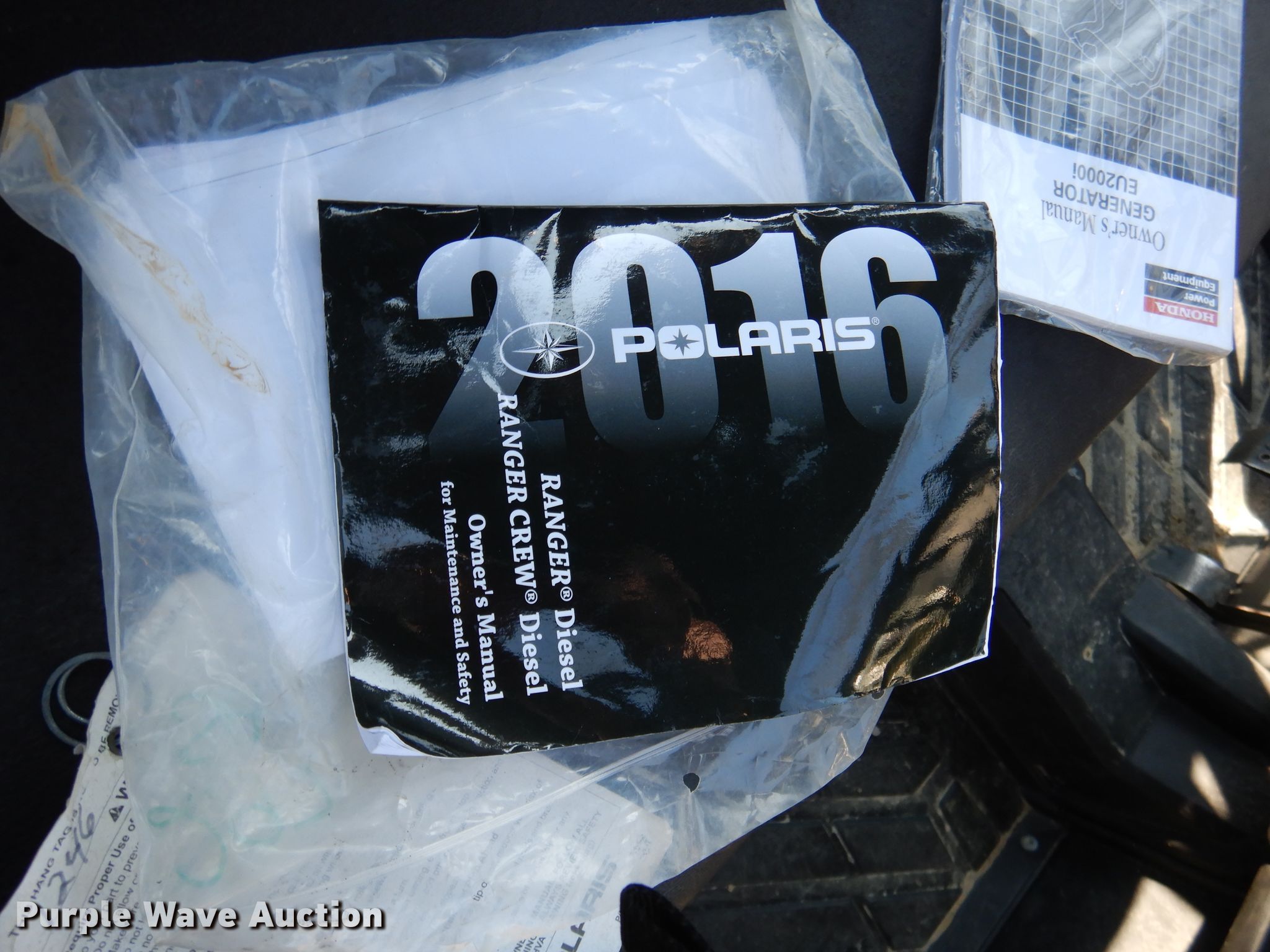 2016 Polaris Ranger 1000 utility vehicle. 2,225 miles on odometer, 390 hours on meter, Kohler 1,028cc three cylinder diesel engine 26 HP, Automatic transmission, Four wheel drive, ROPS canopy, Three passenger capacity, Grill guard, Manual dump bed, Receiver hitch, 25-10-12 front tires, 26-11-12 rear tires. Transfer of ownership documentation will be a bill of sale. 4XARTAD16GT131246. Black and Veatch. Centerview, MO 64018