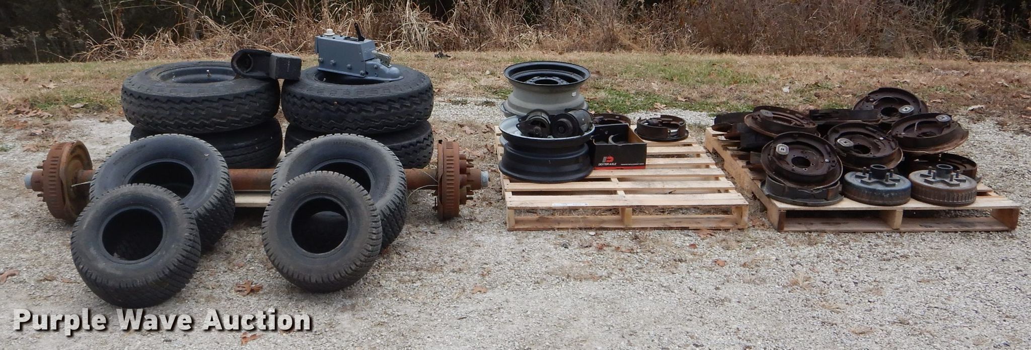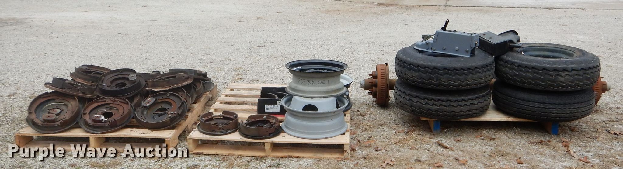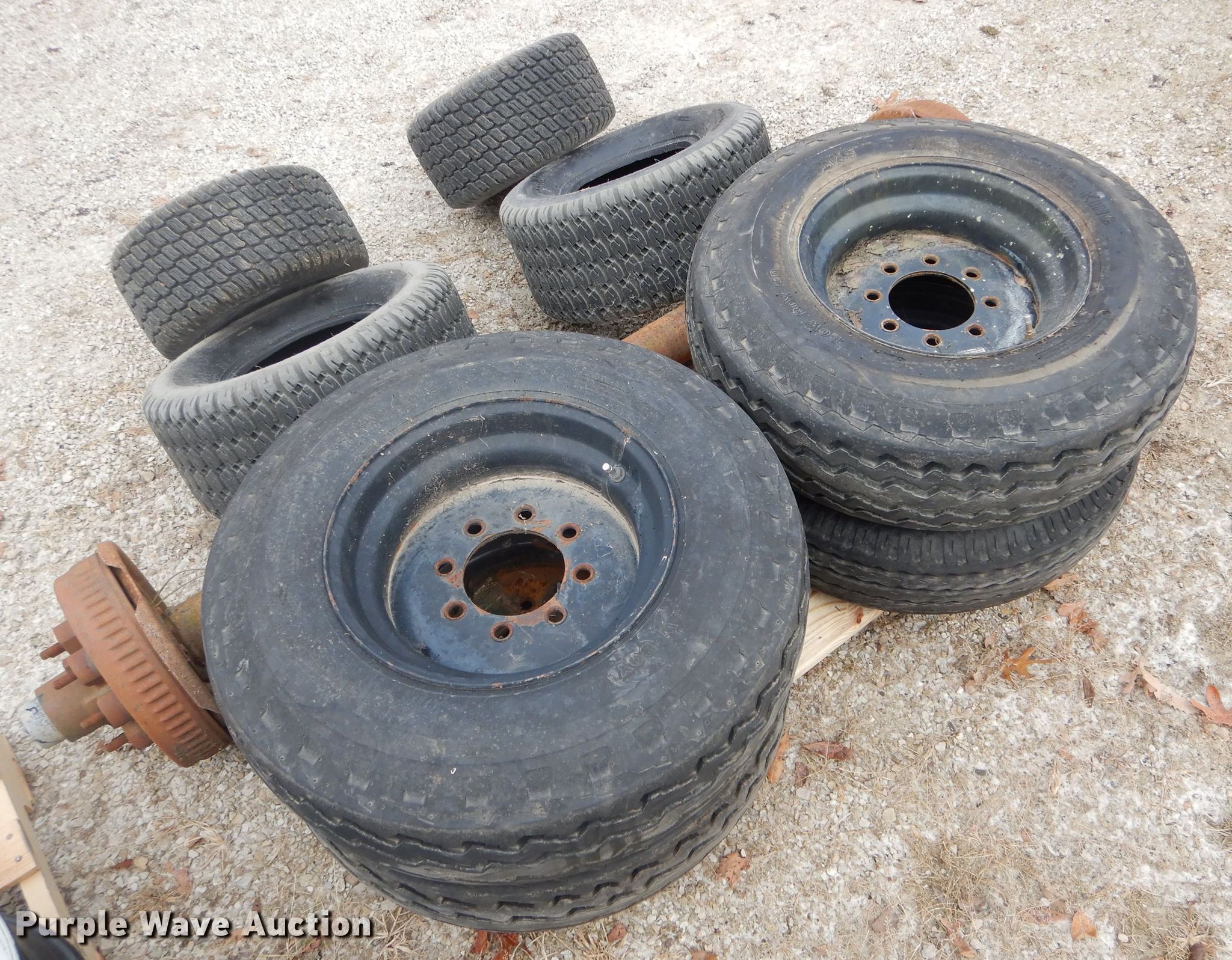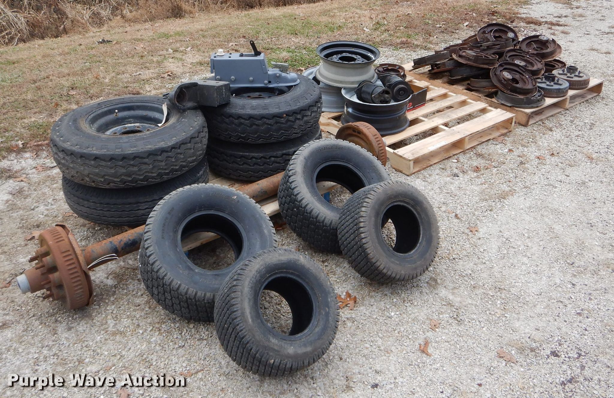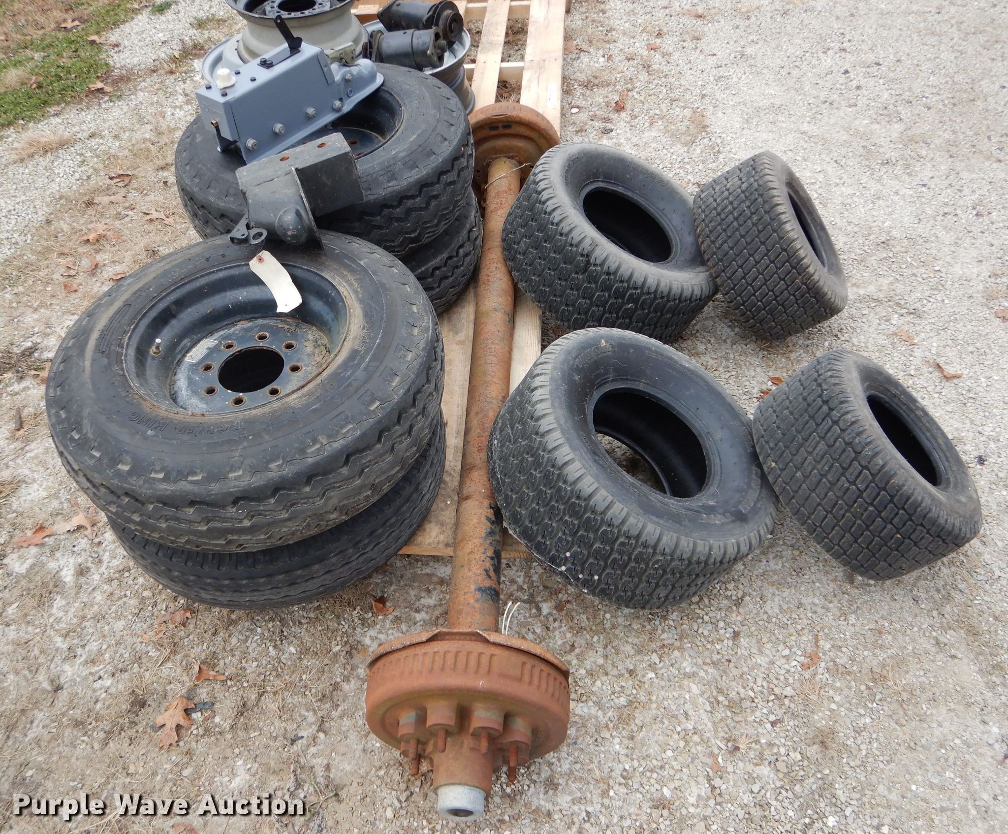 Purple Wave is selling a used Automotive Parts or Acces. in Missouri. This item is a Automotive parts with the following: 77"L axle, Eight bolt wheels, (4) 8-14.5 tires, (2) 22 x 9.50-10 tires, (2) 18 x 8.50-8 tires, (2) ball hitches, Brake fluid tank, Brake pads