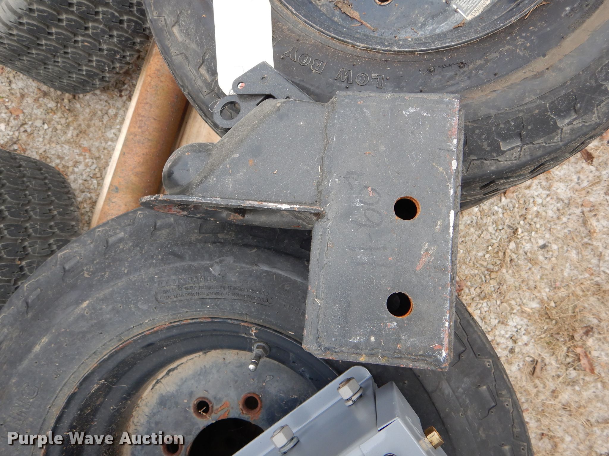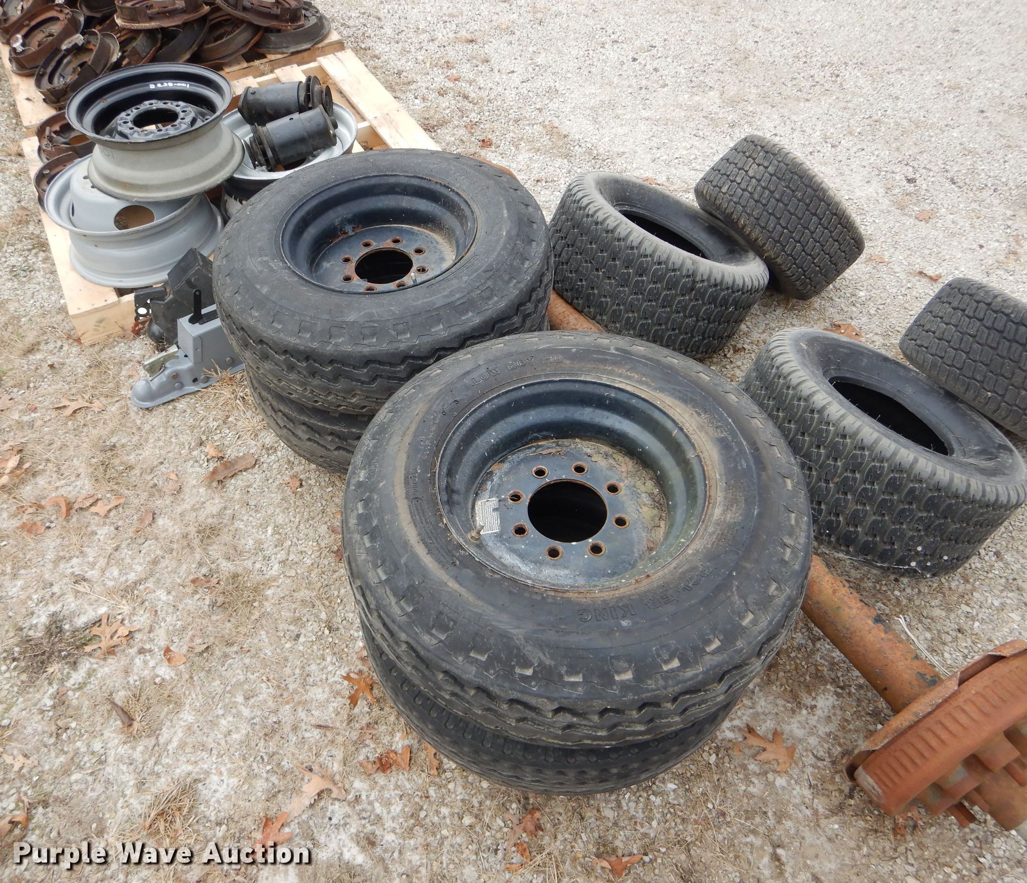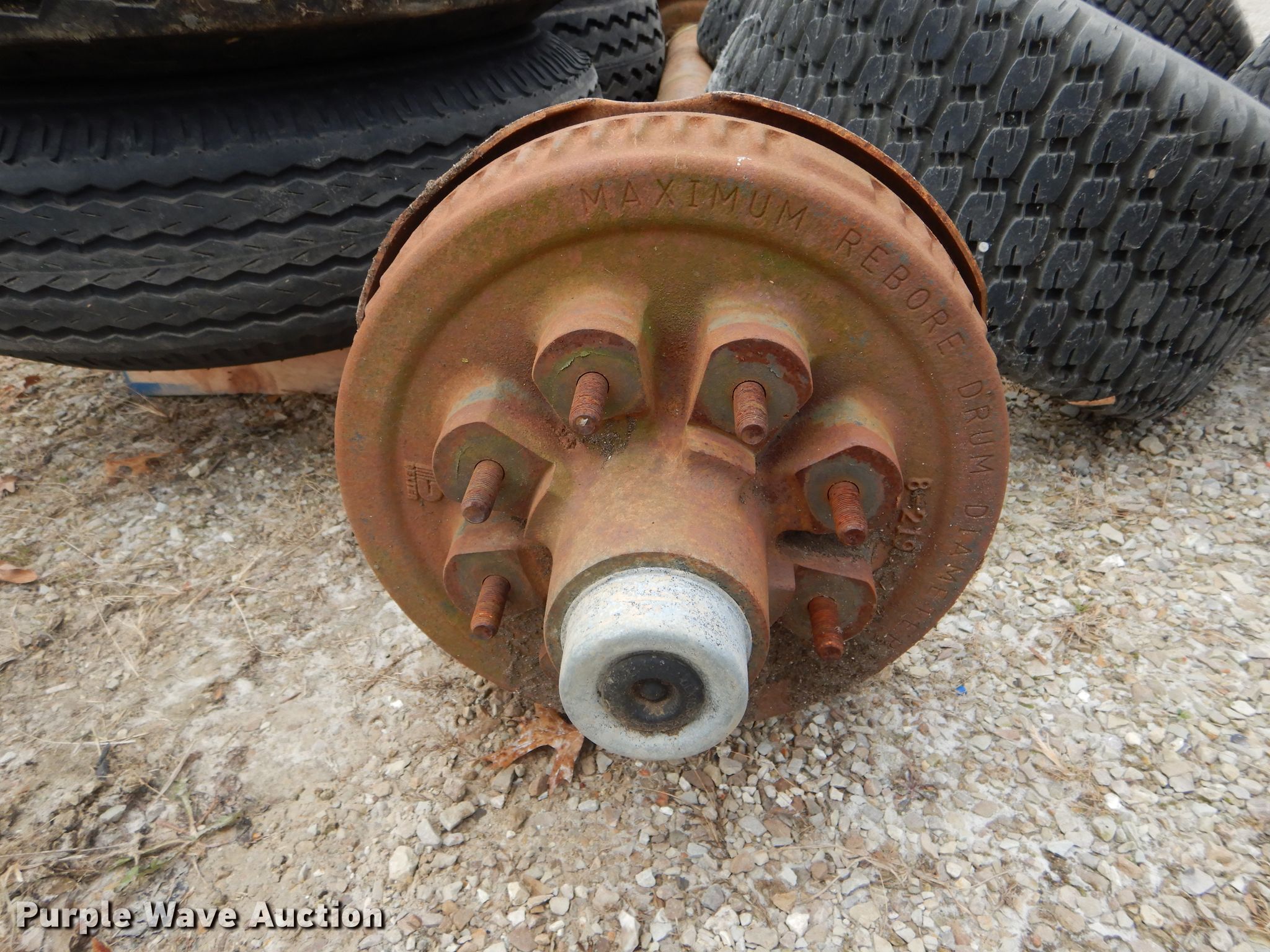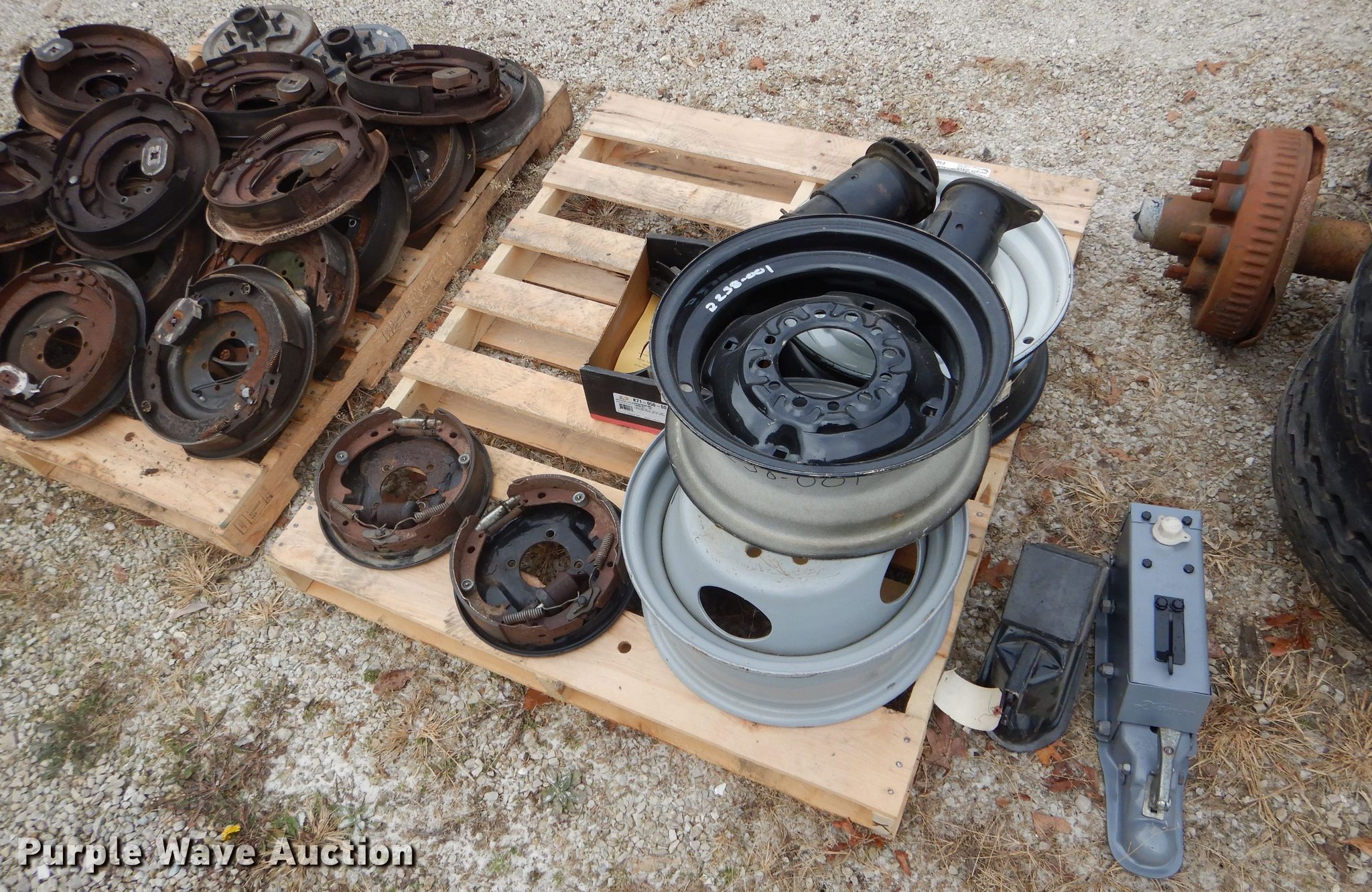 Purple Wave is selling a used Automotive Parts or Acces. in Missouri. This item is a Automotive parts with the following: 77"L axle, Eight bolt wheels, (4) 8-14.5 tires, (2) 22 x 9.50-10 tires, (2) 18 x 8.50-8 tires, (2) ball hitches, Brake fluid tank, Brake pads