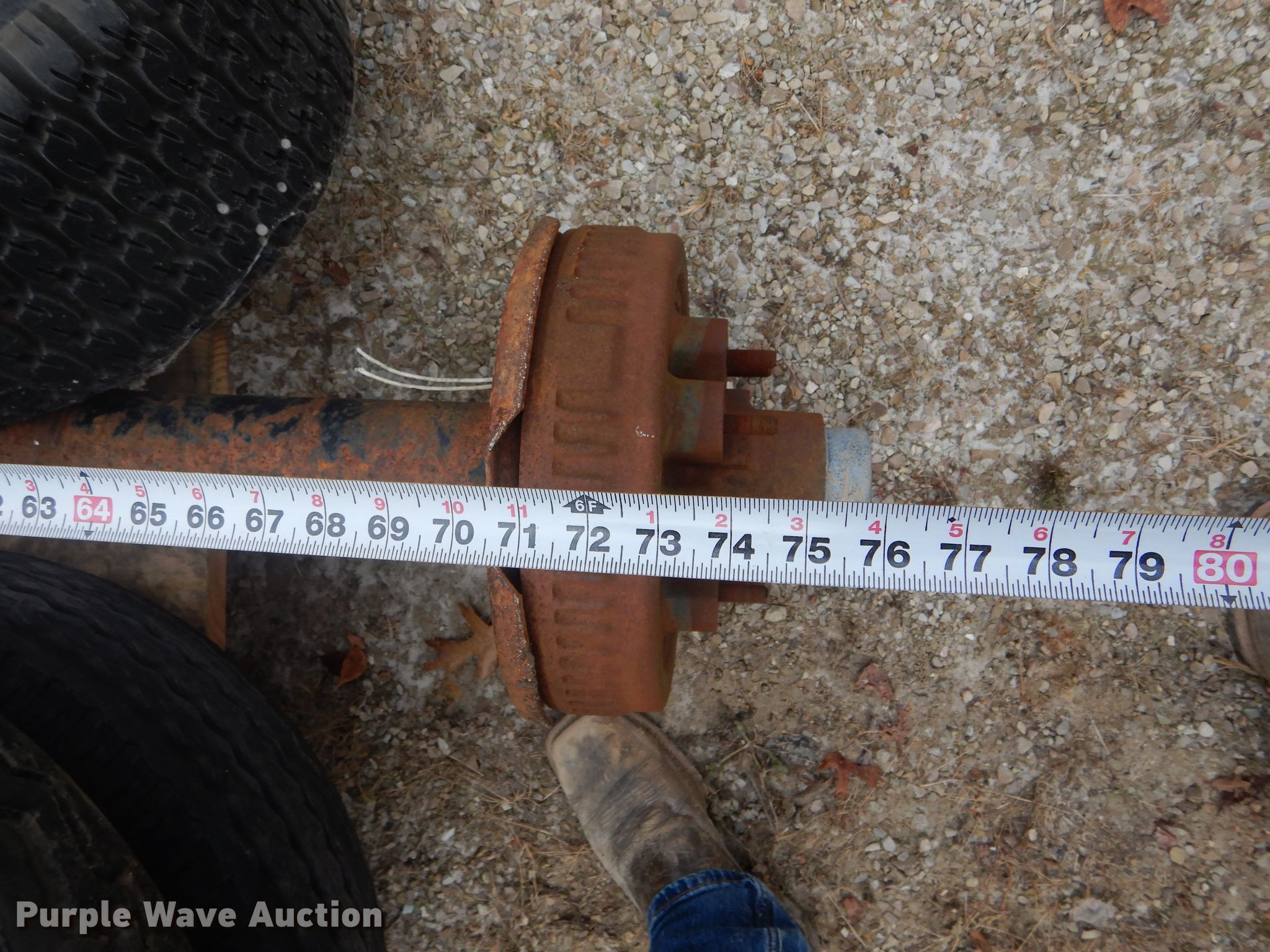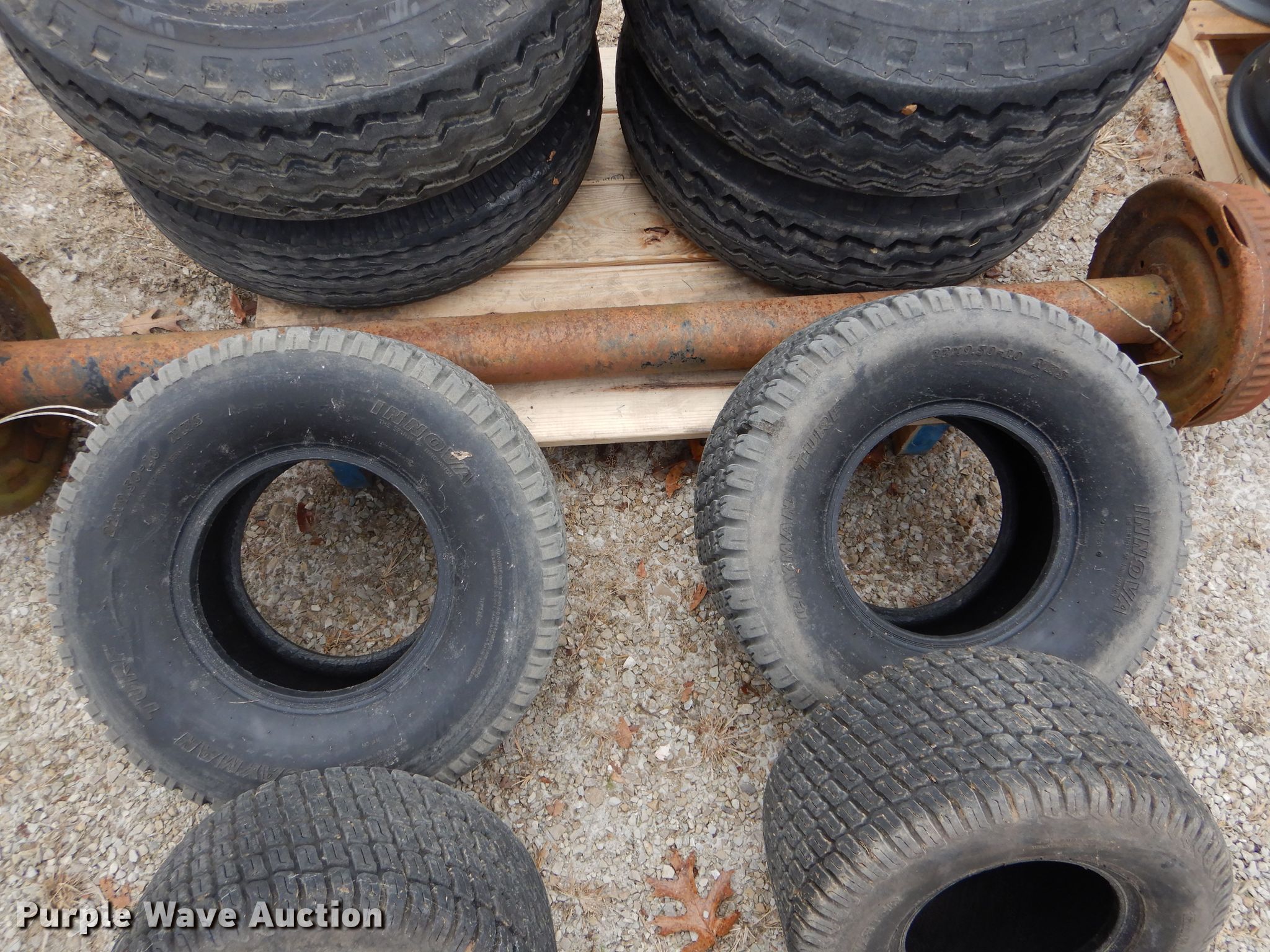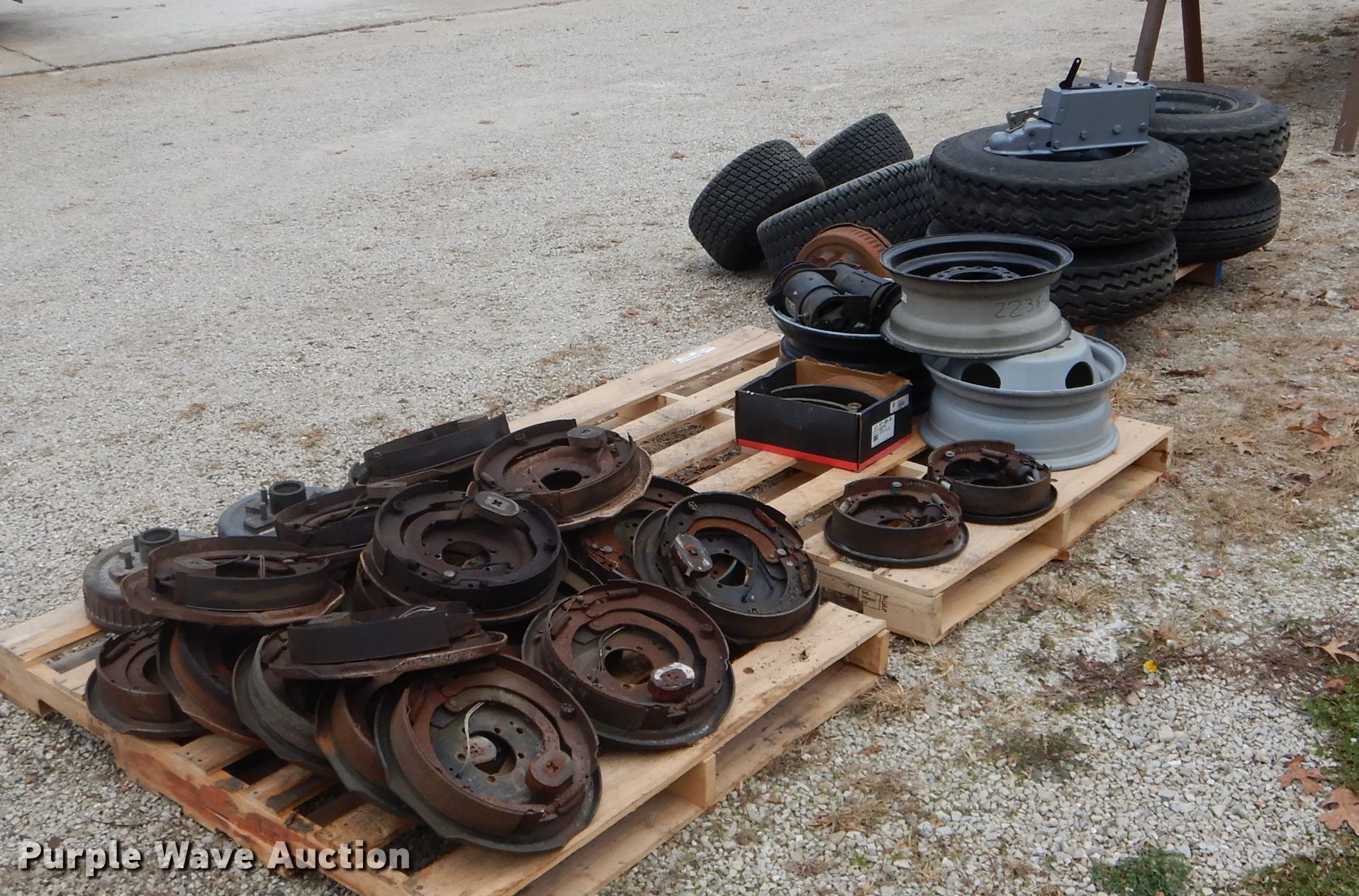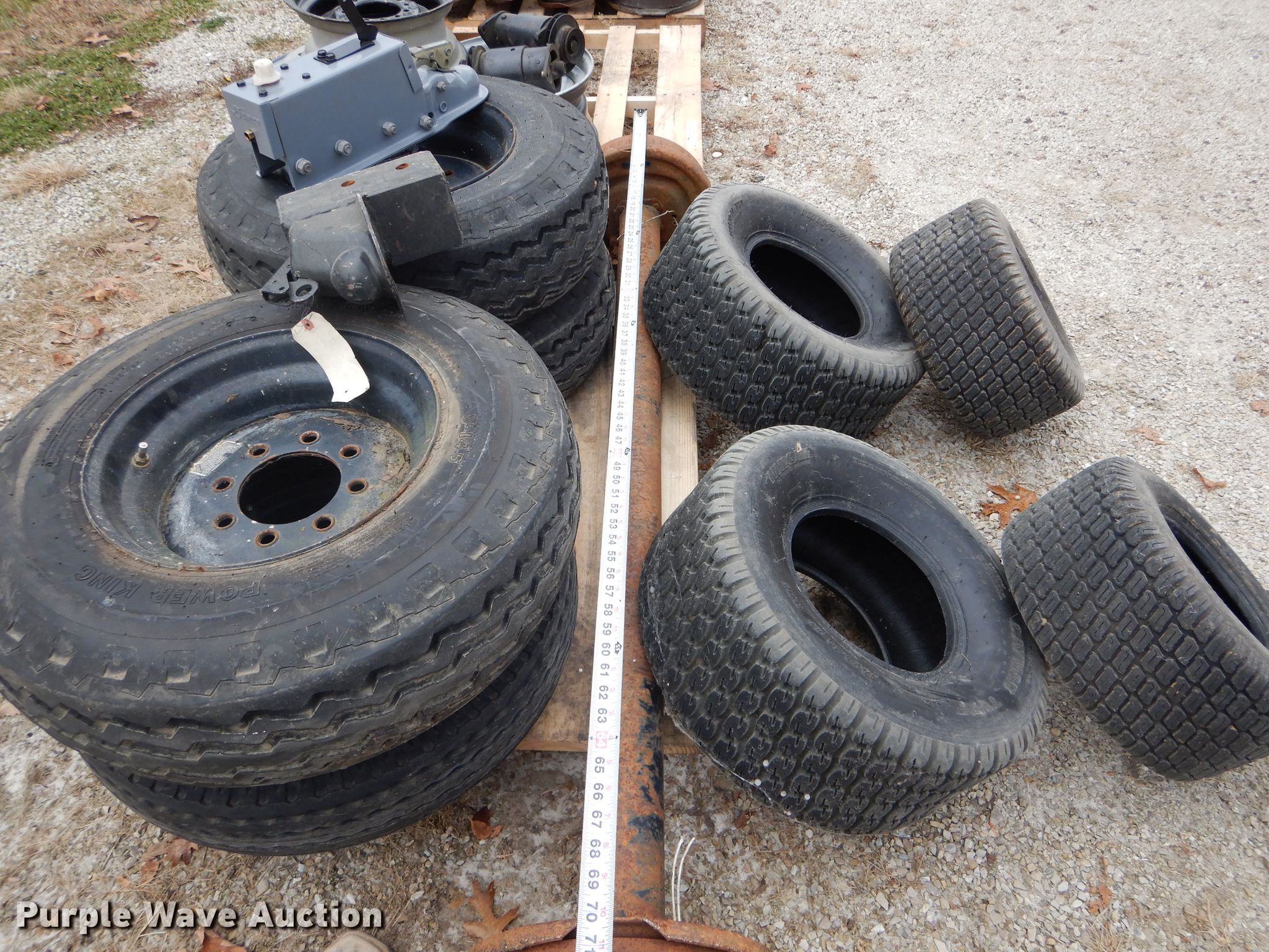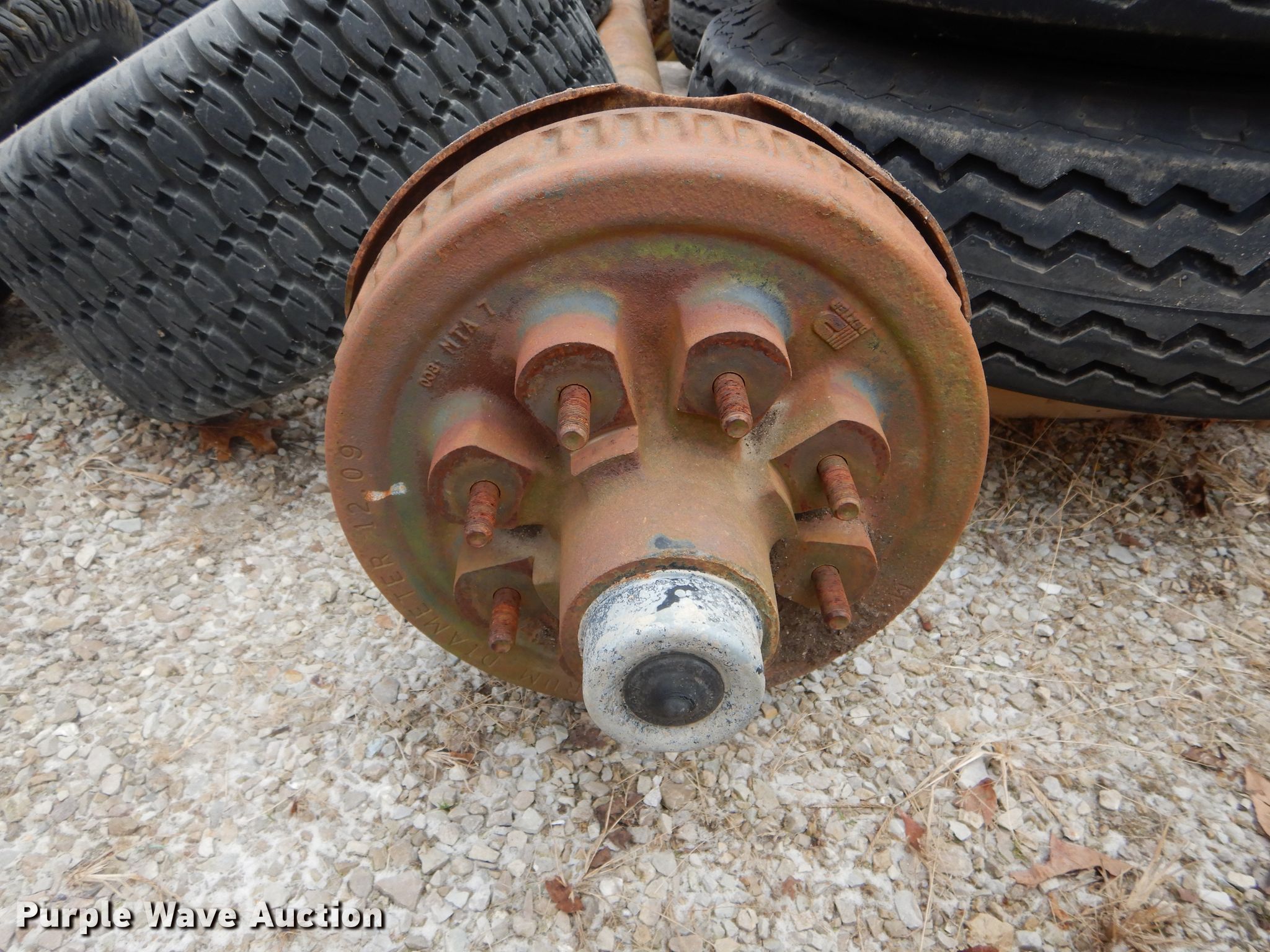 Purple Wave is selling a used Automotive Parts or Acces. in Missouri. This item is a Automotive parts with the following: 77"L axle, Eight bolt wheels, (4) 8-14.5 tires, (2) 22 x 9.50-10 tires, (2) 18 x 8.50-8 tires, (2) ball hitches, Brake fluid tank, Brake pads