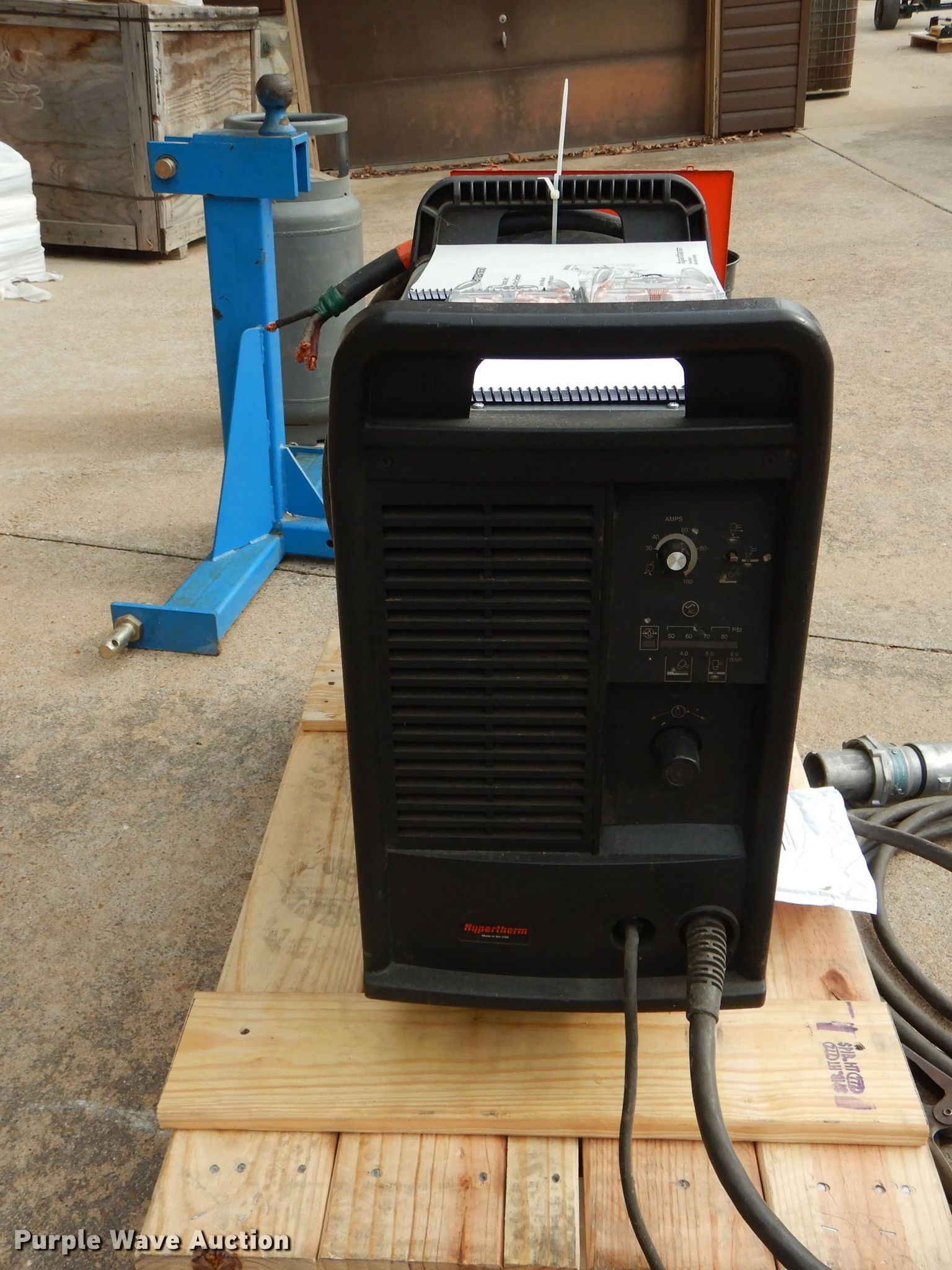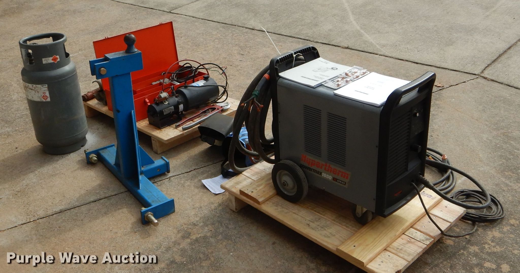 Purple Wave is selling a used Tools in Missouri. This item is a Hypertherm Powermax 1650 plasma cutter with the following: 240V, Tips, (2) welding helmets, Pipe cutter, Three point attachment, Type 30 propane tank, Serial 253735, Monarch M303-0383 hydraulic pump, Torna 765 hammer drill, 115V, Bits, Serial 1650-007118