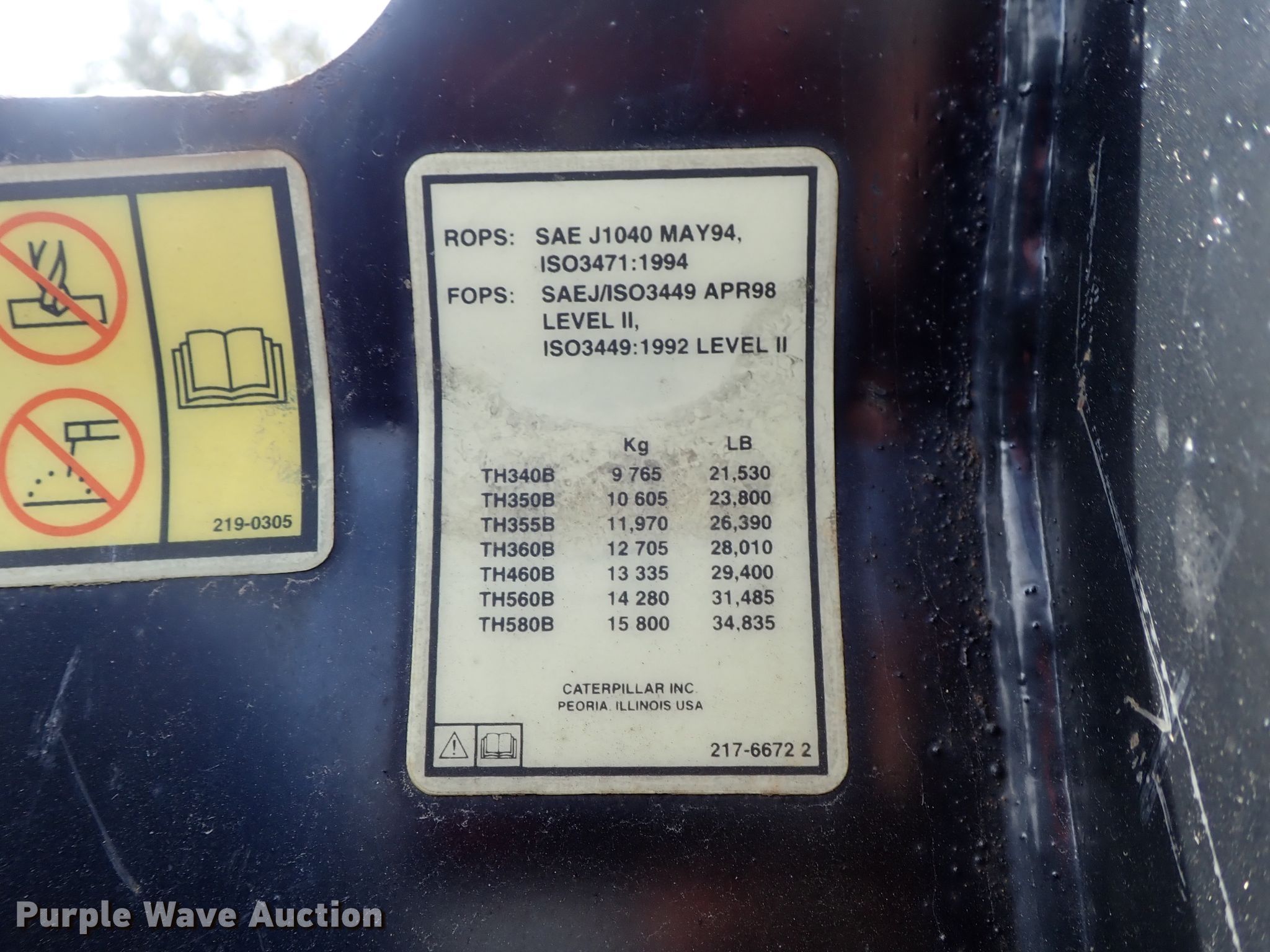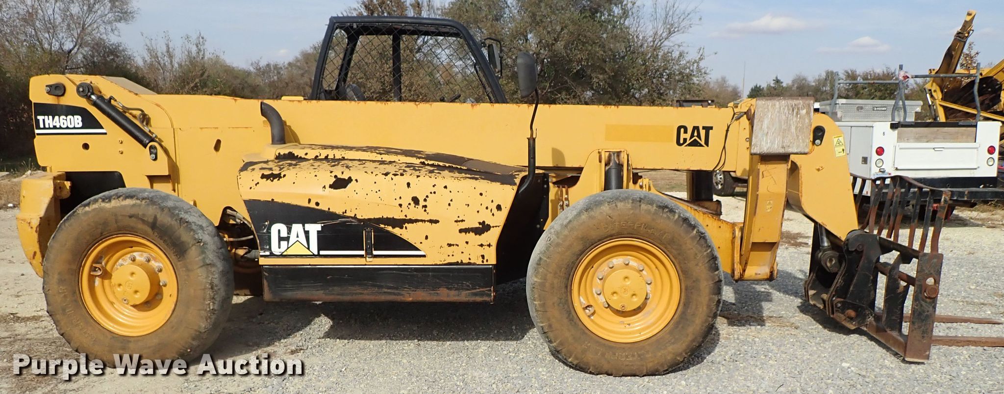 Purple Wave is selling a used Telehandler in Kansas. This item is a 2005 Caterpillar TH460B telehandler with the following: 3,740 hours on meter, Caterpillar four cylinder diesel engine, Powershift transmission, 4F-4R gears, Four wheel drive, Crab steer, Four wheel steer, OROPS, 8,800 lbs maximum lift capacity, 44' maximum lift height, Three stage boom, 48"L forks, Tilt carriage, Manual quick attach, Hydraulic outriggers, 14.00-24 front tire, 17.5-25 front tire, 14.00-24 rear tires, Serial CATTH460CSLF01717