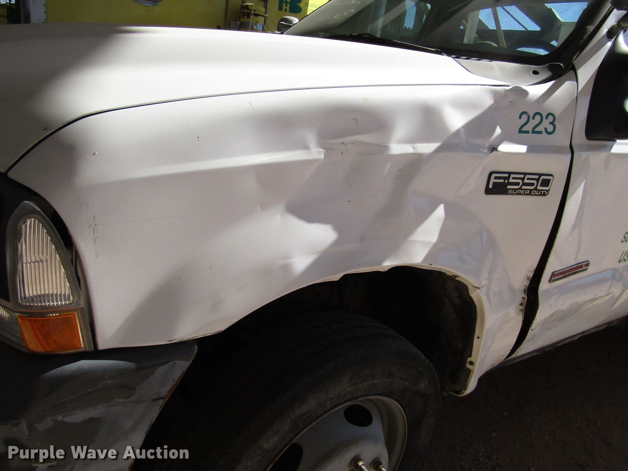 Purple Wave is selling a used Bucket Truck in New Mexico. This item is a 2004 Ford F550 Super Duty bucket truck with the following: Unknown miles on odometer, 6.0L V8 OHV 32V diesel engine, Automatic transmission, Single axle, AC and heat, Auxiliary controls, PTO, ETI utility bed, 11'2"L, Serial 89181, ETI ETC37IH articulating telescopic boom, 350 lbs maximum lift capacity, 37' maximum lift height, Man basket, Platform and ground controls, Serial 0304C72958, Spring suspension, Hydraulic brakes, 140" wheelbase, 225/70R19.5 tires, GVWR 17,500 lbs, Battery dead, Brake system issue, Brakes locked up, Contents not included, Unknown operating condition, Vehicle must be towed or hauled, Unit# 223